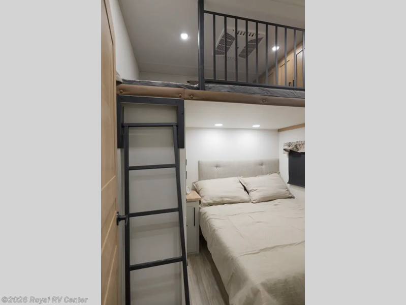 This fifth wheel is perfect for those whole like to camp with a whole group, whether it be with family or friends! There is a rear private suite with a lower RV queen bed and loft bed, a half bath, and your own private entrance. The front private bedroom includes a king bed slide out with a large front wardrobe, a dresser, and washer/dryer prep. And the spacious full bath is close by for easy nighttime use. Everyone can meet in the main living area that includes dual opposing slides, a tri-fold sofa and a booth dinette, plus a 50" TV for movie night. There is also a coffee bar here where you can set up your Keurig machine, a pantry for snacks, and a ceiling fan to keep the air moving. You will also love the exterior cooktop for breakfast outdoors, and the two power awnings with LED lights will provide shade during the day and ambience at night!