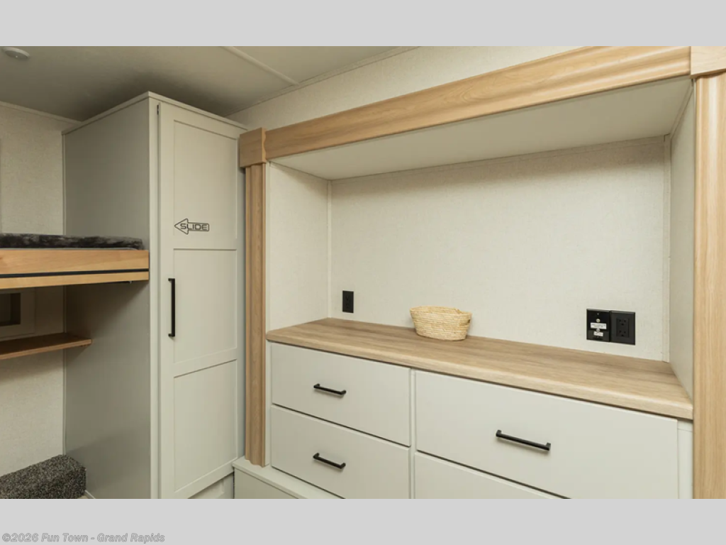 This Sierra fifth wheel is thoughtfully designed for comfort and convenience, starting with a spacious front bunkhouse perfect for accommodating guests. It features two flip-up bunks, 28" x 74" and 32" x 74" and a 60" x 74" fold-out lounge, along with a wardrobe, dresser, and additional storage to keep essentials organized. A nearby half bath adds easy access and extra convenience. At the center of the unit, the kitchen offers everything you need to prepare meals, including a stainless-steel sink, three-burner cooktop, and a generous 16 cu. ft. refrigerator. Meals can be enjoyed at the free-standing dinette, or you can unwind on the sectional sofa while enjoying the fireplace or entertainment center. At the rear, you'll find the private main bedroom with a roomy 66" x 80" RV king bed, plus its own wardrobe and dresser. Just steps away is the full bathroom featuring a one-piece fiberglass shower, sink with medicine cabinet, linen storage, and even washer/dryer prep for extended stays.