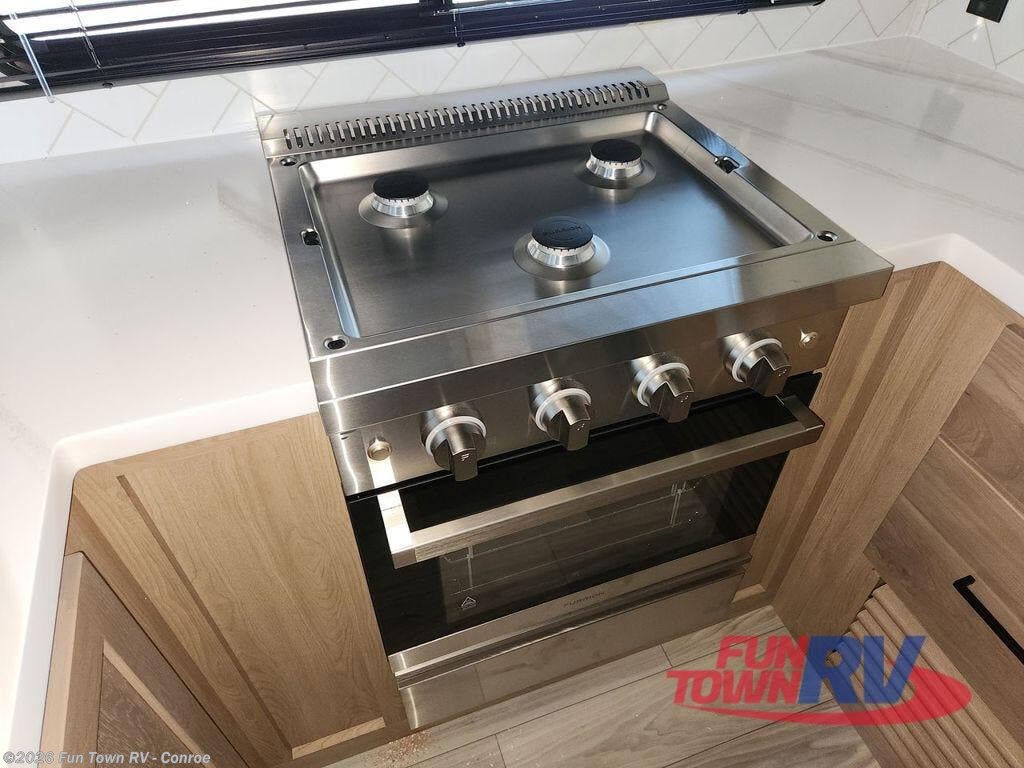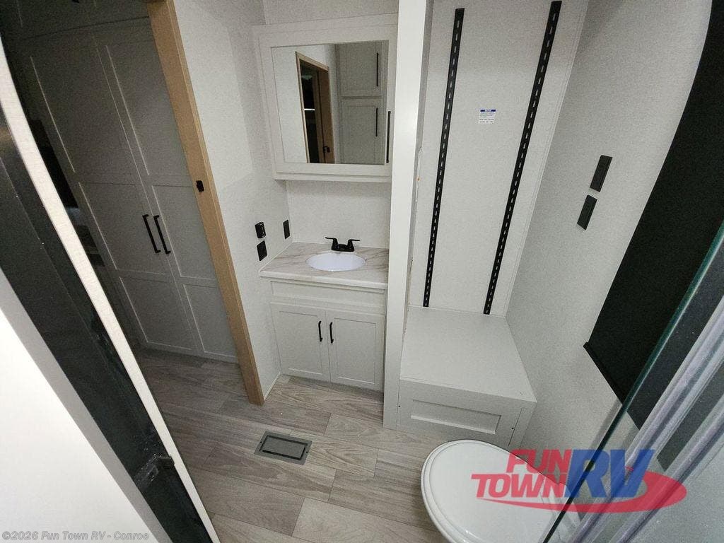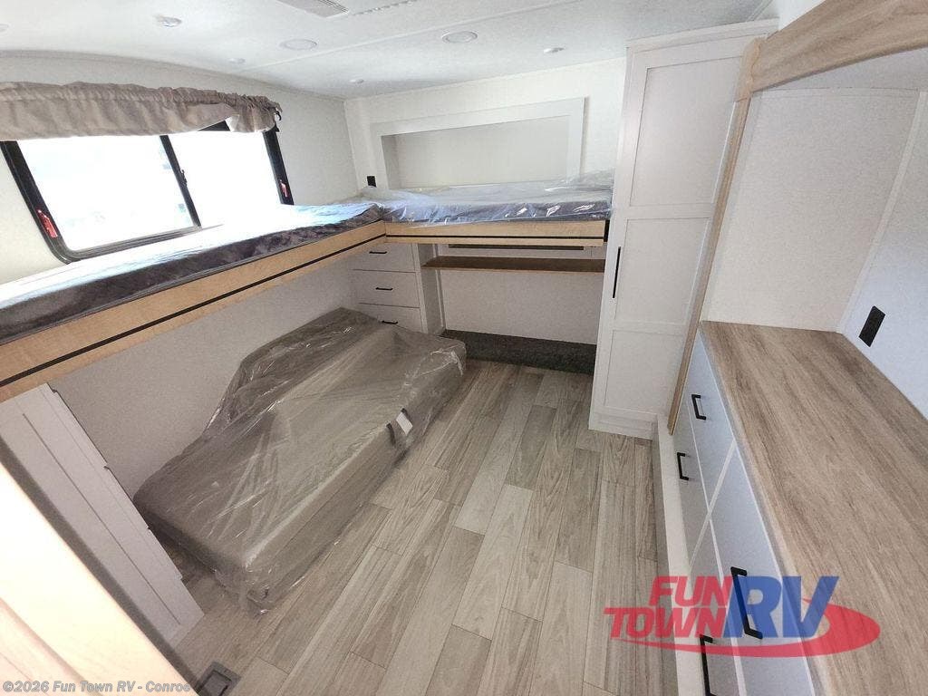 This Sierra fifth wheel is thoughtfully designed for comfort and convenience, starting with a spacious front bunkhouse perfect for accommodating guests. It features two flip-up bunks, 28" x 74" and 32" x 74" and a 60" x 74" fold-out lounge, along with a wardrobe, dresser, and additional storage to keep essentials organized. A nearby half bath adds easy access and extra convenience. At the center of the unit, the kitchen offers everything you need to prepare meals, including a stainless-steel sink, three-burner cooktop, and a generous 16 cu. ft. refrigerator. Meals can be enjoyed at the free-standing dinette, or you can unwind on the sectional sofa while enjoying the fireplace or entertainment center. At the rear, you'll find the private main bedroom with a roomy 66" x 80" RV king bed, plus its own wardrobe and dresser. Just steps away is the full bathroom featuring a one-piece fiberglass shower, sink with medicine cabinet, linen storage, and even washer/dryer prep for extended stays.