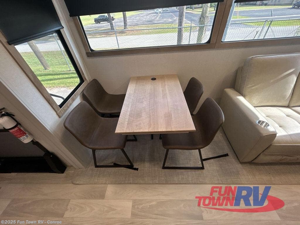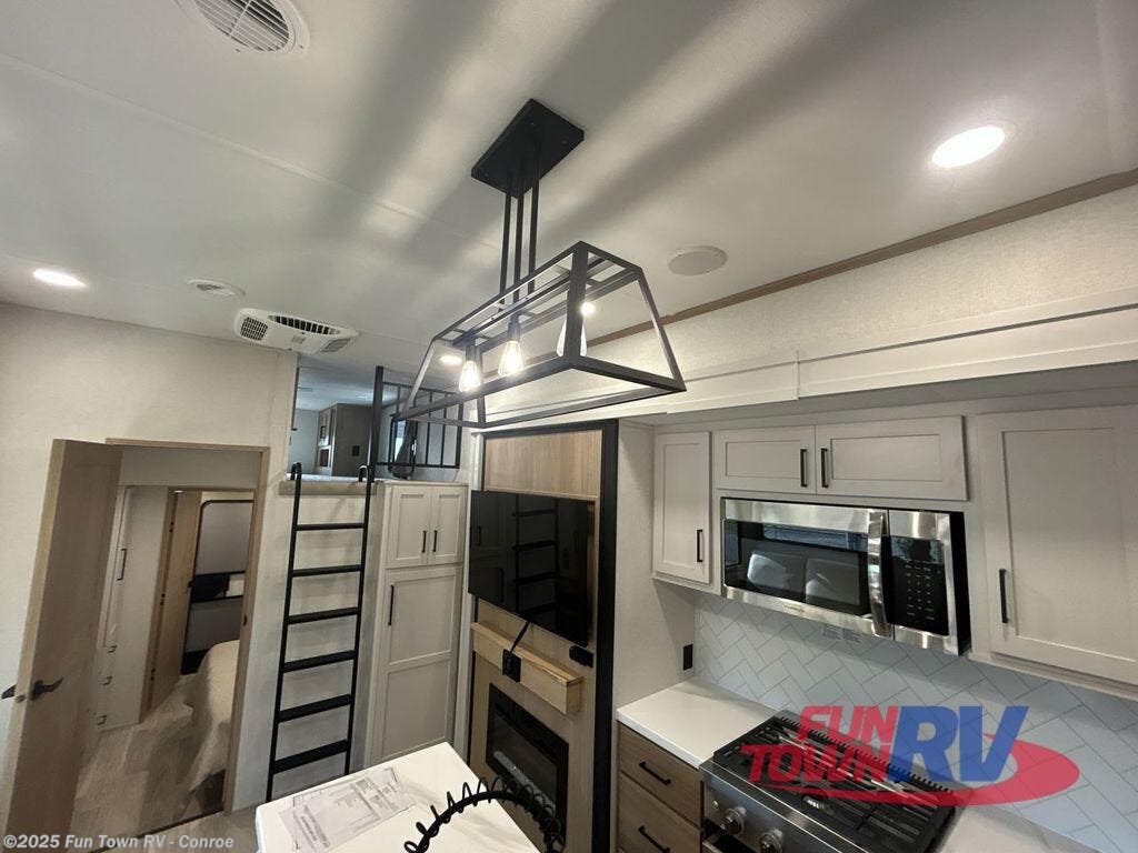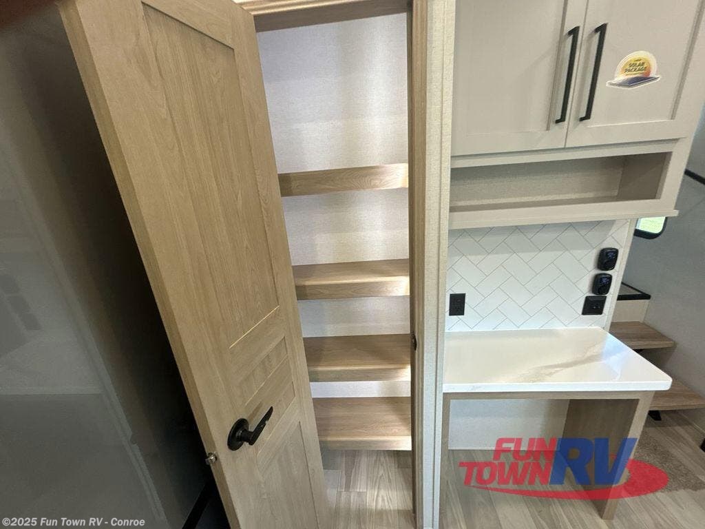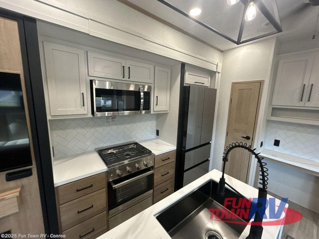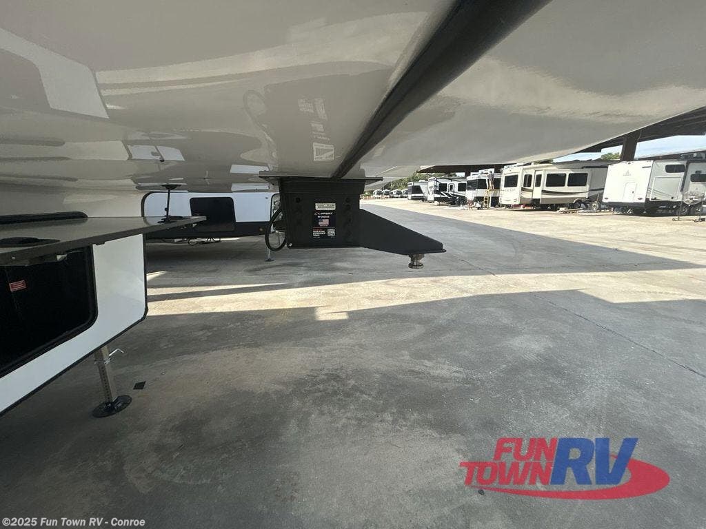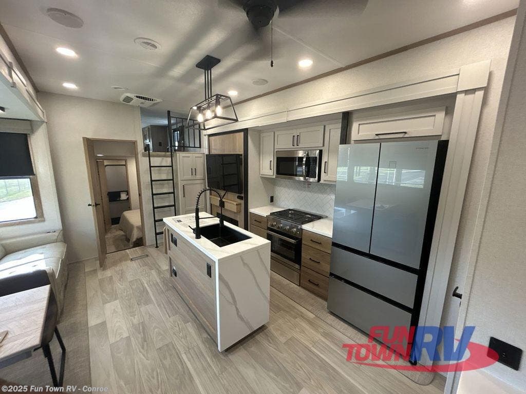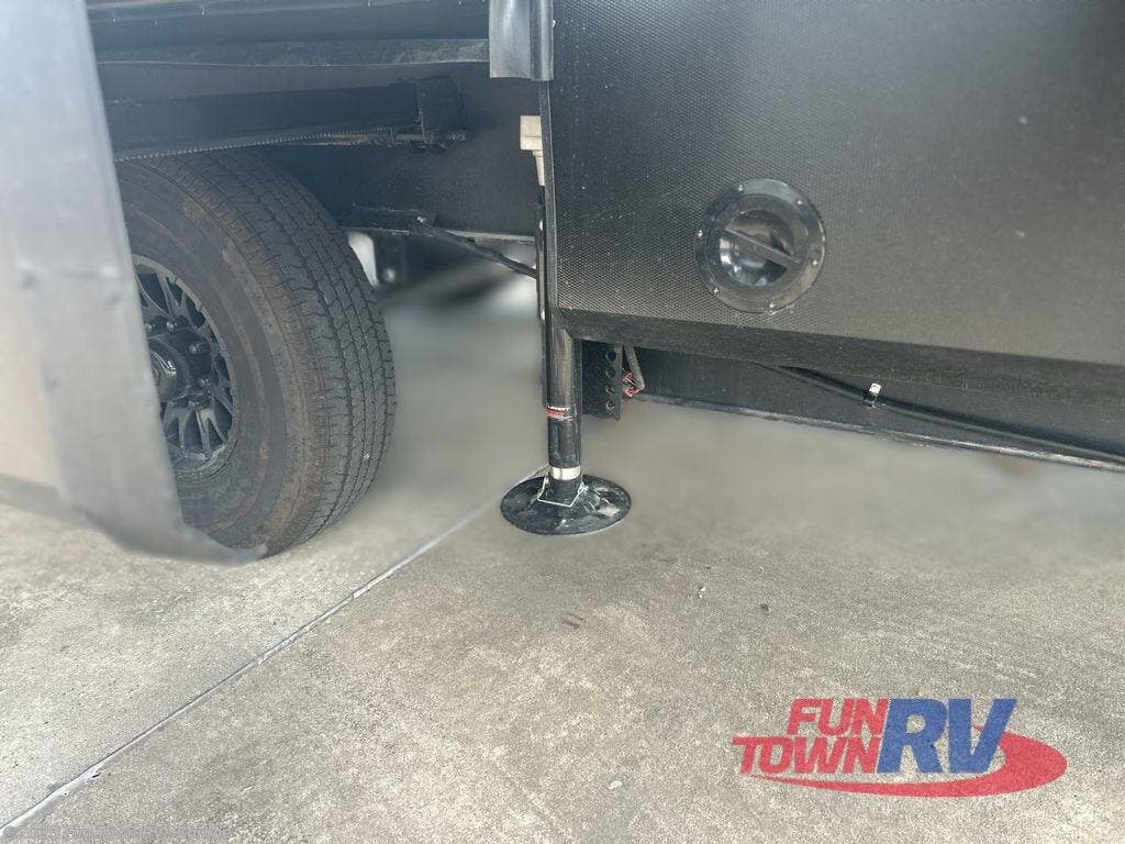 If you're looking to go full-time RVing, this fifth wheel is packed with convenient features! The master bedroom includes a king bed slide out with USB ports on either side of the bed so you both can charge your phones, and there is a dresser for your folded clothes. You will love the front bathroom with dual bath sinks, a shower with a seat, plus a walk-in closet with shelves, rods to hand clothes, and baskets for laundry! There is a unique middle utility room with washer and dryer, Washer and dryer counter and a rod to hang clothes that will make a perfect laundry room, or you can utilize this space for storage! Head to the main living area to relax on the theater seating or hide-a-bed sofa, and if you have guests stay over, they can sleep here. There is also an entertainment center with a 50" flat screen TV, but you might just leave that off if you're working at the desk with a chair that is provided. We've saved the best part for last; the kitchen! Here, you'll find ample counter space to prep home-cooked meals, a three burner high output range with a 22" oven, plus a large counter with barstools where you can enjoy breakfast at each morning. Choosing this fifth wheel is a no-brainer!