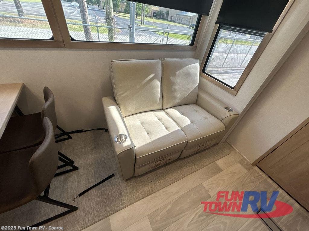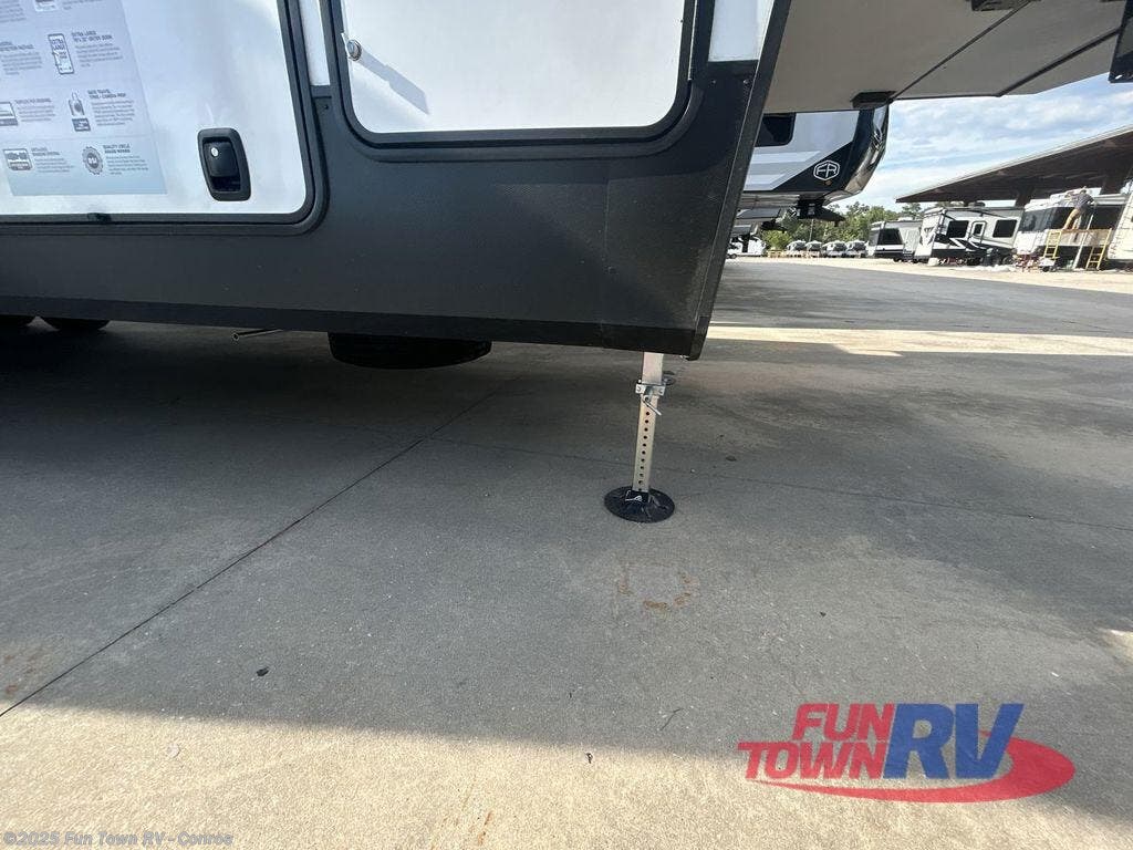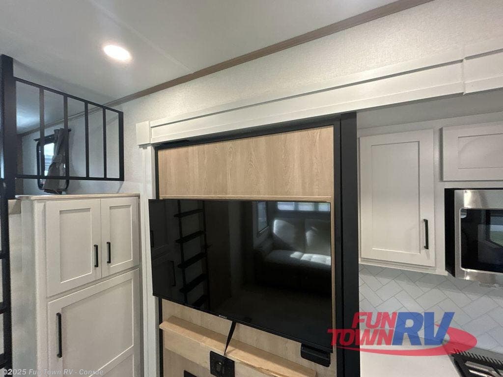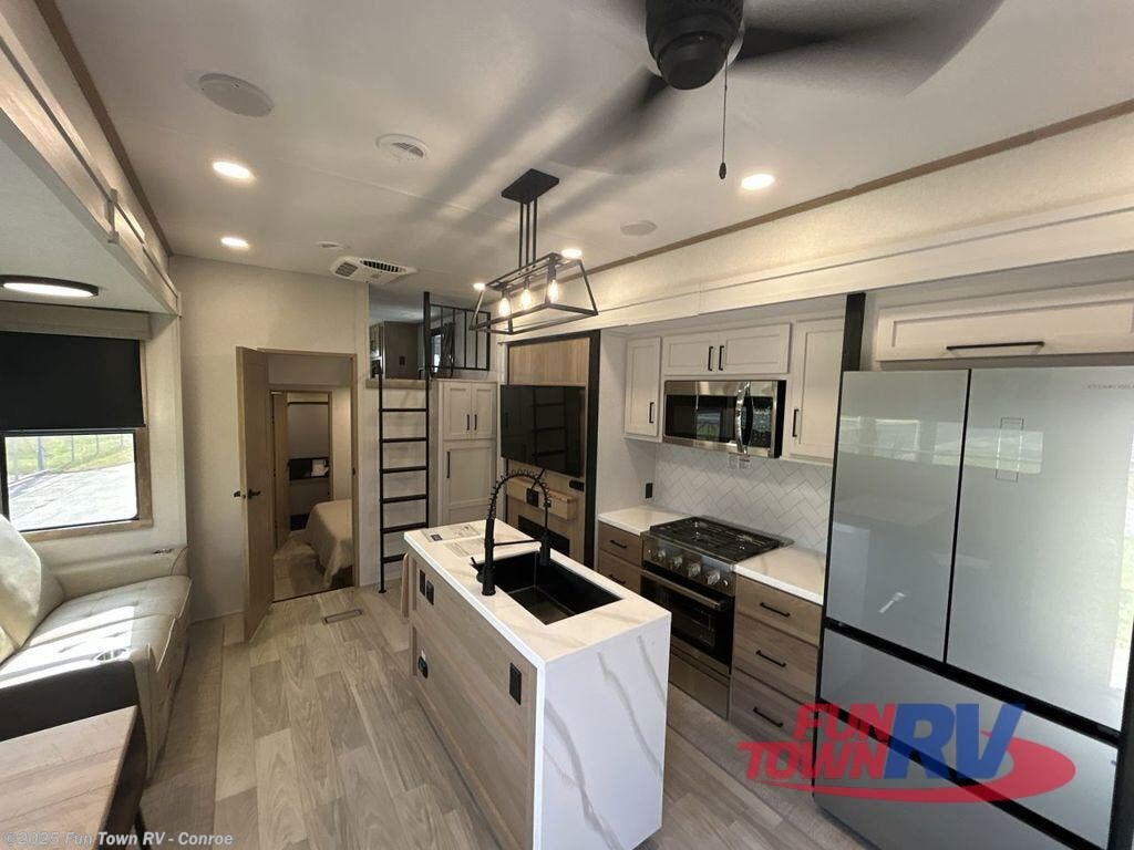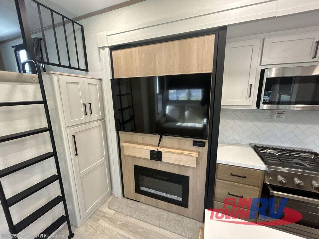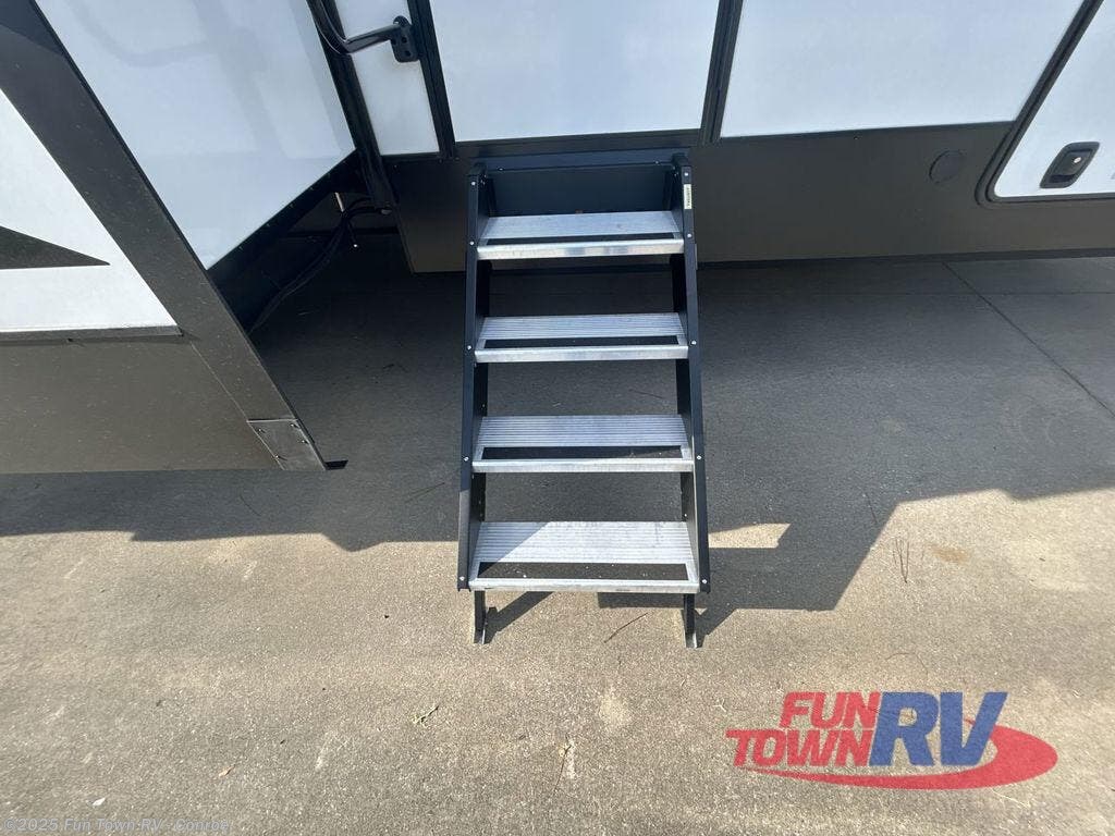 If you're looking to go full-time RVing, this fifth wheel is packed with convenient features! The master bedroom includes a king bed slide out with USB ports on either side of the bed so you both can charge your phones, and there is a dresser for your folded clothes. You will love the front bathroom with dual bath sinks, a shower with a seat, plus a walk-in closet with shelves, rods to hand clothes, and baskets for laundry! There is a unique middle utility room with washer and dryer, Washer and dryer counter and a rod to hang clothes that will make a perfect laundry room, or you can utilize this space for storage! Head to the main living area to relax on the theater seating or hide-a-bed sofa, and if you have guests stay over, they can sleep here. There is also an entertainment center with a 50" flat screen TV, but you might just leave that off if you're working at the desk with a chair that is provided. We've saved the best part for last; the kitchen! Here, you'll find ample counter space to prep home-cooked meals, a three burner high output range with a 22" oven, plus a large counter with barstools where you can enjoy breakfast at each morning. Choosing this fifth wheel is a no-brainer!