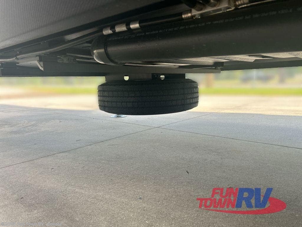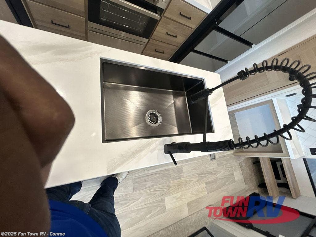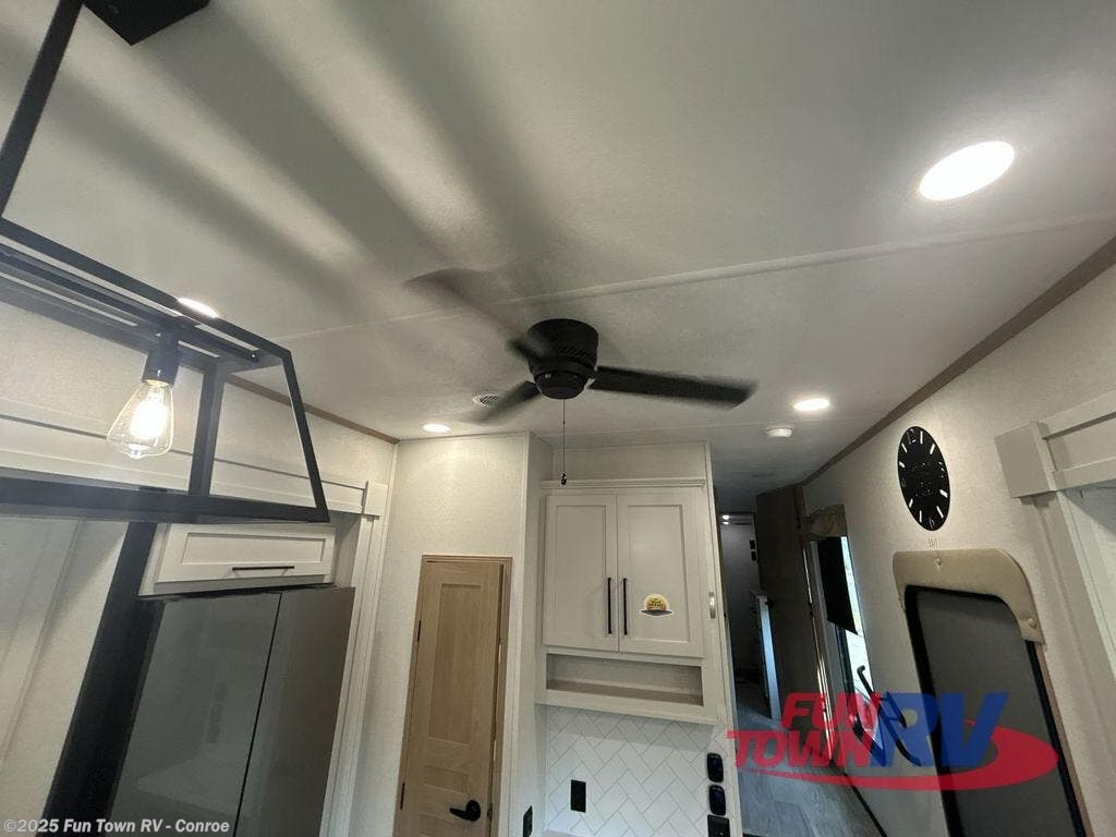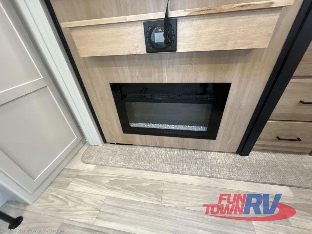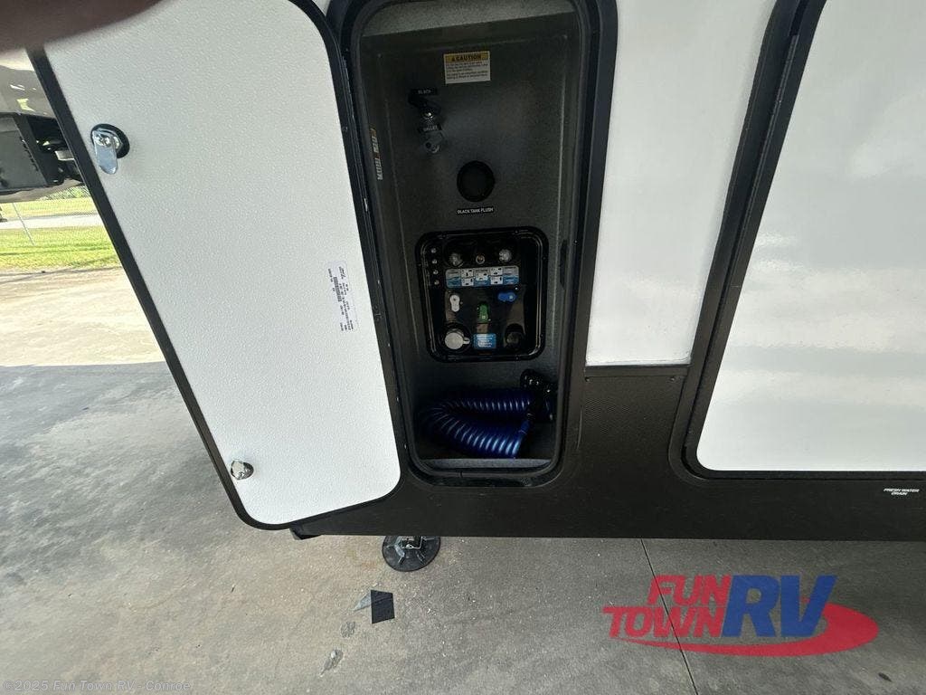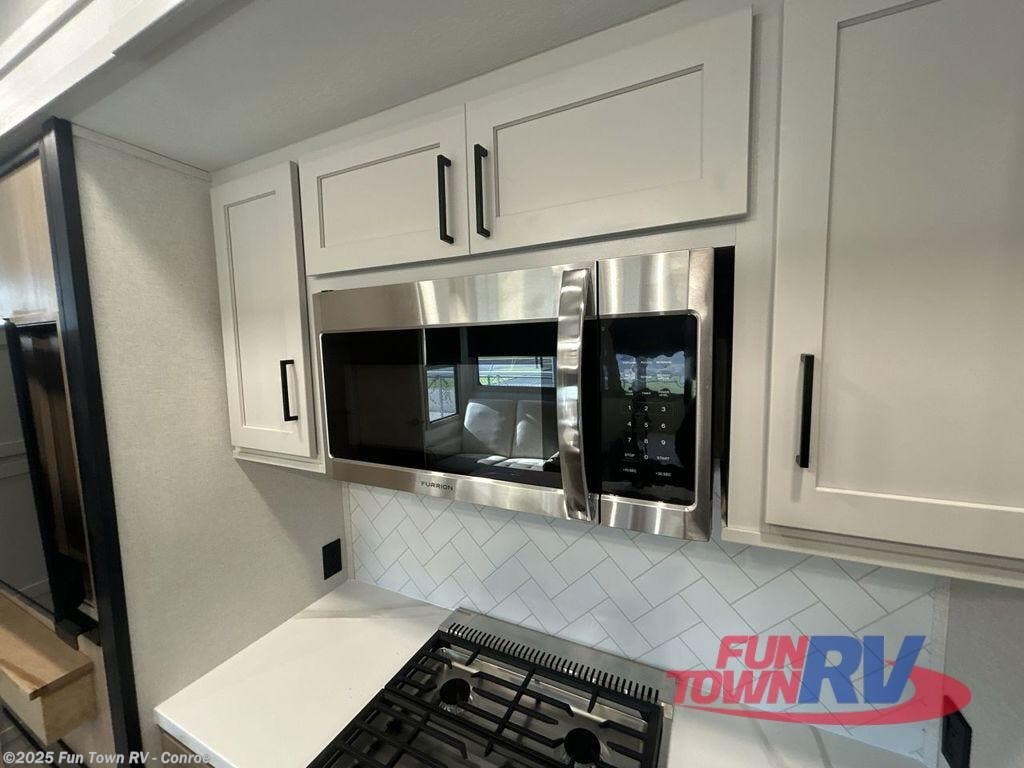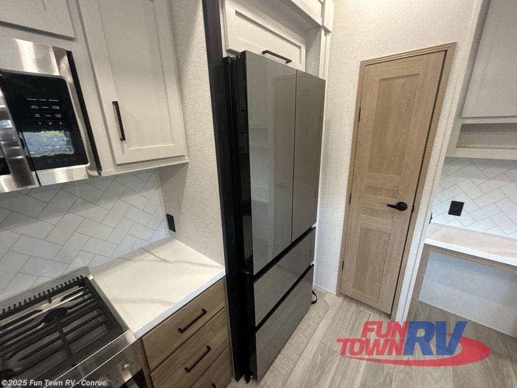 If you're looking to go full-time RVing, this fifth wheel is packed with convenient features! The master bedroom includes a king bed slide out with USB ports on either side of the bed so you both can charge your phones, and there is a dresser for your folded clothes. You will love the front bathroom with dual bath sinks, a shower with a seat, plus a walk-in closet with shelves, rods to hand clothes, and baskets for laundry! There is a unique middle utility room with washer and dryer, Washer and dryer counter and a rod to hang clothes that will make a perfect laundry room, or you can utilize this space for storage! Head to the main living area to relax on the theater seating or hide-a-bed sofa, and if you have guests stay over, they can sleep here. There is also an entertainment center with a 50" flat screen TV, but you might just leave that off if you're working at the desk with a chair that is provided. We've saved the best part for last; the kitchen! Here, you'll find ample counter space to prep home-cooked meals, a three burner high output range with a 22" oven, plus a large counter with barstools where you can enjoy breakfast at each morning. Choosing this fifth wheel is a no-brainer!