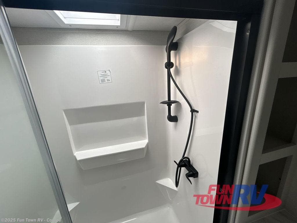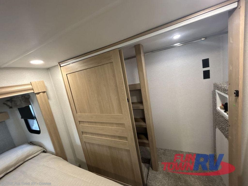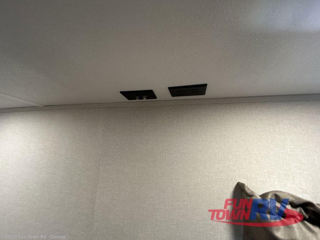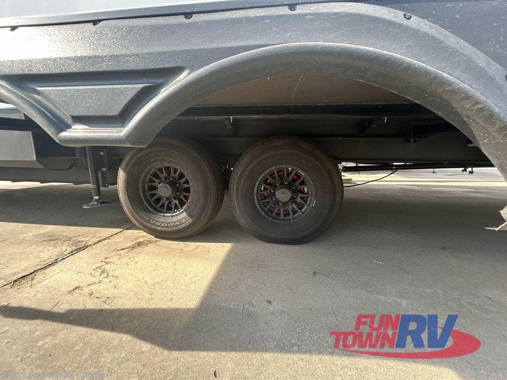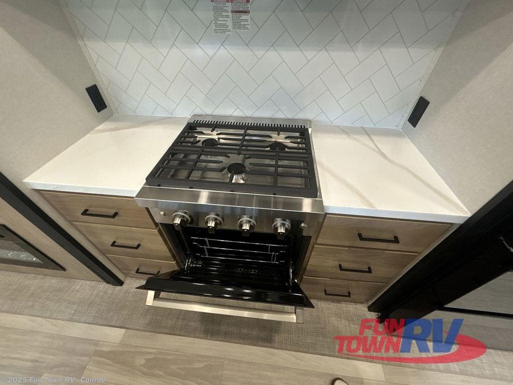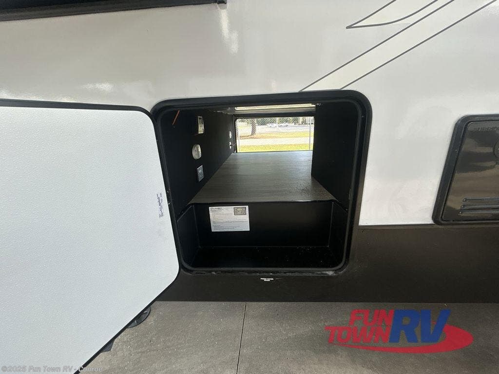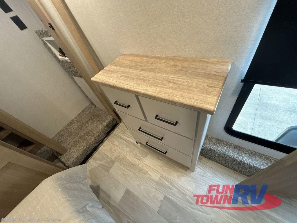If you're looking to go full-time RVing, this fifth wheel is packed with convenient features! The master bedroom includes a king bed slide out with USB ports on either side of the bed so you both can charge your phones, and there is a dresser for your folded clothes. You will love the front bathroom with dual bath sinks, a shower with a seat, plus a walk-in closet with shelves, rods to hand clothes, and baskets for laundry! There is a unique middle utility room with washer and dryer, Washer and dryer counter and a rod to hang clothes that will make a perfect laundry room, or you can utilize this space for storage! Head to the main living area to relax on the theater seating or hide-a-bed sofa, and if you have guests stay over, they can sleep here. There is also an entertainment center with a 50" flat screen TV, but you might just leave that off if you're working at the desk with a chair that is provided. We've saved the best part for last; the kitchen! Here, you'll find ample counter space to prep home-cooked meals, a three burner high output range with a 22" oven, plus a large counter with barstools where you can enjoy breakfast at each morning. Choosing this fifth wheel is a no-brainer!