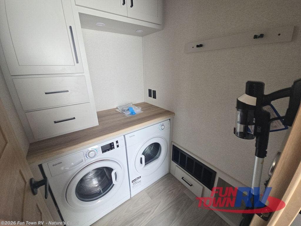 If you're looking to go full-time RVing, this fifth wheel is packed with convenient features! The master bedroom includes a king bed slide out with USB ports on either side of the bed so you both can charge your phones, and there is a dresser for your folded clothes. You will love the front bathroom with dual bath sinks, a shower with a seat, plus a walk-in closet with shelves, rods to hand clothes, and baskets for laundry! There is a unique middle utility room with washer and dryer, Washer and dryer counter and a rod to hang clothes that will make a perfect laundry room, or you can utilize this space for storage! Head to the main living area to relax on the theater seating or hide-a-bed sofa, and if you have guests stay over, they can sleep here. There is also an entertainment center with a 50" flat screen TV, but you might just leave that off if you're working at the desk with a chair that is provided. We've saved the best part for last; the kitchen! Here, you'll find ample counter space to prep home-cooked meals, a three burner high output range with a 22" oven, plus a large counter with barstools where you can enjoy breakfast at each morning. Choosing this fifth wheel is a no-brainer!