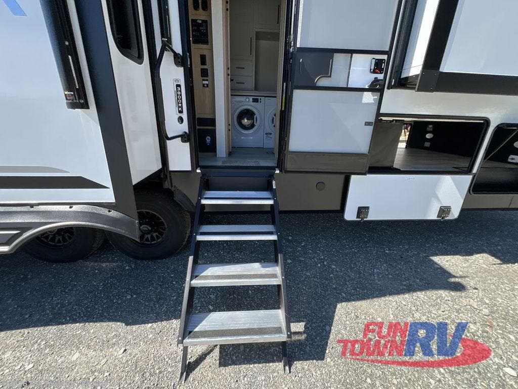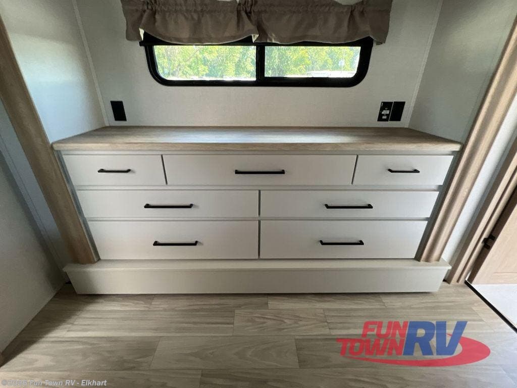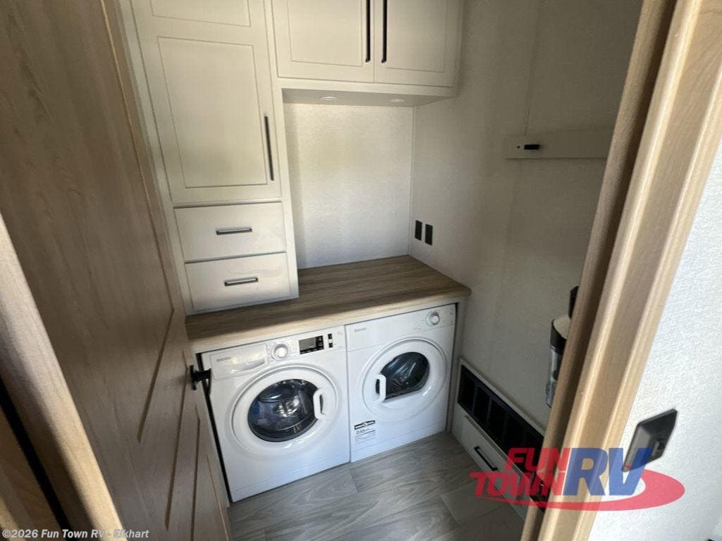 If you're looking to go full-time RVing, this fifth wheel is packed with convenient features! The master bedroom includes a king bed slide out with USB ports on either side of the bed so you both can charge your phones, and there is a dresser for your folded clothes. You will love the front bathroom with dual bath sinks, a shower with a seat, plus a walk-in closet with shelves, rods to hand clothes, and baskets for laundry! There is a unique middle utility room with washer and dryer, Washer and dryer counter and a rod to hang clothes that will make a perfect laundry room, or you can utilize this space for storage! Head to the main living area to relax on the theater seating or hide-a-bed sofa, and if you have guests stay over, they can sleep here. There is also an entertainment center with a 50" flat screen TV, but you might just leave that off if you're working at the desk with a chair that is provided. We've saved the best part for last; the kitchen! Here, you'll find ample counter space to prep home-cooked meals, a three burner high output range with a 22" oven, plus a large counter with barstools where you can enjoy breakfast at each morning. Choosing this fifth wheel is a no-brainer!