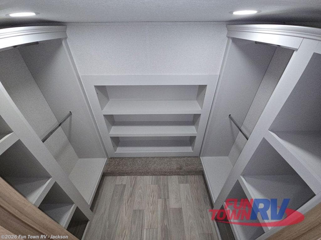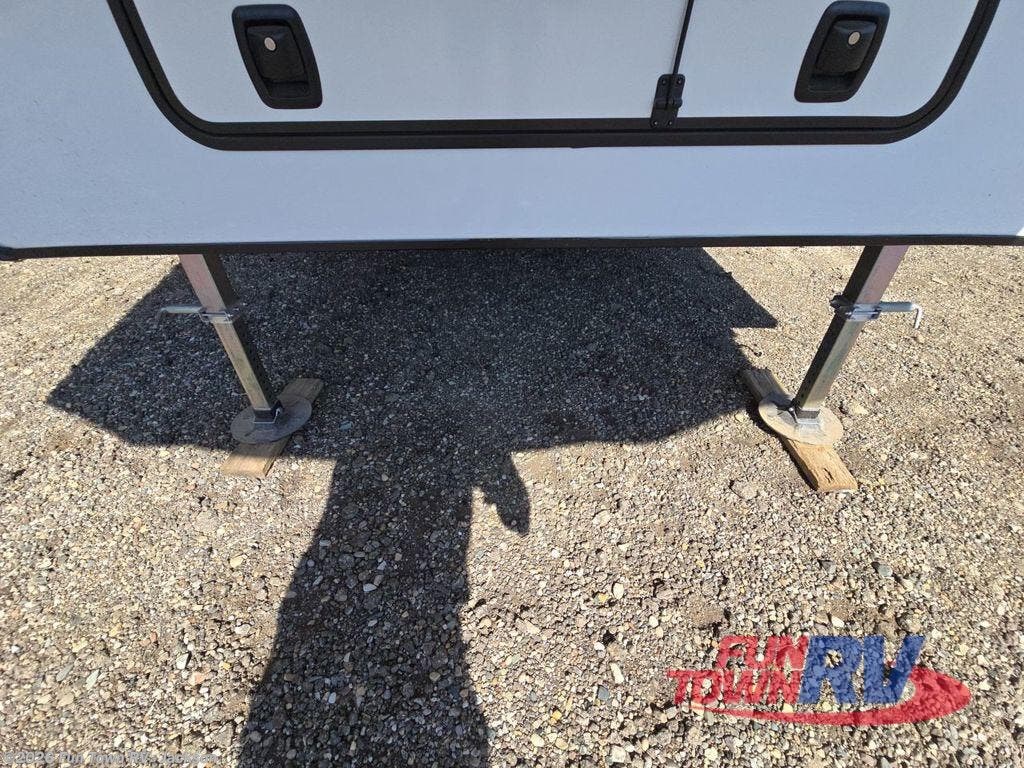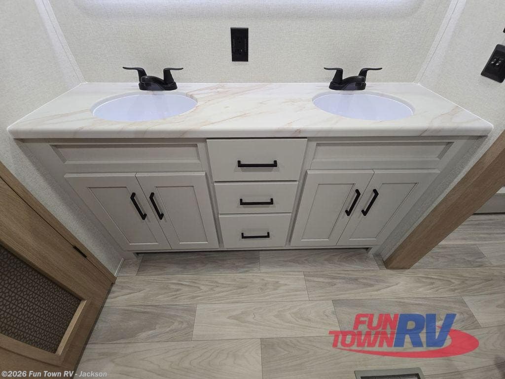 If you're looking to go full-time RVing, this fifth wheel is packed with convenient features! The master bedroom includes a king bed slide out with USB ports on either side of the bed so you both can charge your phones, and there is a dresser for your folded clothes. You will love the front bathroom with dual bath sinks, a shower with a seat, plus a walk-in closet with shelves, rods to hand clothes, and baskets for laundry! There is a unique middle utility room with washer and dryer, Washer and dryer counter and a rod to hang clothes that will make a perfect laundry room, or you can utilize this space for storage! Head to the main living area to relax on the theater seating or hide-a-bed sofa, and if you have guests stay over, they can sleep here. There is also an entertainment center with a 50" flat screen TV, but you might just leave that off if you're working at the desk with a chair that is provided. We've saved the best part for last; the kitchen! Here, you'll find ample counter space to prep home-cooked meals, a three burner high output range with a 22" oven, plus a large counter with barstools where you can enjoy breakfast at each morning. Choosing this fifth wheel is a no-brainer!