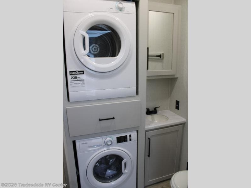 This fifth wheel is perfect for those seeking a comfortable, feature-rich home on wheels. Upon entering, you'll find a spacious rear living room, ideal for relaxation and entertainment. The room features a comfortable chase lounge, sofa, and an entertainment center with a cozy fireplace. For added convenience, there's a hidden pantry, desk with a chair, and a shelf and cabinet for storage. The kitchen is well-appointed with a stylish kitchen island featuring a beautiful waterfall edge. Overhead cabinets provide ample storage, while the microwave, 12V refrigerator, and four-burner cooktop make meal preparation a breeze. Plus, a butler pantry offers additional storage for kitchen essentials. A convenient half bath is located nearby, complete with a stackable washer and dryer prep if you want the option to add these appliances. The bedroom retreat features a comfortable king bed, a small dresser, and a tall dresser with a TV hookup. The adjacent walk-in bathroom closet boasts a one-piece fiberglass shower with a seat, dual sink, medicine cabinet, linen closet, and ample storage thanks to the various shelves, perfect for keeping your belongings organized. Exterior features include two awnings, one 12’ and the other 18’, providing ample shade and protection.