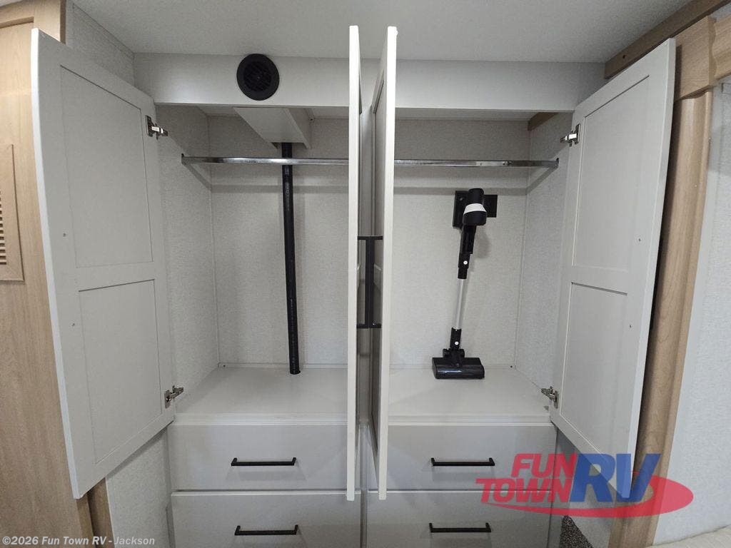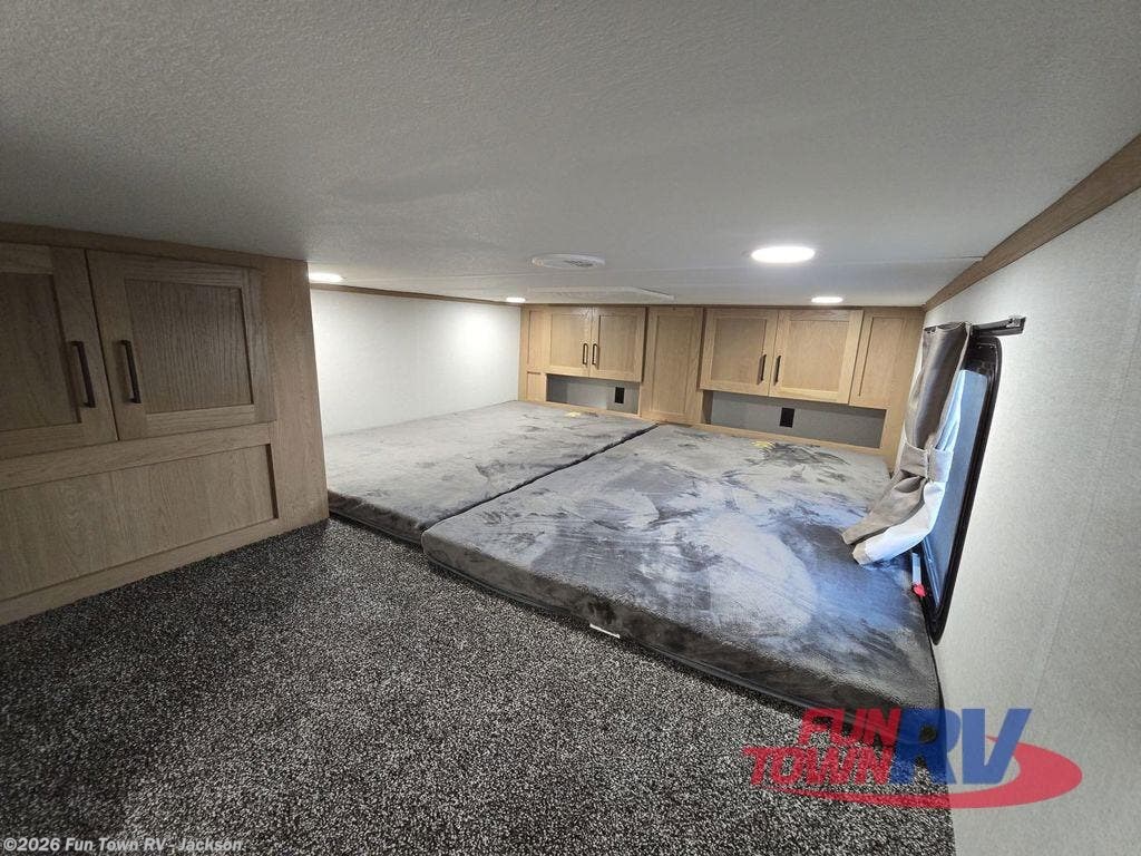 The perfect fifth wheel for a larger family! This unit sleeps eight or more with the full and half lofts above the rear master bedroom and bathroom. In the full loft area there are two 44" x 74" bunk mats for comfort as well as wardrobe/storage at the head of each. The master bedroom features a king size bed that slides out to create more space by the bed. A spacious bath features a walk-in shower for comfort and includes a seat so you can relax while you shower. A spacious kitchen features two slides, a free standing dinette in one, and the 12V refrigerator and stove in the other. There is also a center island with large sink for added food prep space. Head up the steps in front to a dual slide front living area with 50" TV and fireplace beneath the window. There is also theater seating opposite the TV, and a tri-fold hide-a-bed in each slide allowing added sleeping space when needed.