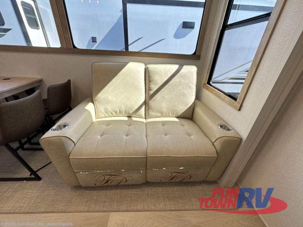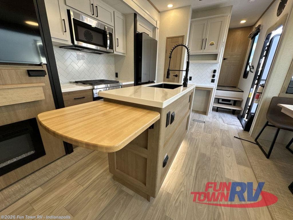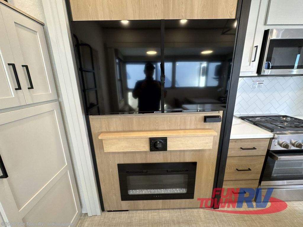 Enjoy a home on wheels with this fifth wheel! There are two bedrooms to choose from plus an upper loft with two 32" x 74" bunk mats, cabinets, and TV prep. The front private bedroom has a queen bed slide across from a dresser and a front wardrobe that is prepped to add an optional washer and dryer. The second bedroom has a queen bed slide across from a dresser with wardrobes on either side, plus it's very own full rear bathroom which has a 36" x 24" tub and a rear entry/exit door to the unit. The second full bathroom has a shower with a seat so everyone can get ready quickly in the morning. Prepare your best home cooked meals with the kitchen island and three burner cooktop then enjoy it at the free standing dinette. Relax in true comfort each night in the theater seating across from the fireplace and 50" TV at the entertainment center!