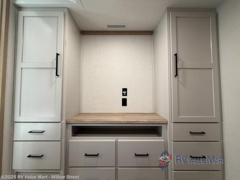 Enjoy a home on wheels with this fifth wheel! There are two bedrooms to choose from plus an upper loft with two 32" x 74" bunk mats, cabinets, and TV prep. The front private bedroom has a queen bed slide across from a dresser and next to a front wardrobe that is prepped to add an optional washer and dryer. The second bedroom has a queen bed slide across from a dresser with wardrobes on either side, plus it's very own full rear bathroom which has a tub and a rear entry/exit door to the unit. The second full bathroom has a one-piece fiberglass shower so everyone can get ready quickly in the morning. Prepare your best home cooked meals with the kitchen island and three burner cooktop then enjoy it at the free-standing dinette. Relax in true comfort each night in the theater seating across from the fireplace and 50" TV at the entertainment center!
