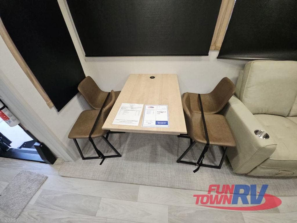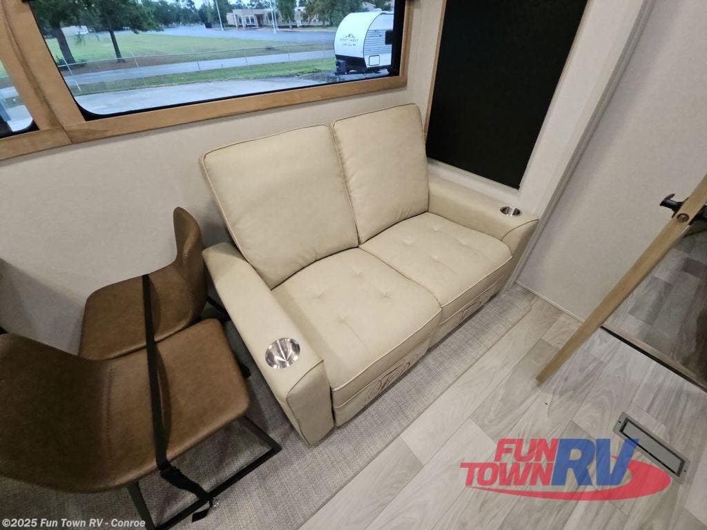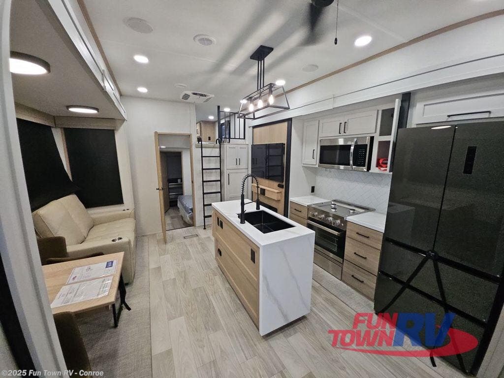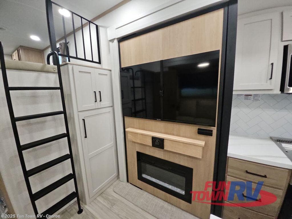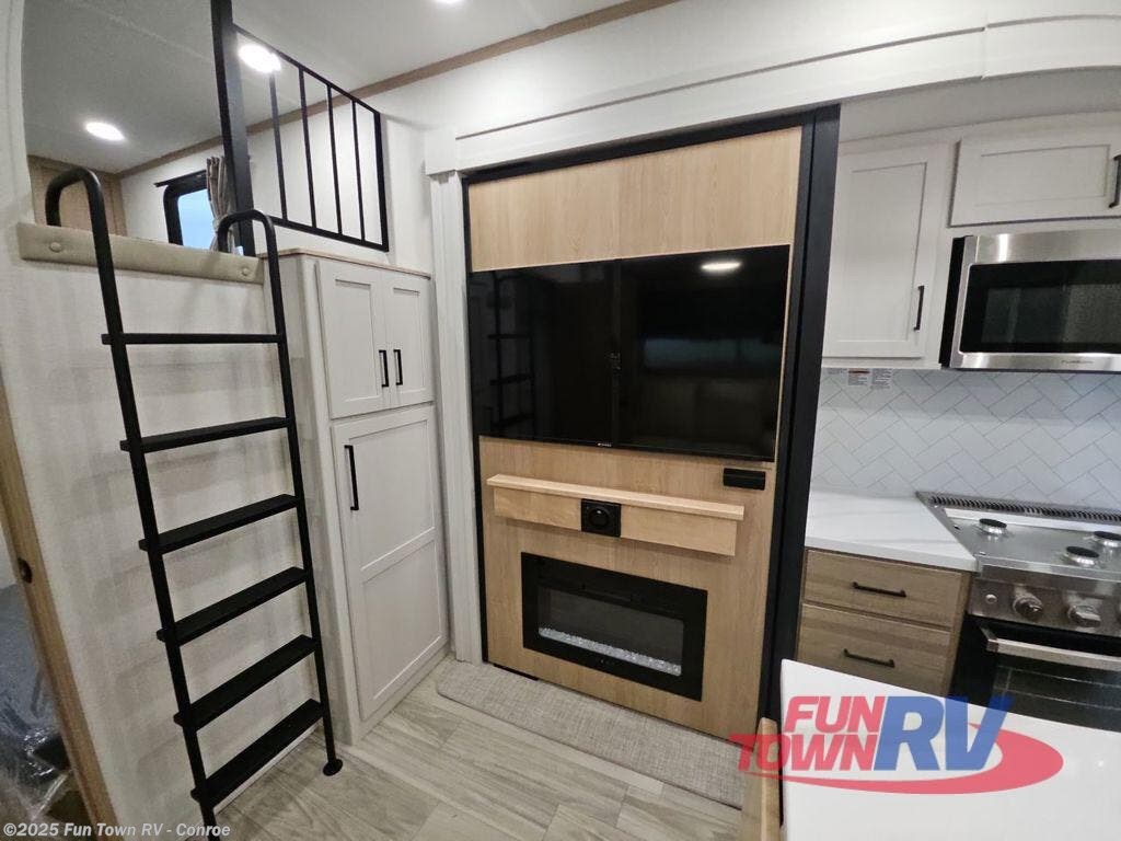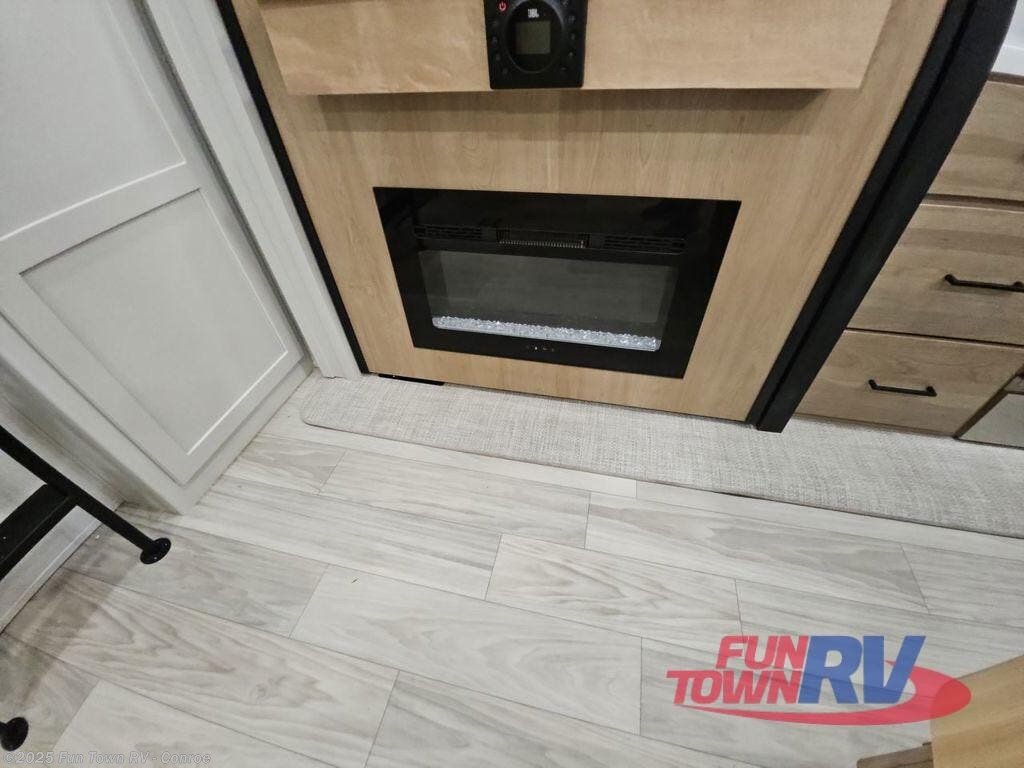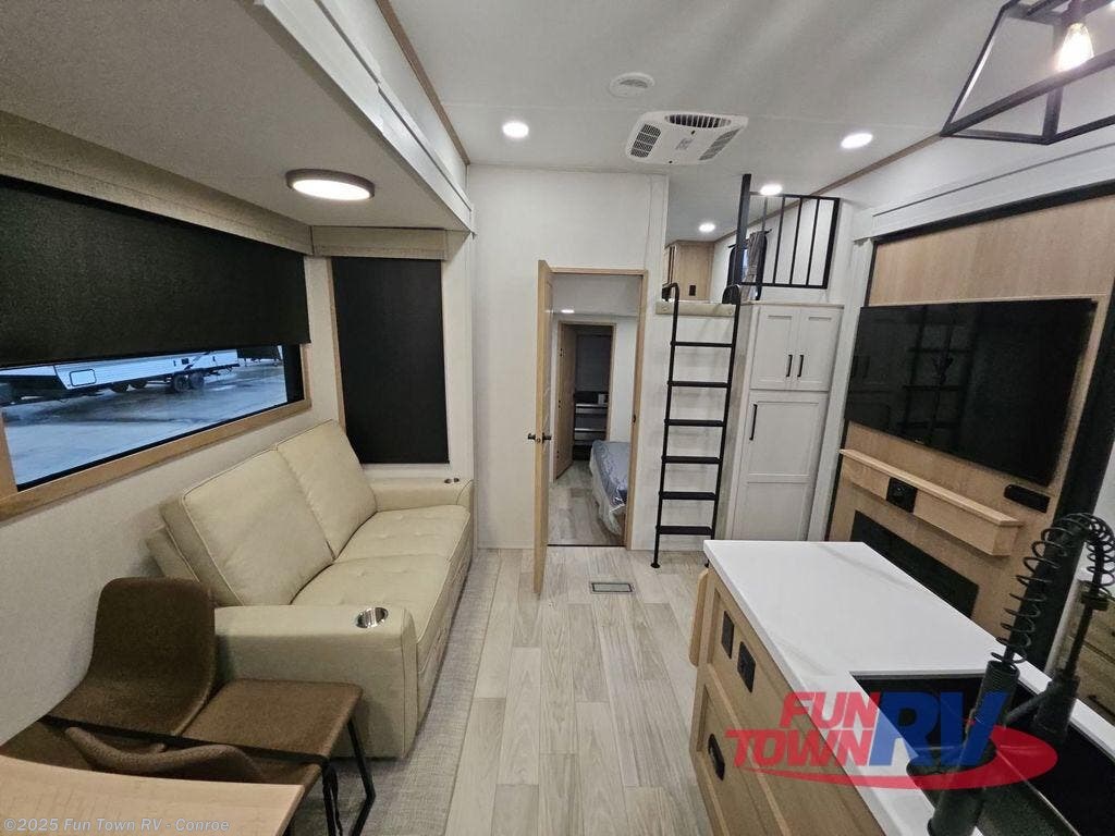 Enjoy a home on wheels with this fifth wheel! There are two bedrooms to choose from plus an upper loft with two 32" x 74" bunk mats, cabinets, and TV prep. The front private bedroom has a queen bed slide across from a dresser and next to a front wardrobe that is prepped to add an optional washer and dryer. The second bedroom has a queen bed slide across from a dresser with wardrobes on either side, plus it's very own full rear bathroom which has a tub and a rear entry/exit door to the unit. The second full bathroom has a one-piece fiberglass shower so everyone can get ready quickly in the morning. Prepare your best home cooked meals with the kitchen island and three burner cooktop then enjoy it at the free-standing dinette. Relax in true comfort each night in the theater seating across from the fireplace and 50" TV at the entertainment center!