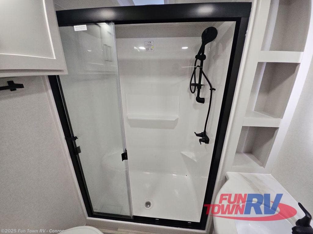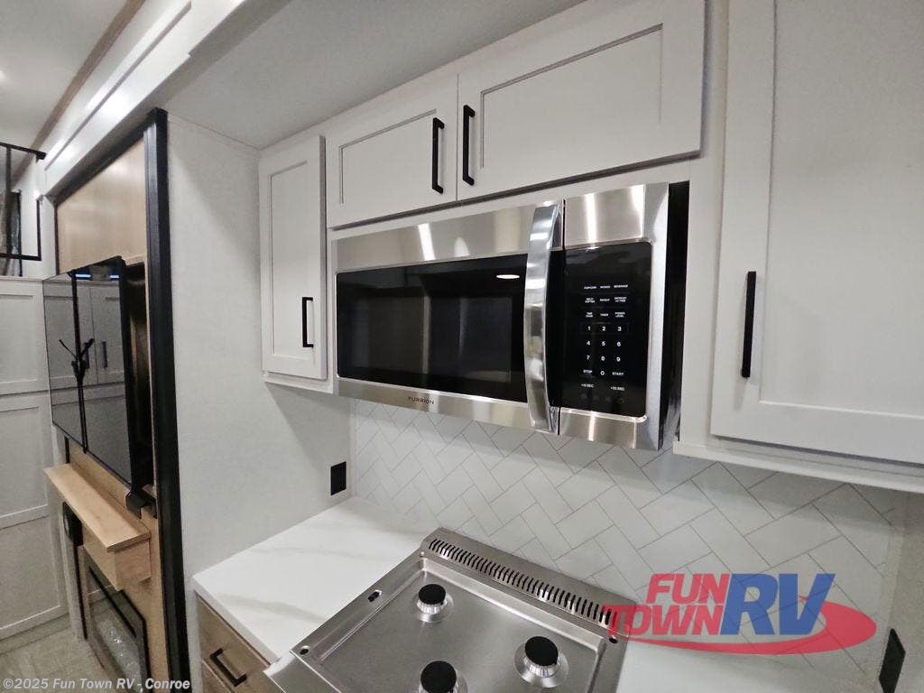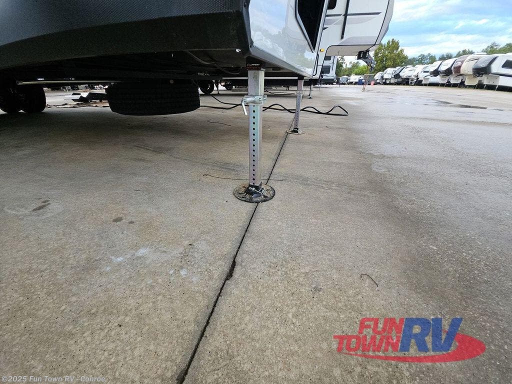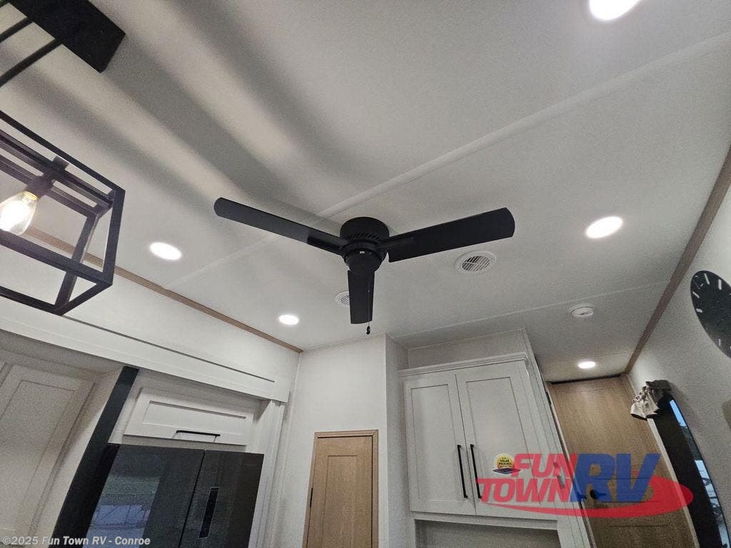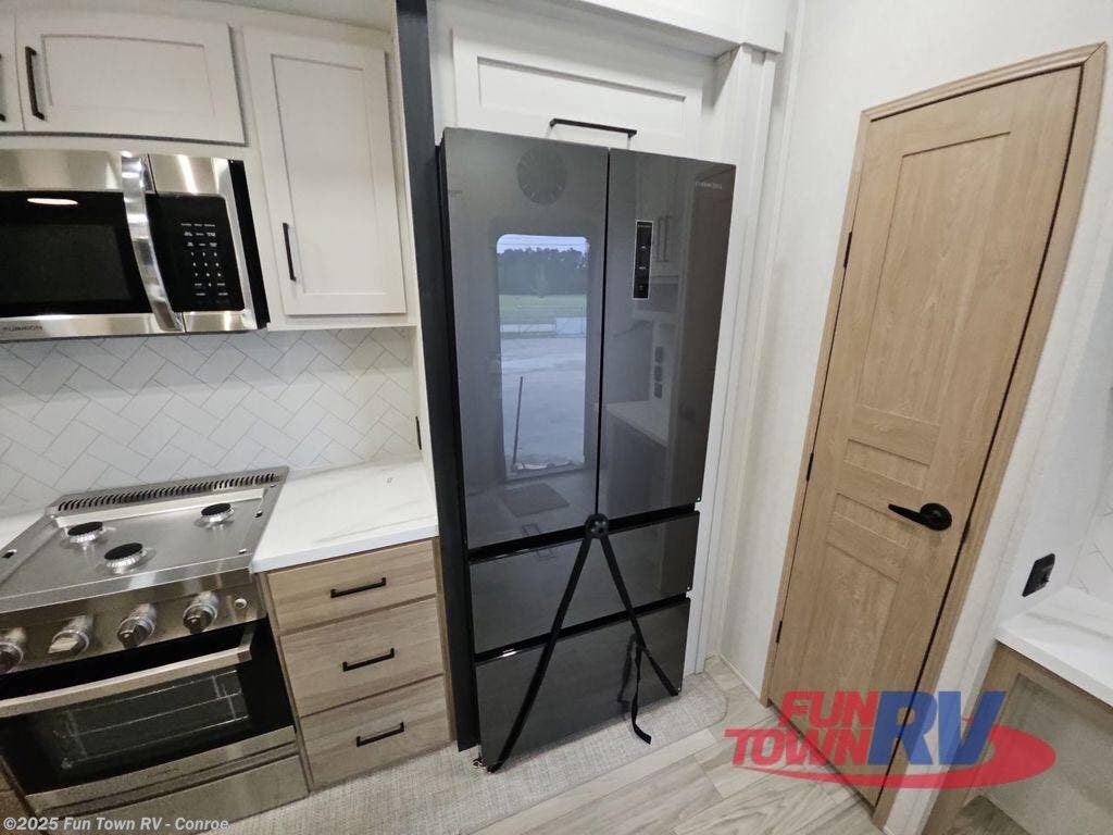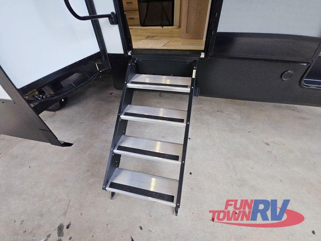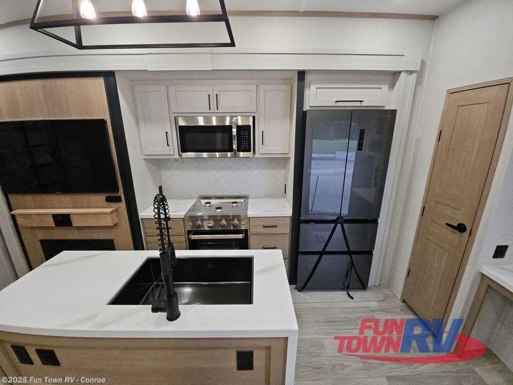 Enjoy a home on wheels with this fifth wheel! There are two bedrooms to choose from plus an upper loft with two 32" x 74" bunk mats, cabinets, and TV prep. The front private bedroom has a queen bed slide across from a dresser and next to a front wardrobe that is prepped to add an optional washer and dryer. The second bedroom has a queen bed slide across from a dresser with wardrobes on either side, plus it's very own full rear bathroom which has a tub and a rear entry/exit door to the unit. The second full bathroom has a one-piece fiberglass shower so everyone can get ready quickly in the morning. Prepare your best home cooked meals with the kitchen island and three burner cooktop then enjoy it at the free-standing dinette. Relax in true comfort each night in the theater seating across from the fireplace and 50" TV at the entertainment center!