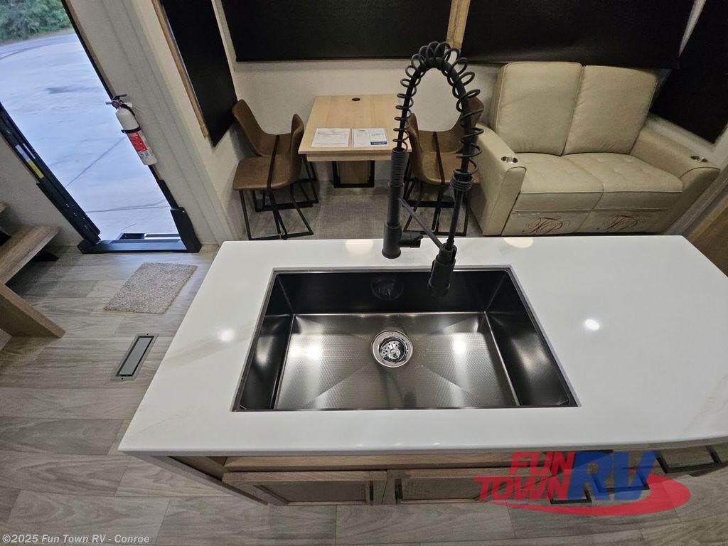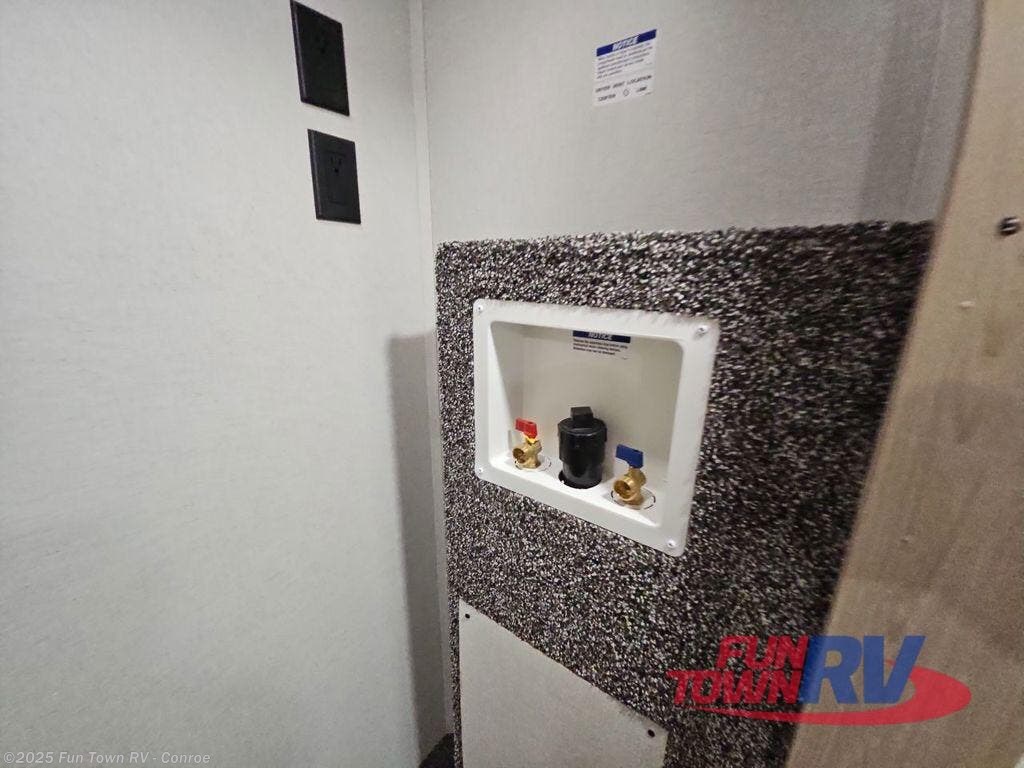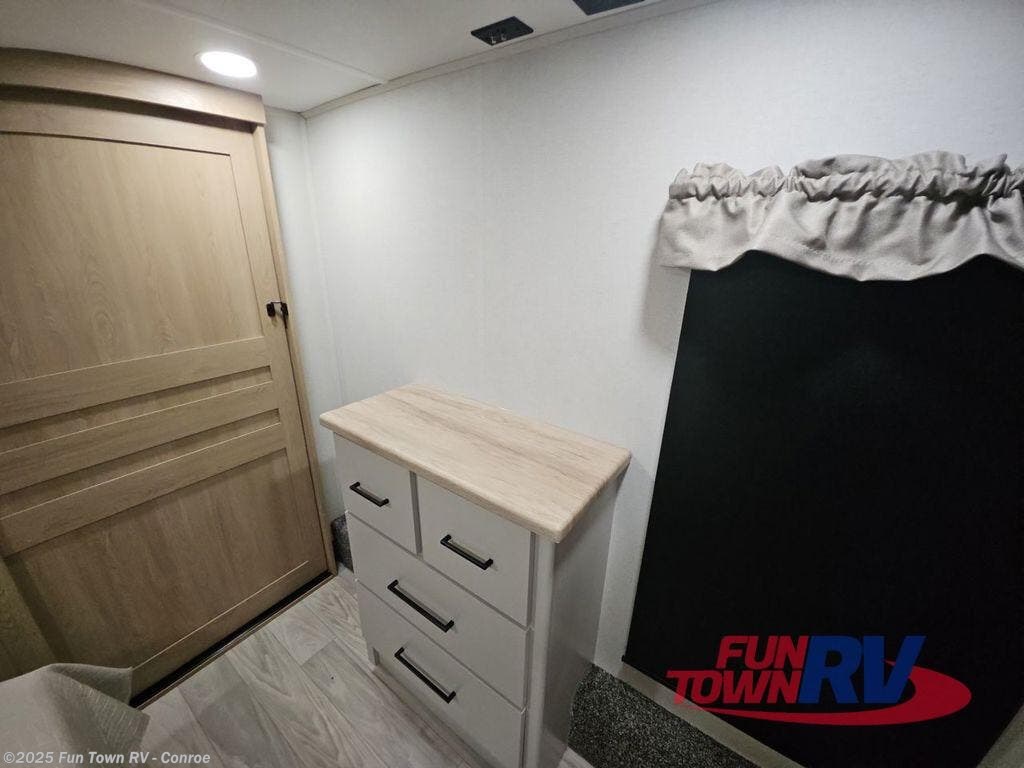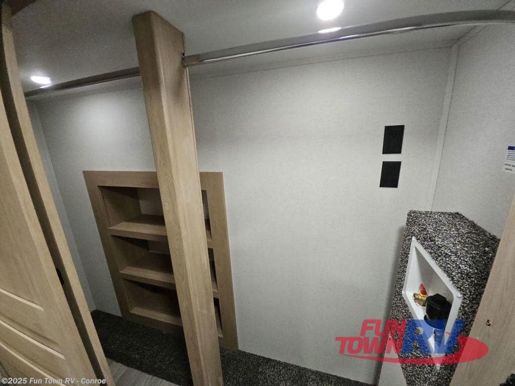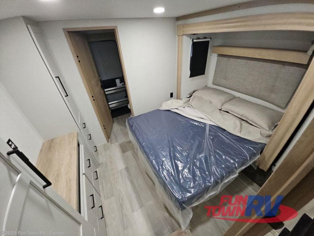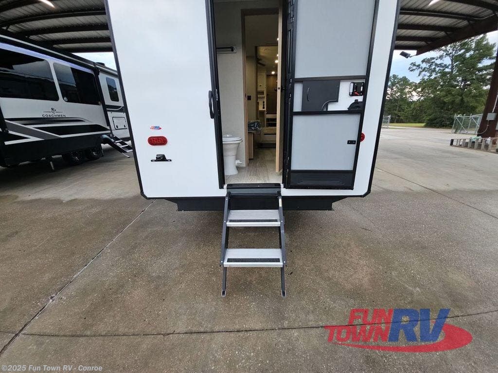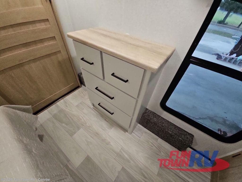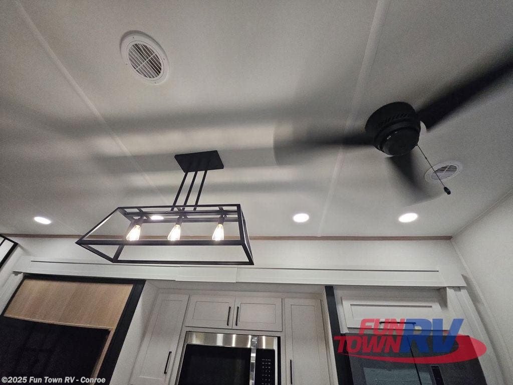 Enjoy a home on wheels with this fifth wheel! There are two bedrooms to choose from plus an upper loft with two 32" x 74" bunk mats, cabinets, and TV prep. The front private bedroom has a queen bed slide across from a dresser and next to a front wardrobe that is prepped to add an optional washer and dryer. The second bedroom has a queen bed slide across from a dresser with wardrobes on either side, plus it's very own full rear bathroom which has a tub and a rear entry/exit door to the unit. The second full bathroom has a one-piece fiberglass shower so everyone can get ready quickly in the morning. Prepare your best home cooked meals with the kitchen island and three burner cooktop then enjoy it at the free-standing dinette. Relax in true comfort each night in the theater seating across from the fireplace and 50" TV at the entertainment center!