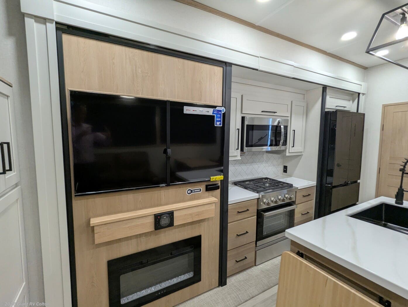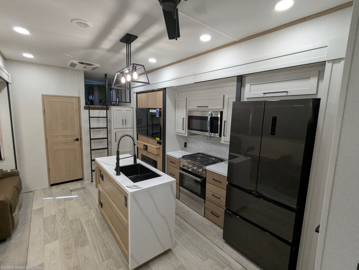 - Gourmet Kitchen: Kitchen island, 16.8 cu. ft. fridge for RV camping