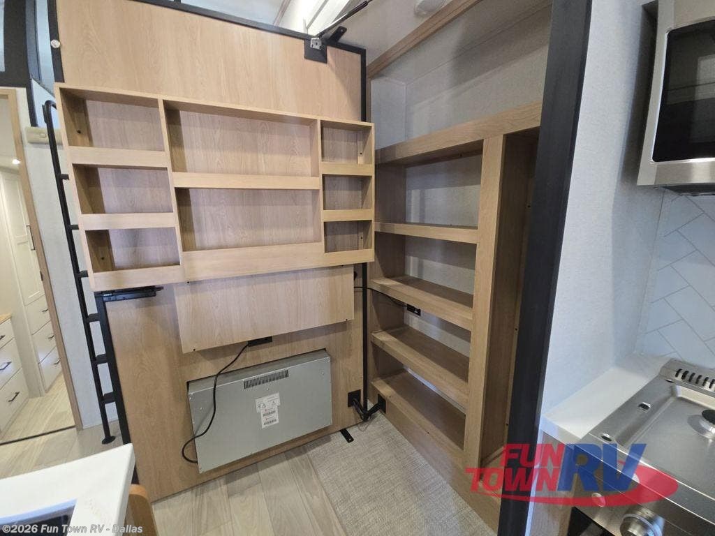 You won't believe the comfort and convenience found in this destination trailer. There are two private bedrooms; one up front with a queen bed slide out and storage space, and one in back with a queen bed slide out and a half bath! There is even washer and dryer prep here if you want to add those appliances and the second entry door is also found in this location so you can easily slip out in the morning. Above each of these rooms is a loft providing three total bunk mats for sleeping, storage cabinets, and TV prep if you want to add entertainment. Everyone can meet in the combined kitchen and living room that includes dual opposing slides, a 60" theater seating across from a 50" flat screen TV and fireplace, plus a free-standing table with chairs and a bench to dine at. The chef of your group will love the large kitchen island, Chef Collection three burner range, and a 16.2 cu. ft. refrigerator for food storage.
