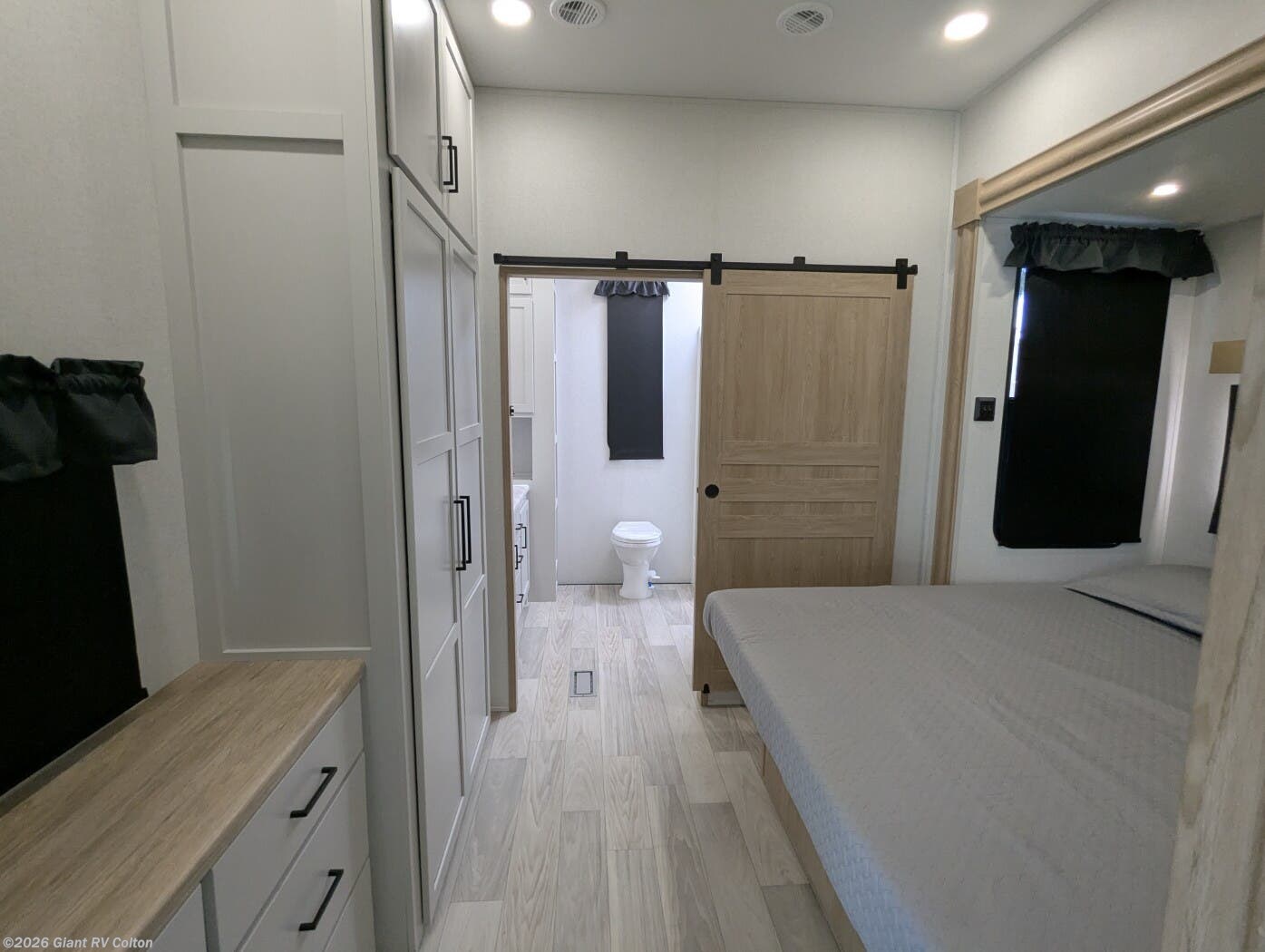 • King Suite & Bath-and-a-Half Convenience with a private rear bedroom, king bed slide, dual wardrobes, full rear bath plus mid-coach half bath, dual A/C, washer/dryer prep, and extended-stay comfort features.