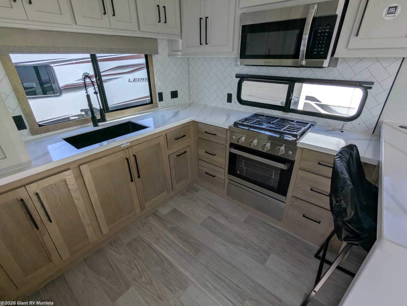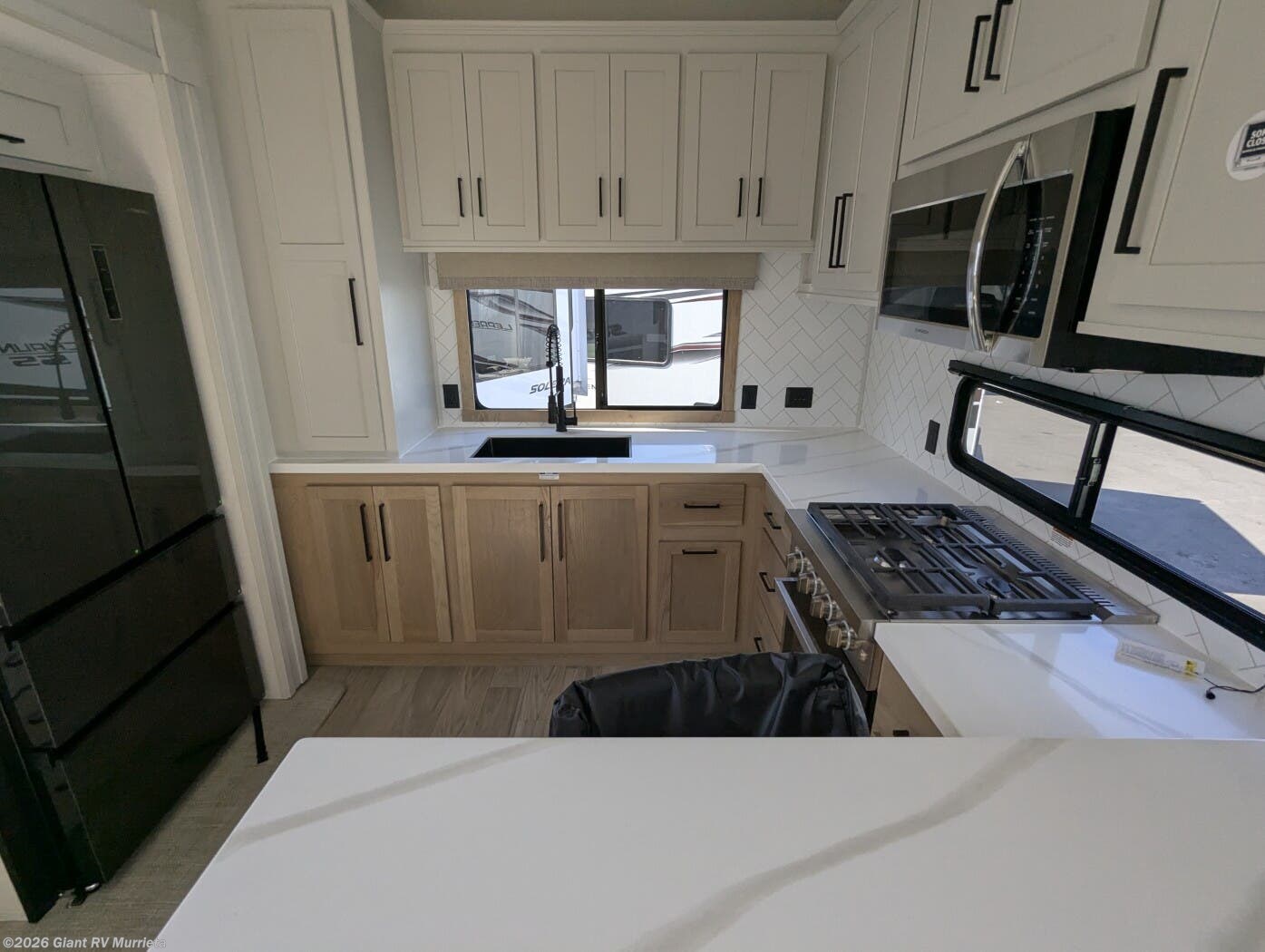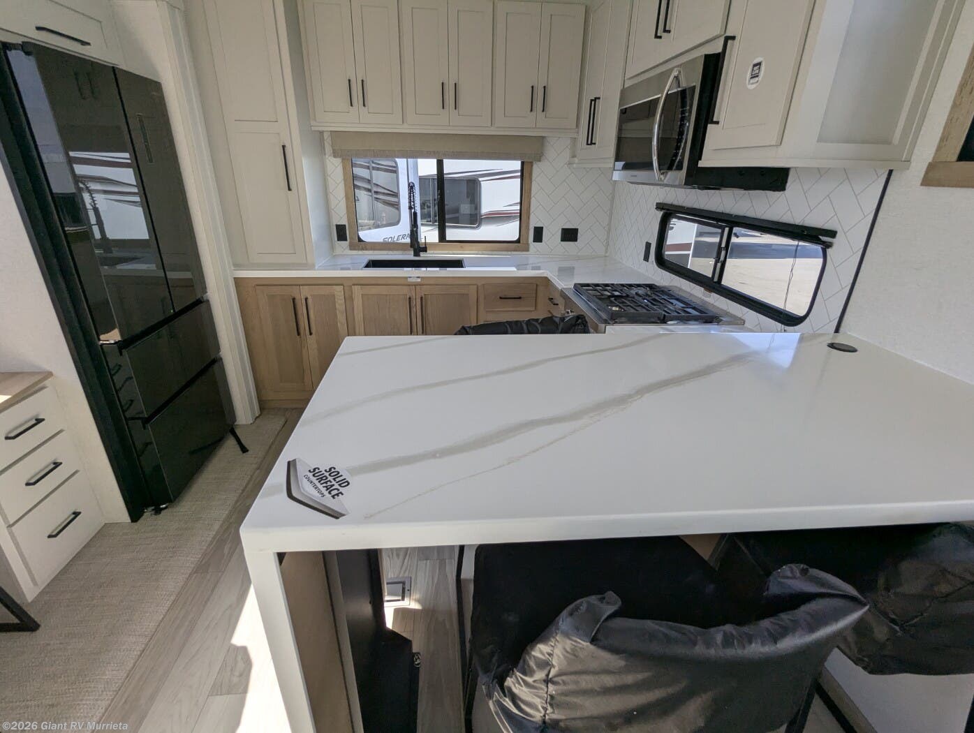 - Rear Gourmet Kitchen: Spacious kitchen with a 16.2 cu. ft. 12V refrigerator, 3-burner cooktop, and solid surface countertops.