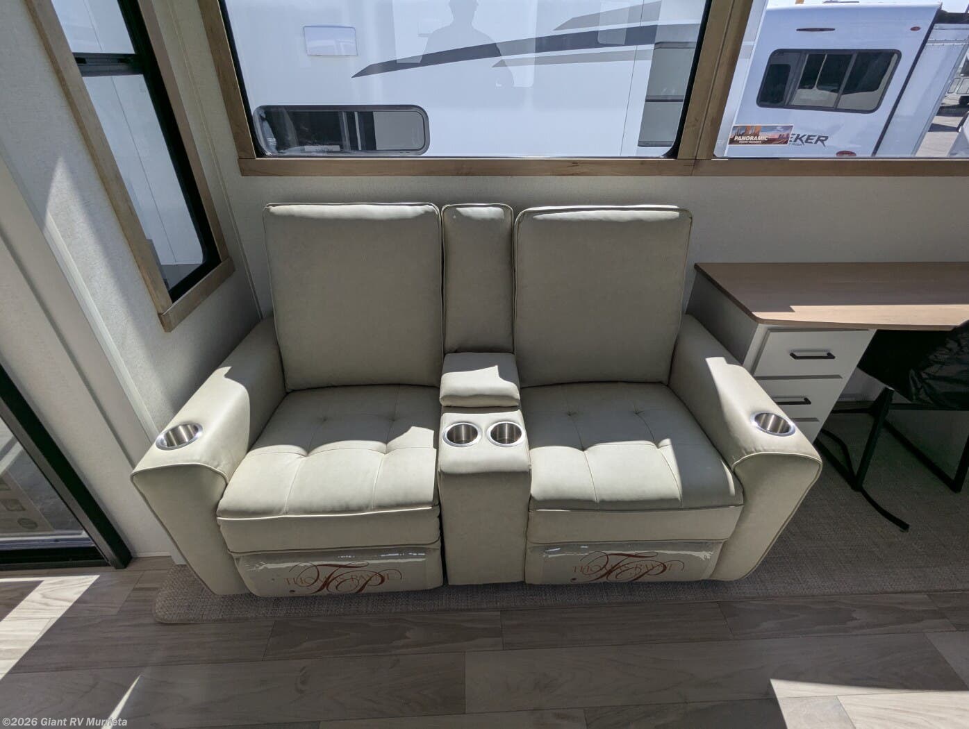- Spacious Living Area: Four slide-outs with a 50" Smart TV, theater seating, and fireplace for a cozy, residential feel.
