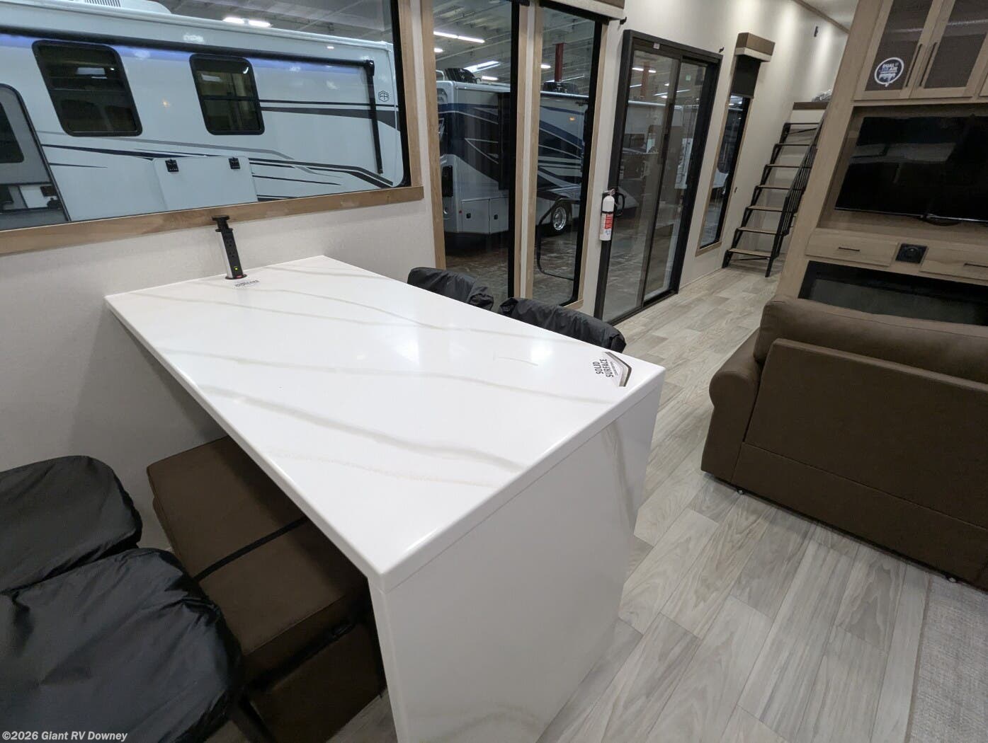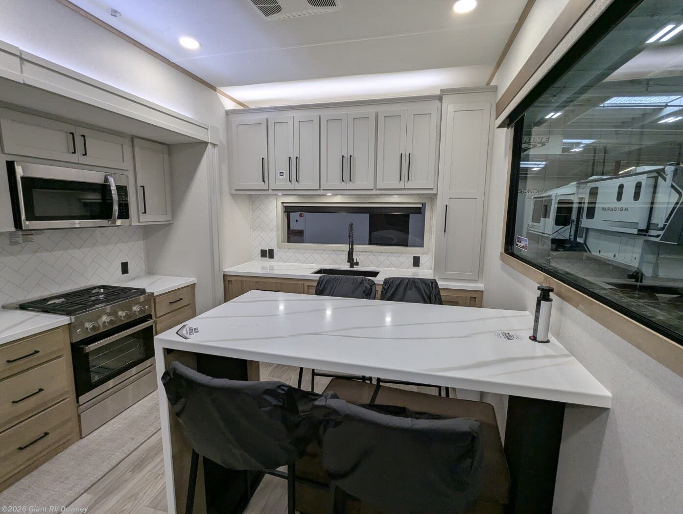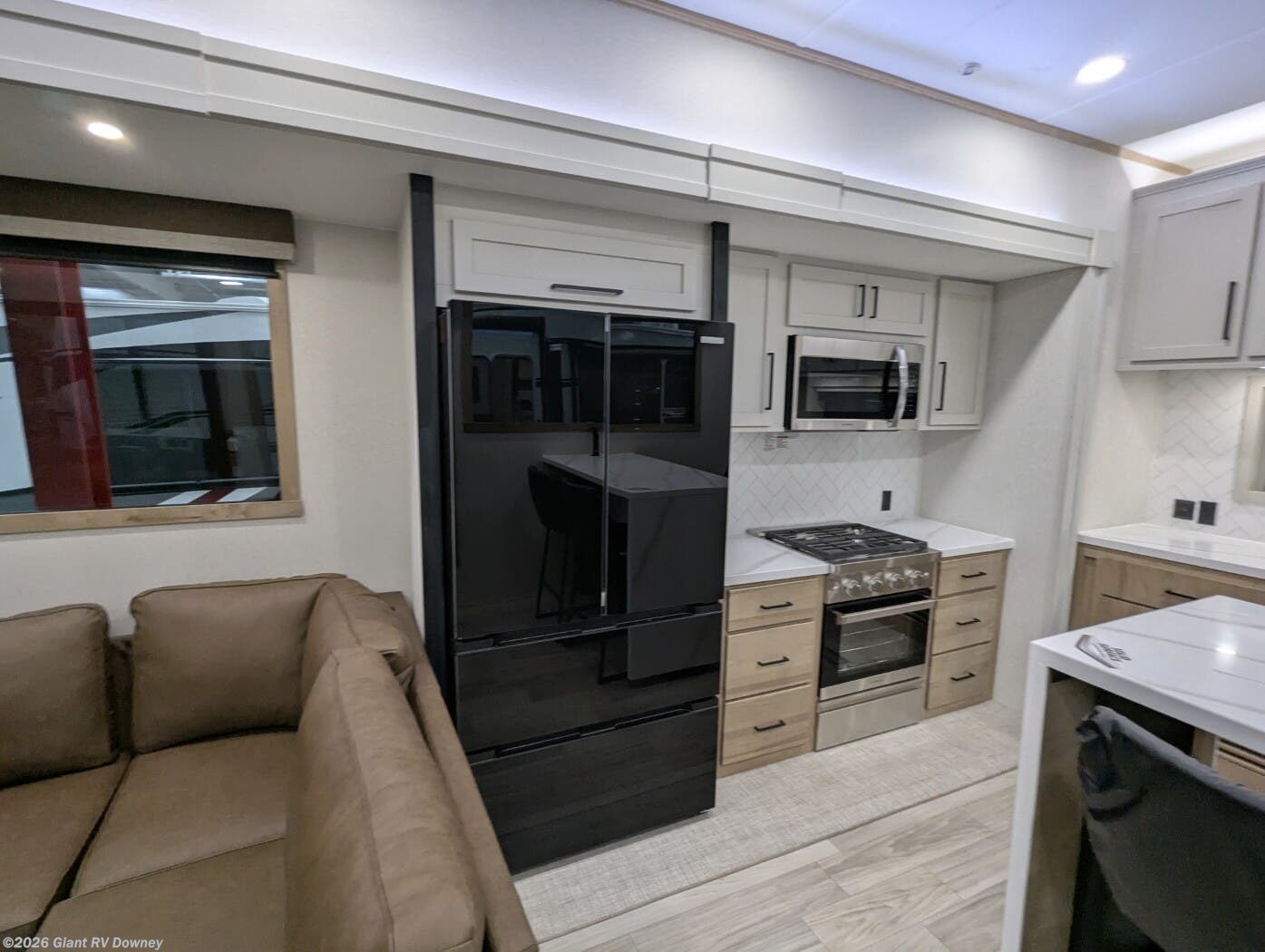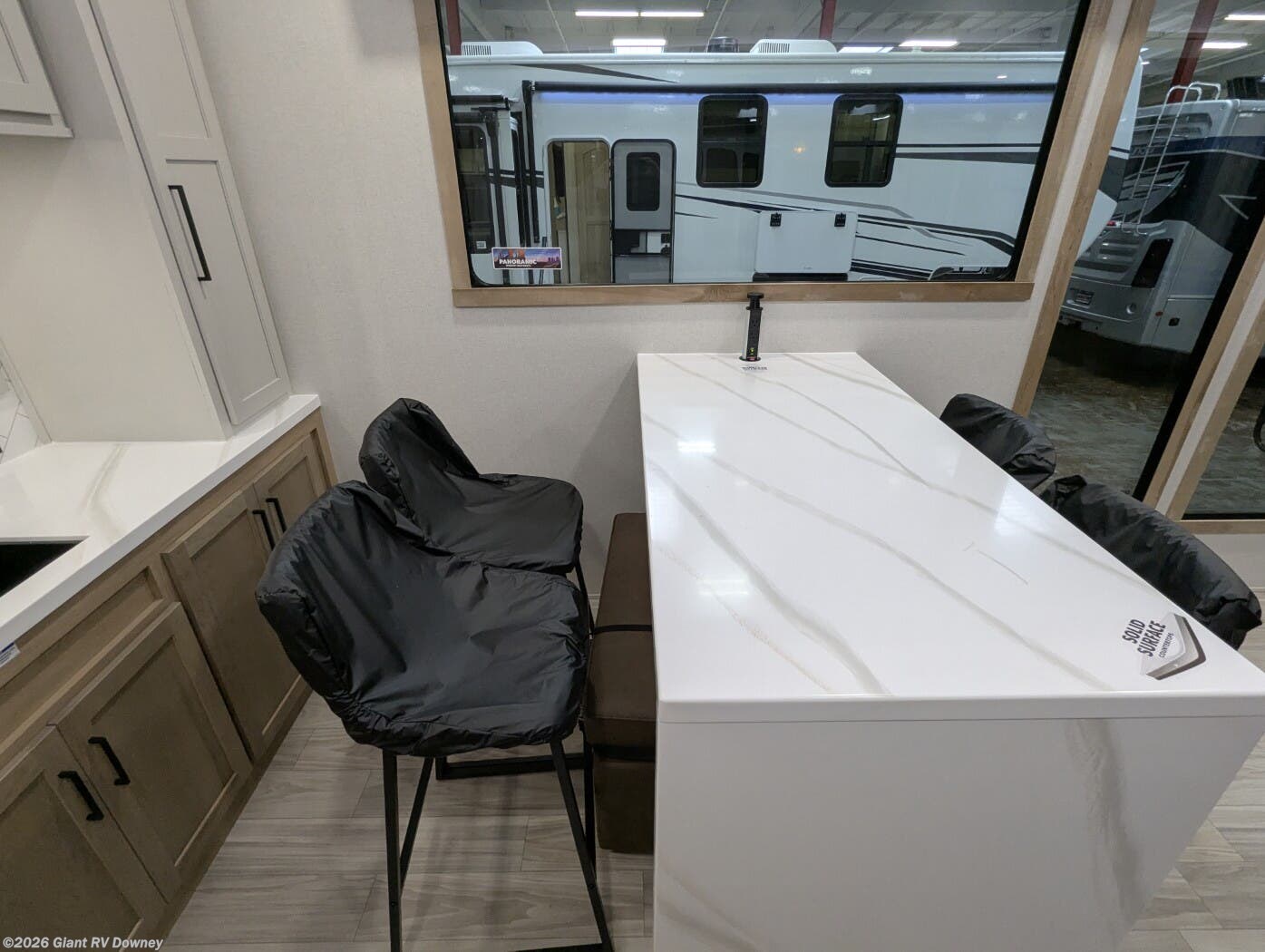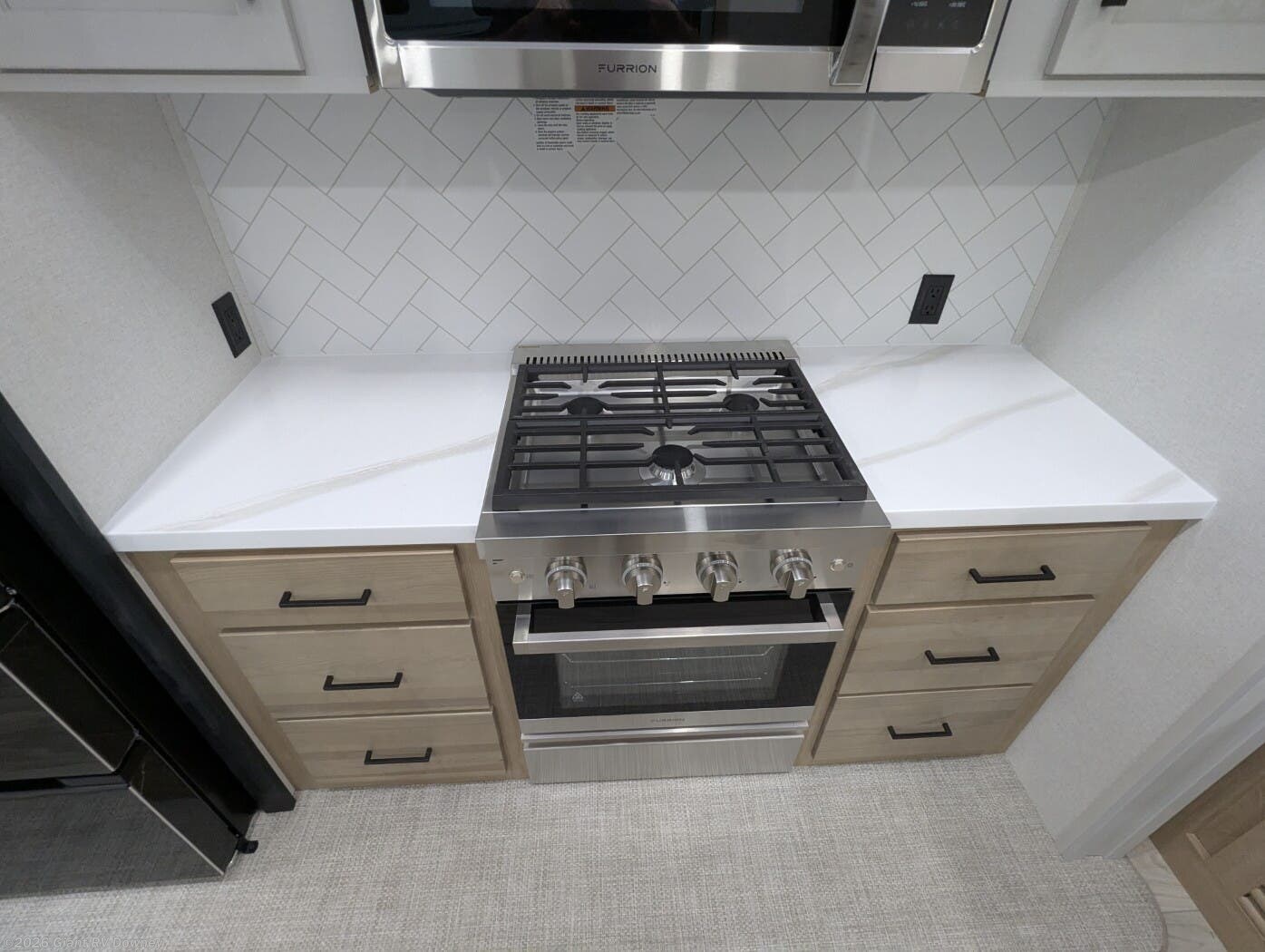 - Front Kitchen: Gourmet kitchen with a 19.6 cu. ft. 12V refrigerator, 3-burner range, island with pendant lights, and solid surface countertops for meal prep.
