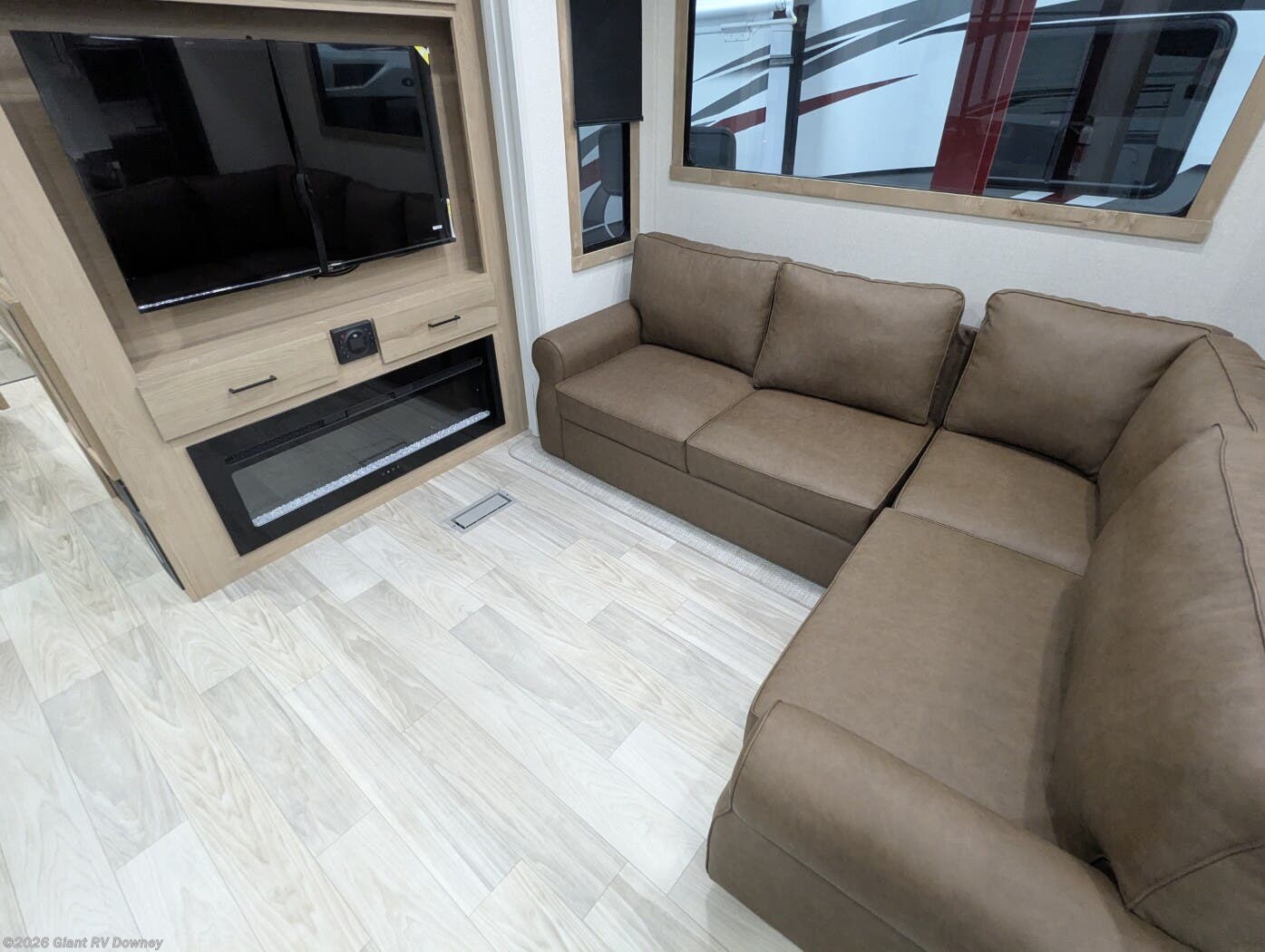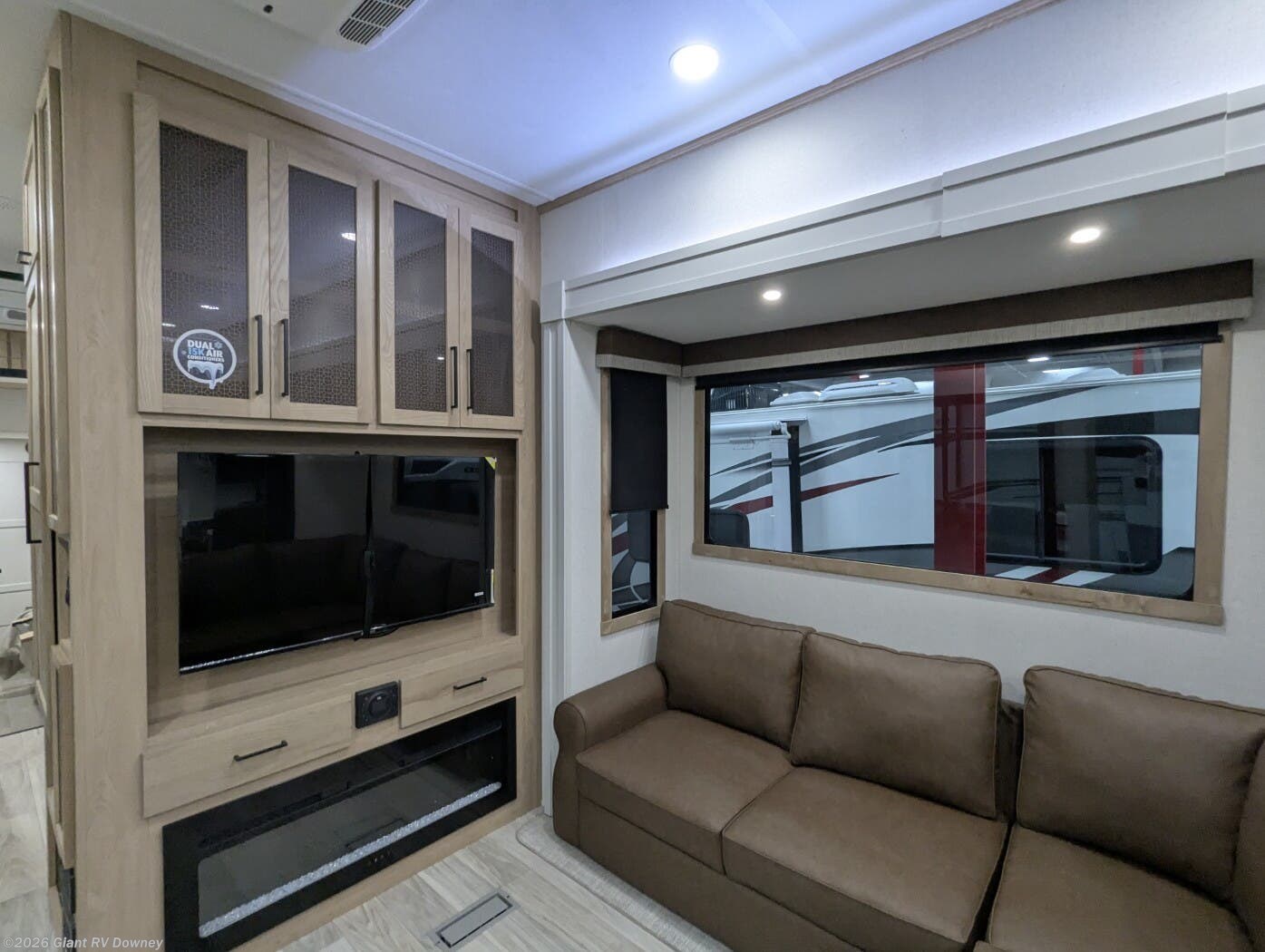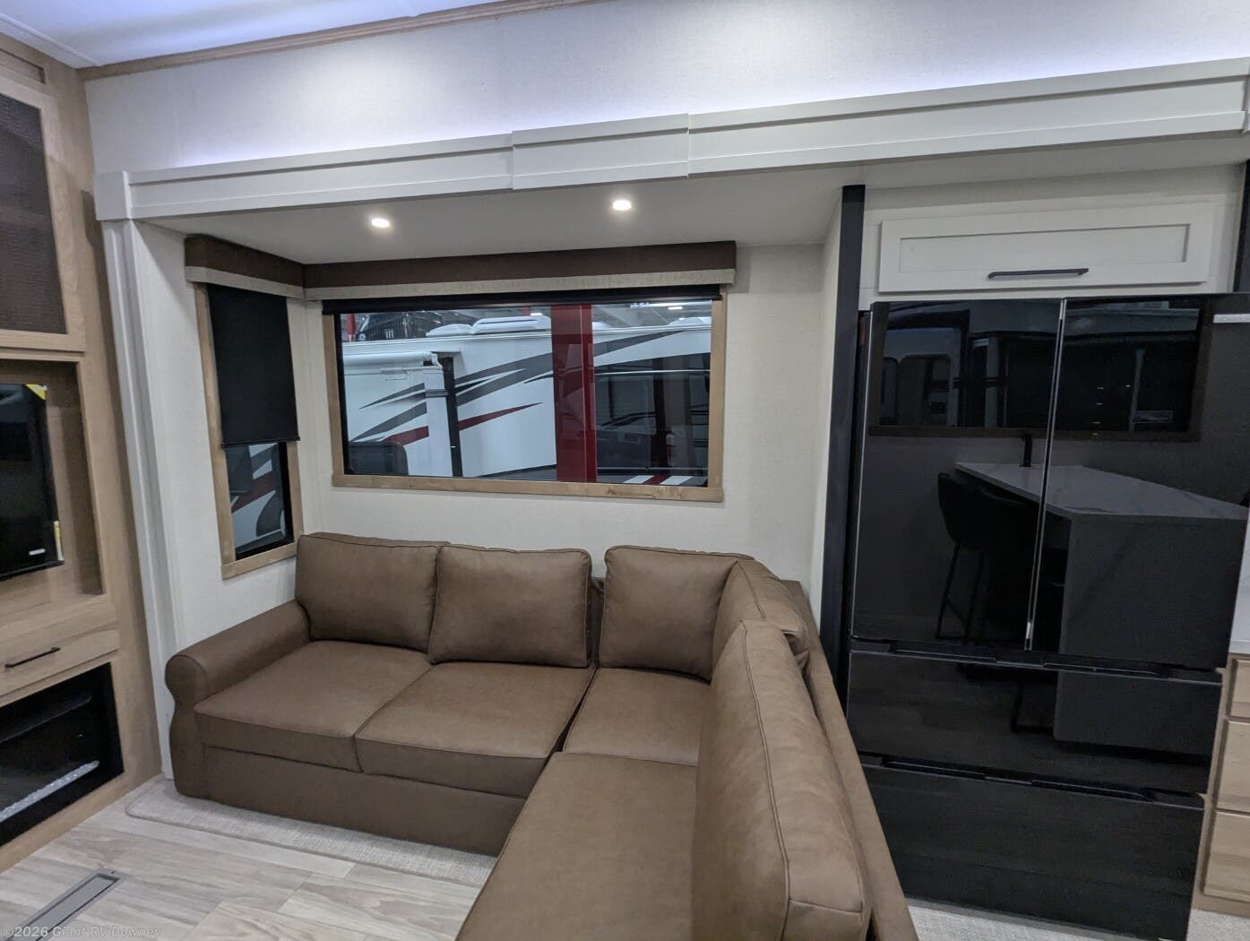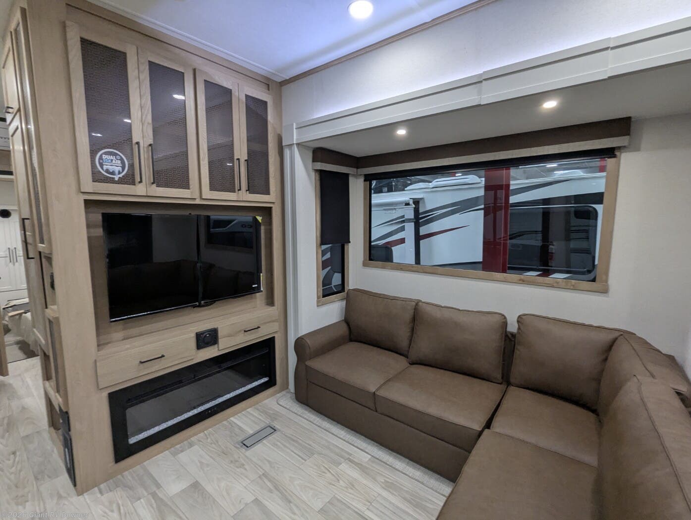 - Spacious Living Area: Three slide-outs with a sectional sofa, 50" Smart TV, fireplace, and theater seating for a cozy, residential feel, sleeping up to 7.