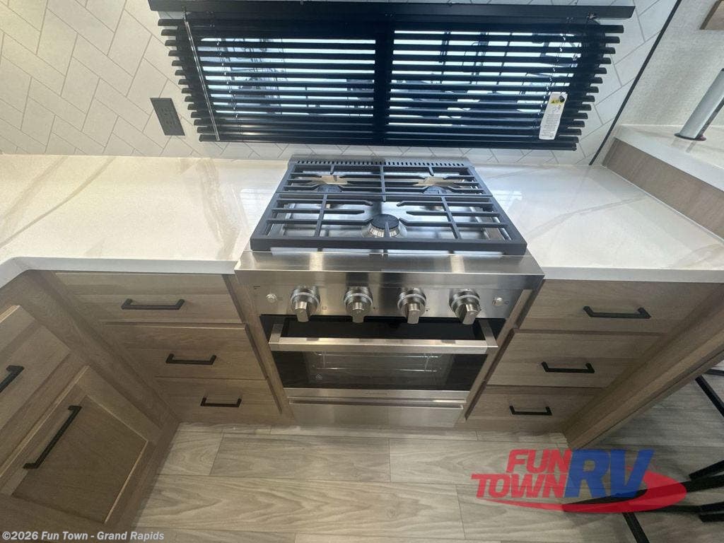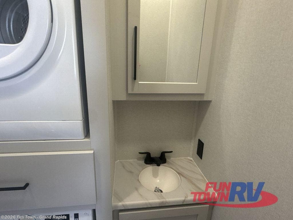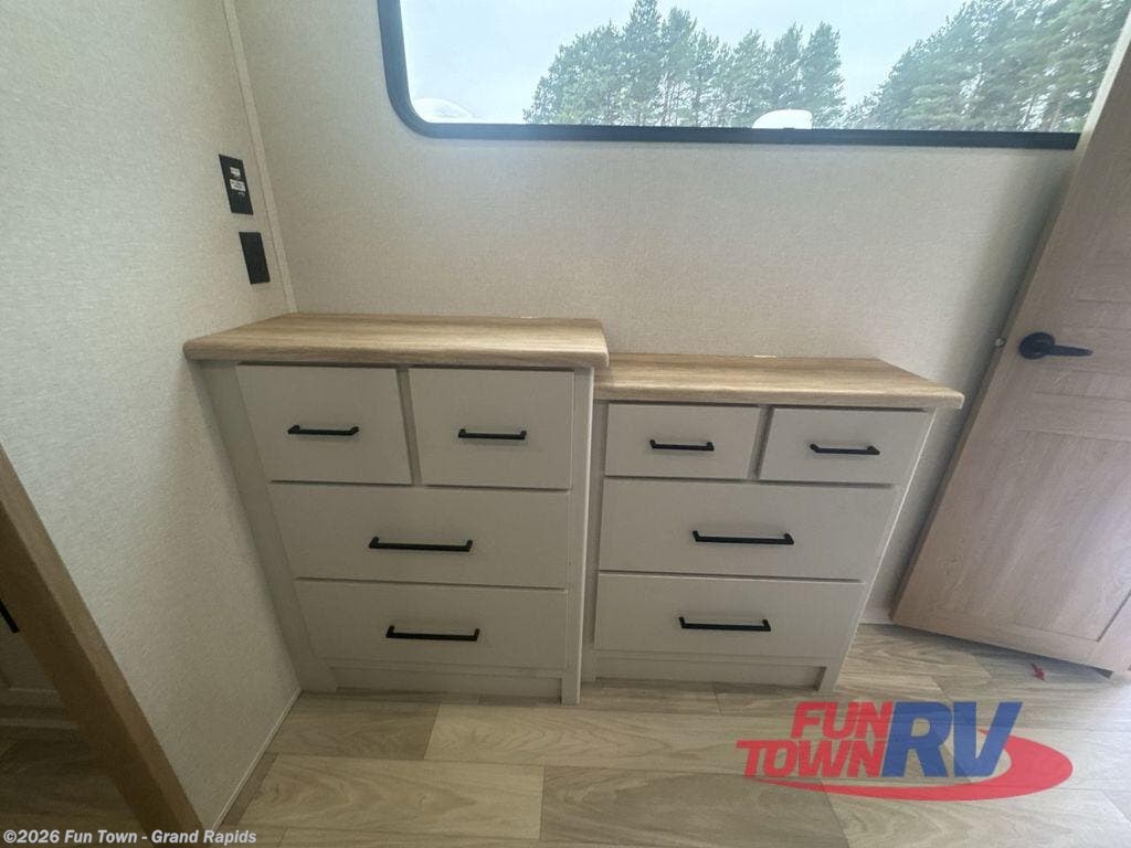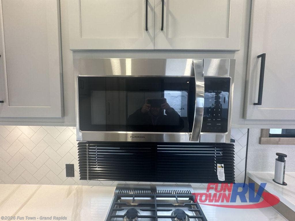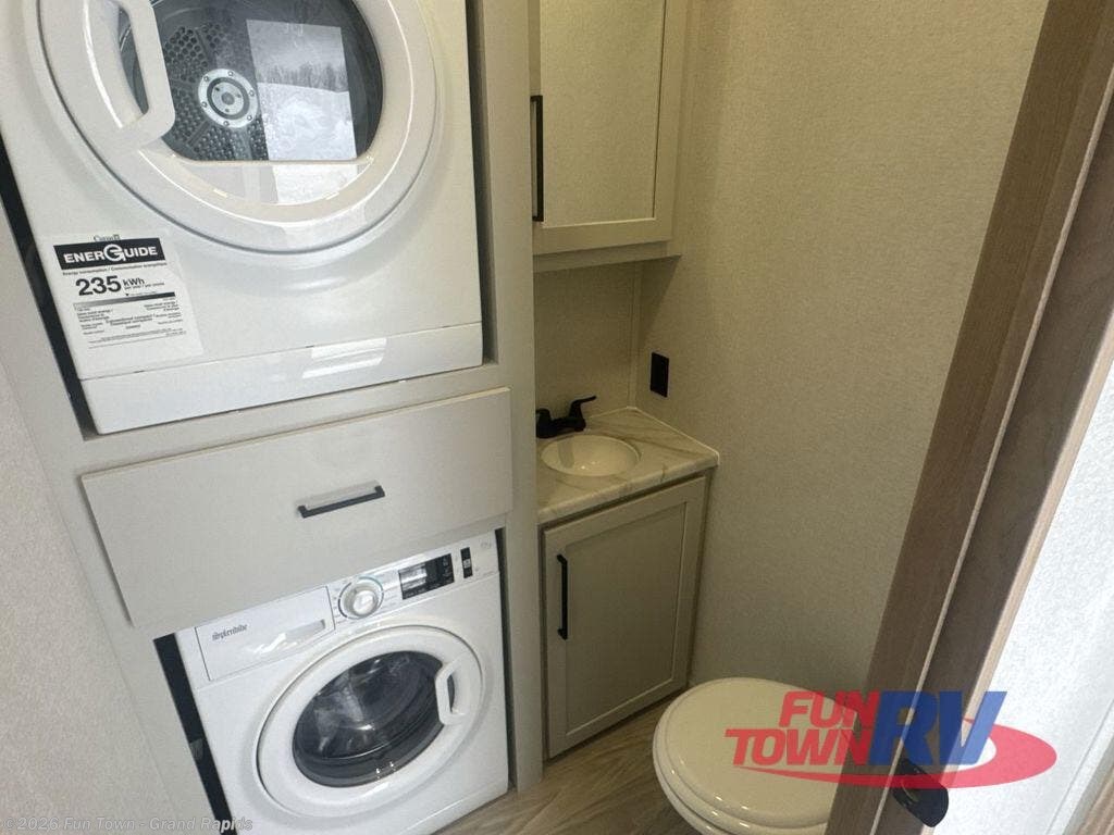 One look at this destination trailer and you'll be sold! You'll love waking up each morning in the master bedroom with a king bed slide out, dual nightstands, and a dresser to keep clothes organized. There is also a spacious front bathroom with a walk-in closet! As you walk to the main living area, you'll find the half bath with washer and dryer prep if you plan to add these appliances. A tri-fold hide-a-bed sofa and theater seating in the living area will let you relax each day, and the bar with stools overlooks the kitchen so you can visit with the chef while dinner is being made.