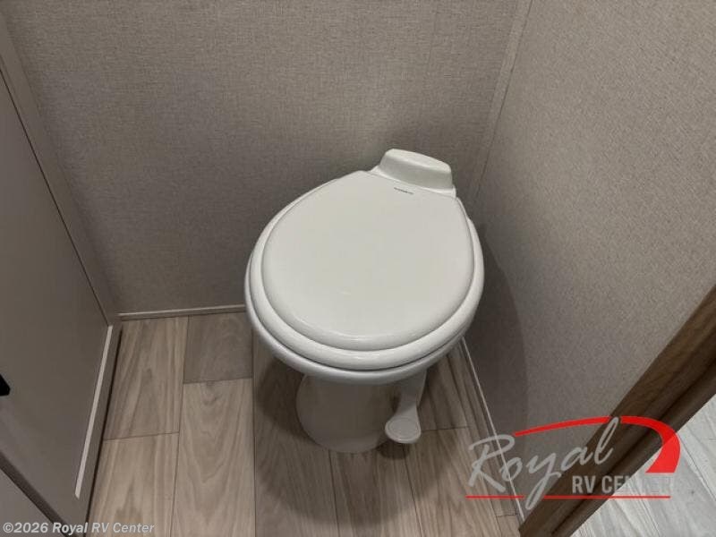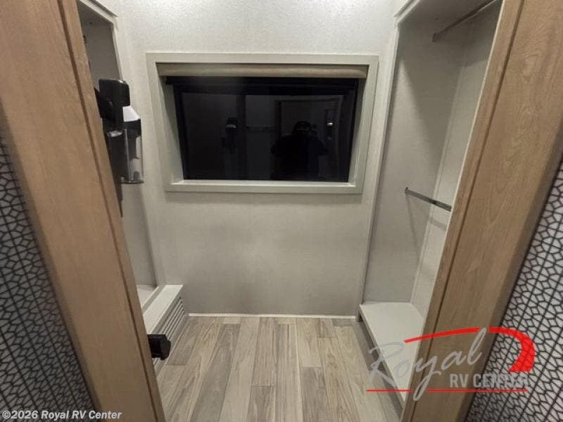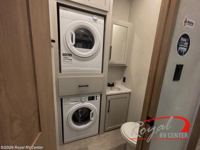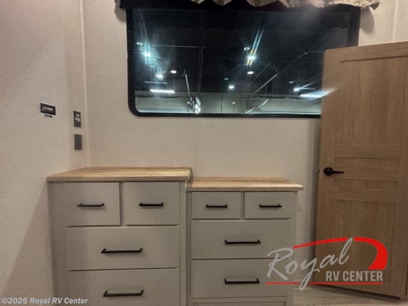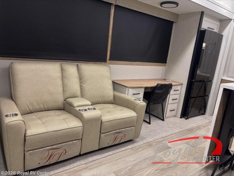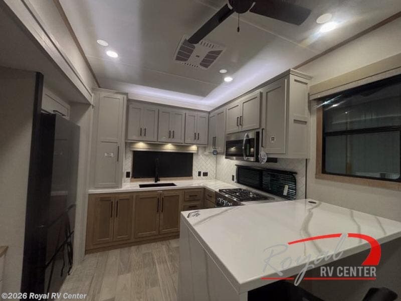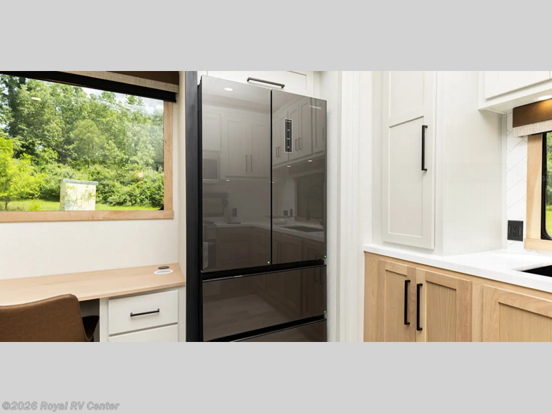 One look at this destination trailer and you'll be sold! You'll love waking up each morning in the master bedroom with a king bed slide out, dual nightstands, and a dresser to keep clothes organized. There is also a spacious front bathroom with a walk-in closet! As you walk to the main living area, you'll find the half bath with washer and dryer prep if you plan to add these appliances. A tri-fold hide-a-bed sofa and theater seating in the living area will let you relax each day, and the bar with stools overlooks the kitchen so you can visit with the chef while dinner is being made.