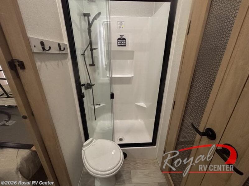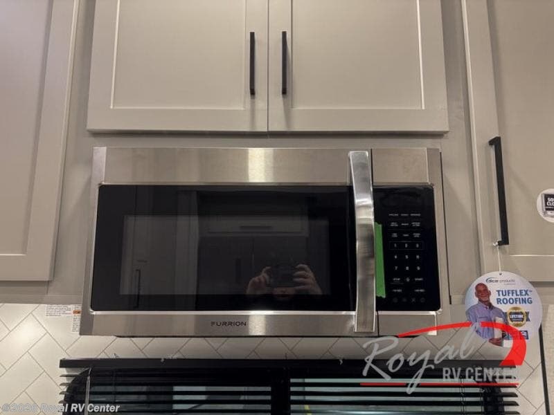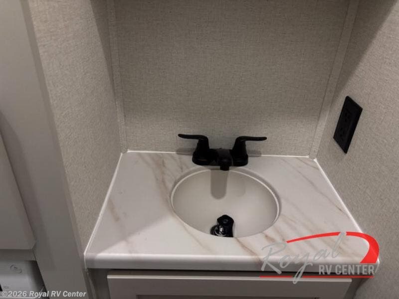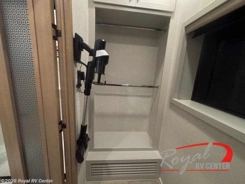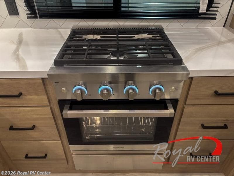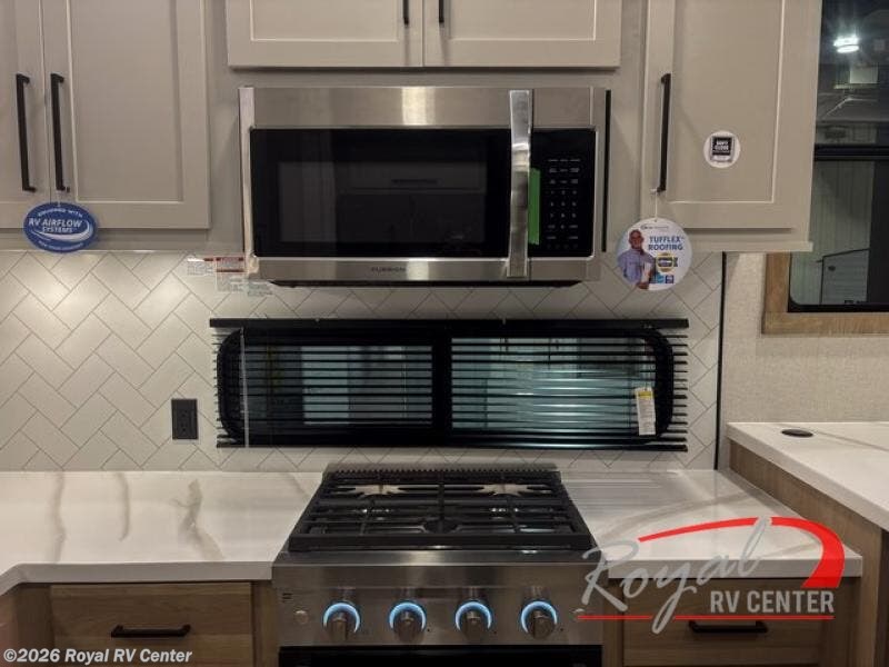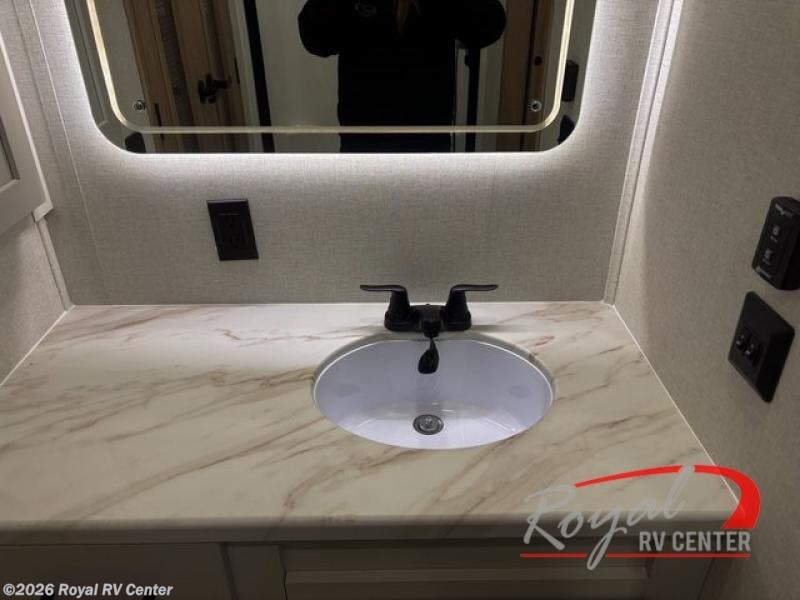 One look at this destination trailer and you'll be sold! You'll love waking up each morning in the master bedroom with a king bed slide out, dual nightstands, and a dresser to keep clothes organized. There is also a spacious front bathroom with a walk-in closet! As you walk to the main living area, you'll find the half bath with washer and dryer prep if you plan to add these appliances. A tri-fold hide-a-bed sofa and theater seating in the living area will let you relax each day, and the bar with stools overlooks the kitchen so you can visit with the chef while dinner is being made.
