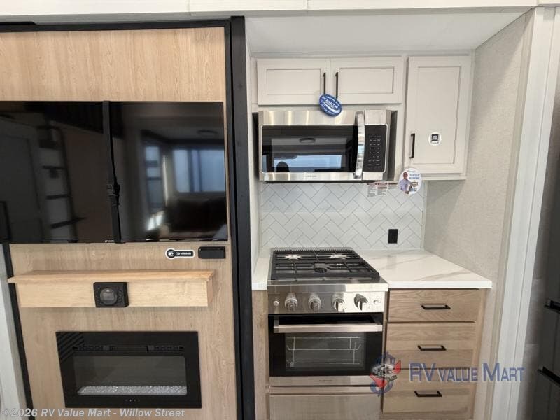 You won't believe the comfort and convenience found in this destination trailer. There are two private bedrooms; one up front with a queen bed slide out and storage space, and one in back with a queen bed slide out and a half bath! There is even washer and dryer prep here if you want to add those appliances and the second entry door is also found in this location so you can easily slip out in the morning. Above each of these rooms is a loft providing three total bunk mats for sleeping, storage cabinets, and TV prep if you want to add entertainment. Everyone can meet in the combined kitchen and living room that includes dual opposing slides, a 60" theater seating across from a 50" flat screen TV and fireplace, plus a free-standing table with chairs and a bench to dine at. The chef of your group will love the large kitchen island, Chef Collection three burner range, and a 16.2 cu. ft. refrigerator for food storage.