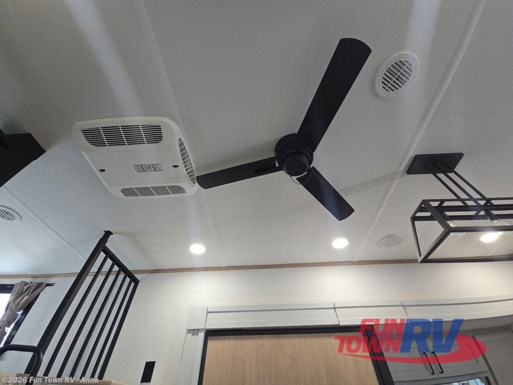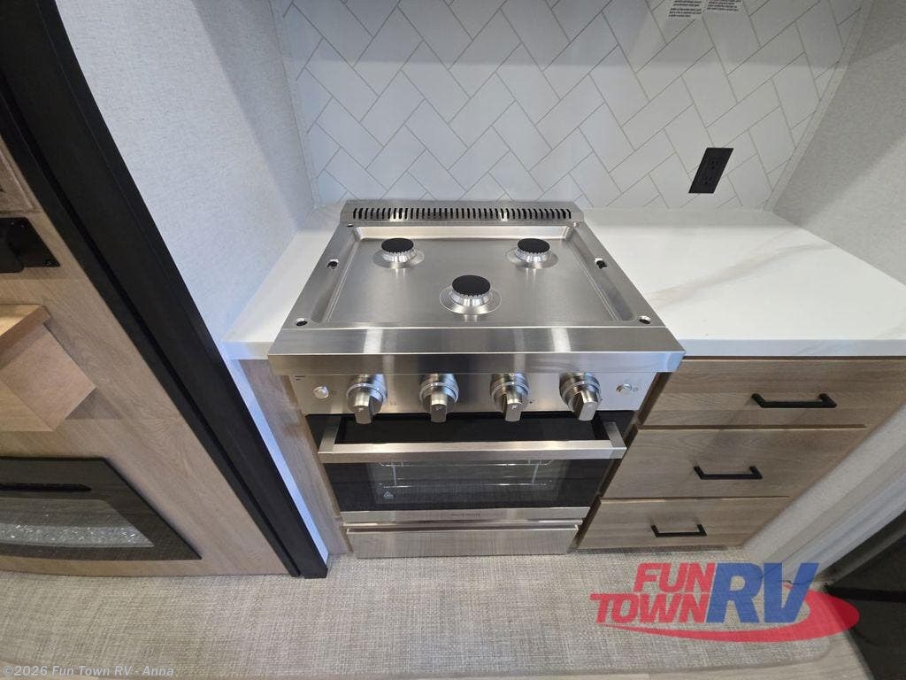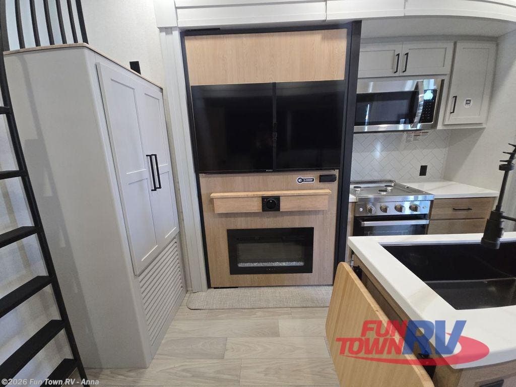 You won't believe the comfort and convenience found in this destination trailer. There are two private bedrooms; one up front with a queen bed slide out and storage space, and one in back with a queen bed slide out and a half bath! There is even washer and dryer prep here if you want to add those appliances and the second entry door is also found in this location so you can easily slip out in the morning. Above each of these rooms is a loft providing three total bunk mats for sleeping, storage cabinets, and TV prep if you want to add entertainment. Everyone can meet in the combined kitchen and living room that includes dual opposing slides, a 60" theater seating across from a 50" flat screen TV and fireplace, plus a free-standing table with chairs and a bench to dine at. The chef of your group will love the large kitchen island, Chef Collection three burner range, and a 16.2 cu. ft. refrigerator for food storage.
