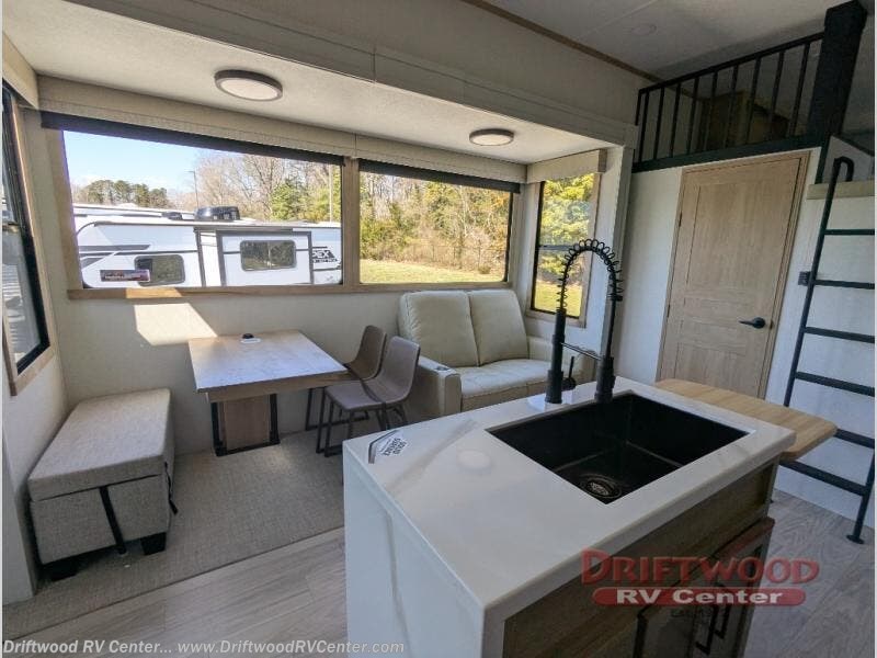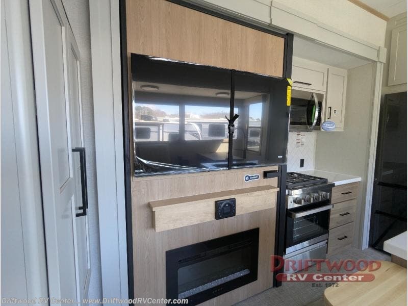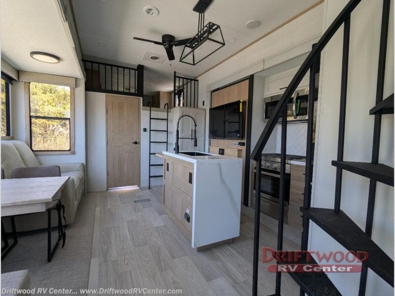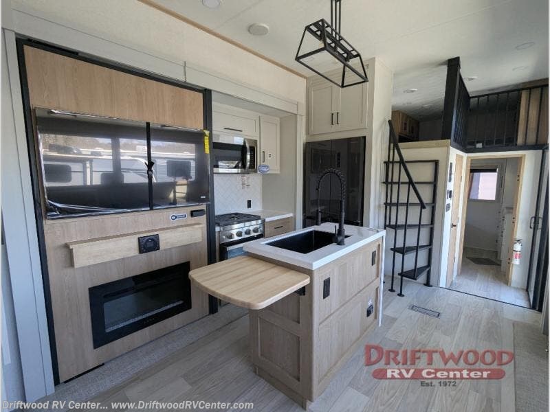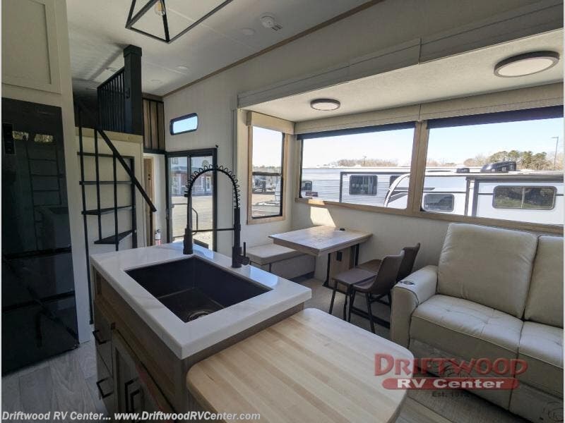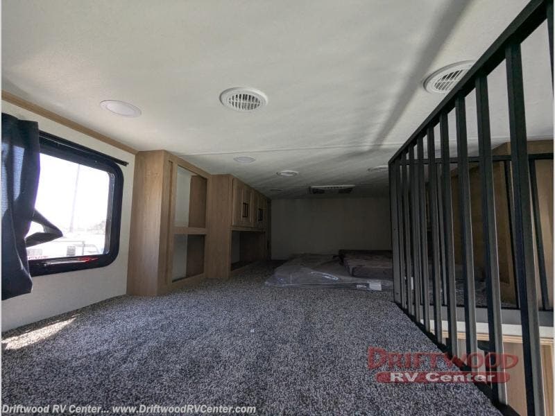 You won't believe the comfort and convenience found in this destination trailer. There are two private bedrooms; one up front with a queen bed slide out and storage space, and one in back with a queen bed slide out and a half bath! There is even washer and dryer prep here if you want to add those appliances and the second entry door is also found in this location so you can easily slip out in the morning. Above each of these rooms is a loft providing three total bunk mats for sleeping, storage cabinets, and TV prep if you want to add entertainment. Everyone can meet in the combined kitchen and living room that includes dual opposing slides, a 60" theater seating across from a 50" flat screen TV and fireplace, plus a free-standing table with chairs and a bench to dine at. The chef of your group will love the large kitchen island, Chef Collection three burner range, and a 16.2 cu. ft. refrigerator for food storage.