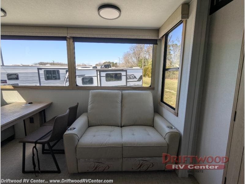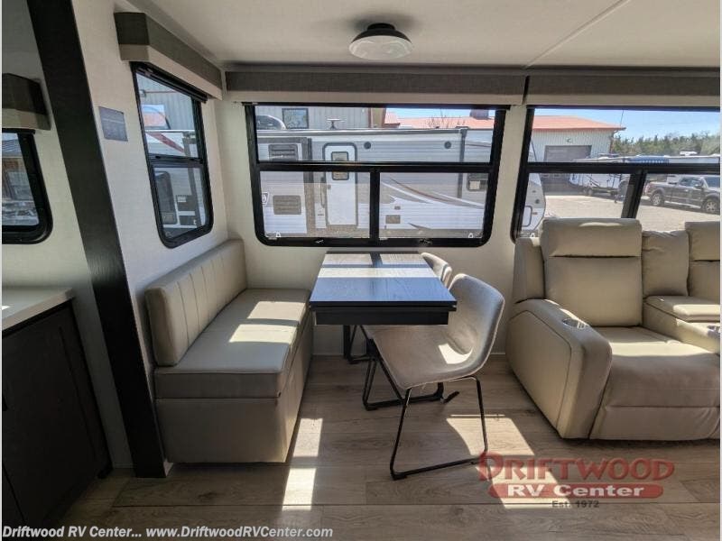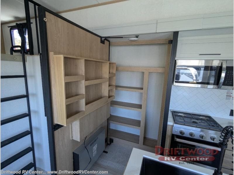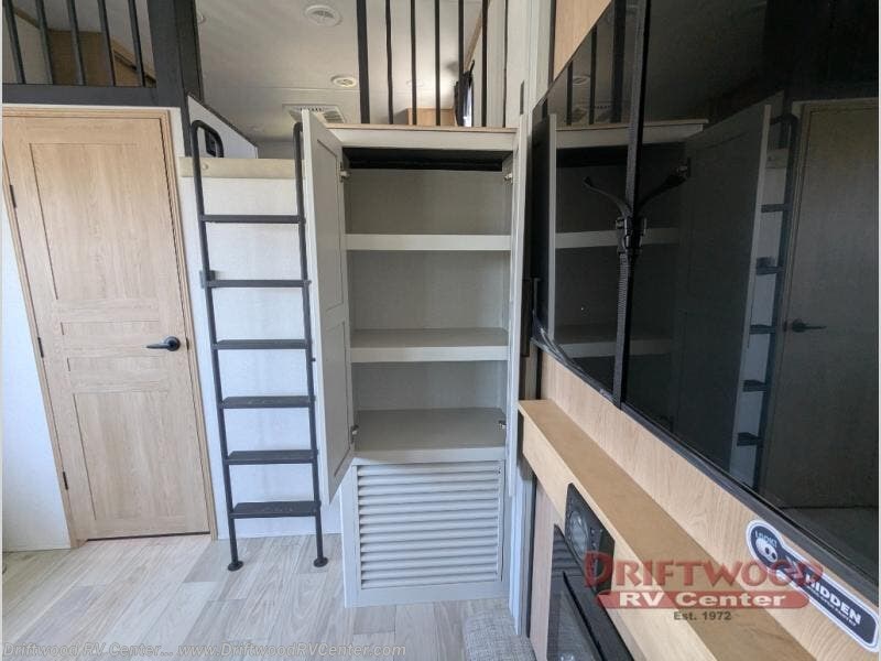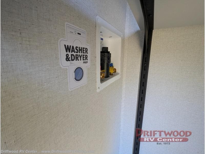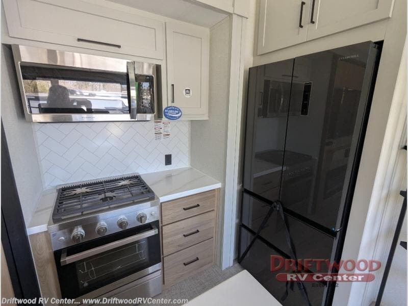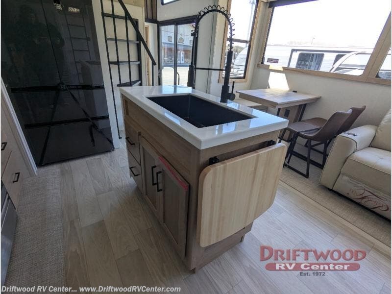 You won't believe the comfort and convenience found in this destination trailer. There are two private bedrooms; one up front with a queen bed slide out and storage space, and one in back with a queen bed slide out and a half bath! There is even washer and dryer prep here if you want to add those appliances and the second entry door is also found in this location so you can easily slip out in the morning. Above each of these rooms is a loft providing three total bunk mats for sleeping, storage cabinets, and TV prep if you want to add entertainment. Everyone can meet in the combined kitchen and living room that includes dual opposing slides, a 60" theater seating across from a 50" flat screen TV and fireplace, plus a free-standing table with chairs and a bench to dine at. The chef of your group will love the large kitchen island, Chef Collection three burner range, and a 16.2 cu. ft. refrigerator for food storage.