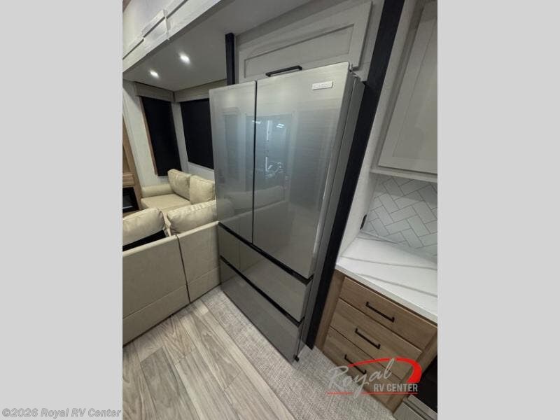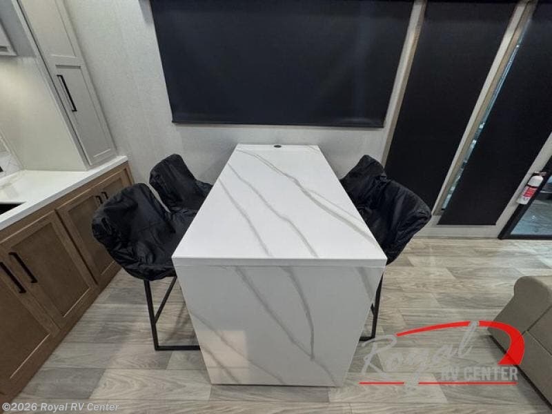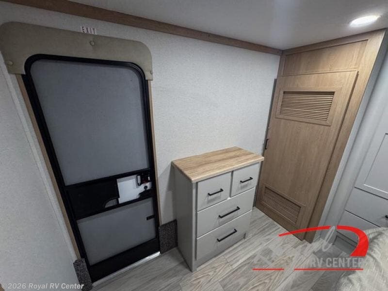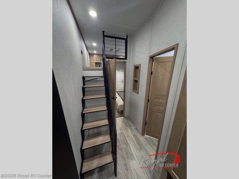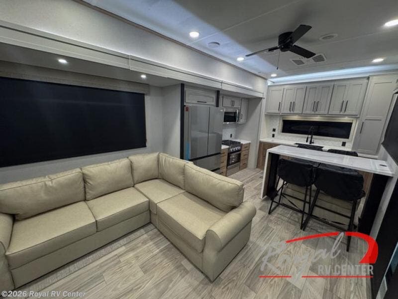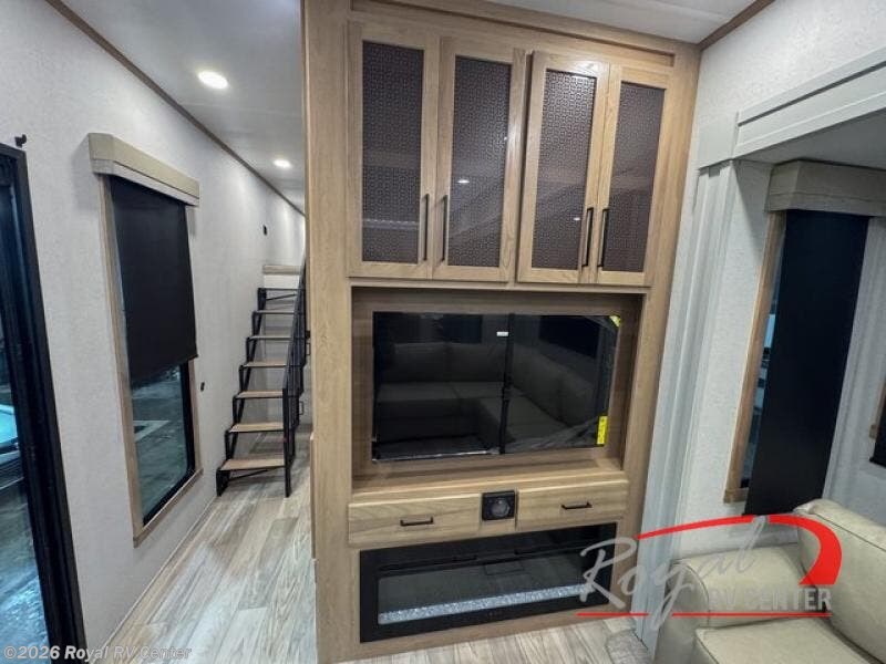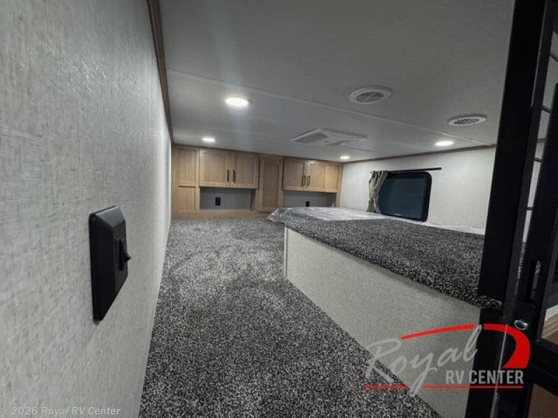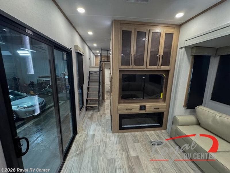 This incredible destination trailer has everything you need to live life to the fullest. Imagine retreating to a peaceful rear bedroom, complete with a king bed slide, spacious wardrobe, plus a closet with washer and dryer prep. Unwind and pamper yourself in style in the incredible full bathroom, featuring a linen closet, medicine cabinets, and a fiberglass shower with a seat. The living room is the heart of the home, boasting a comfortable sectional sofa, ottoman, and entertainment center perfect for gathering with family or friends and creating unforgettable memories. The loft is a cozy retreat for kids or guests, featuring two bunk mats, and a dual wardrobe/bookcases for their things. The front kitchen has a 19 cu. ft. refrigerator, overhead cabinet, microwave, three-burner cooktop, and free-standing dinette with a waterfall edge, and the pantry provides ample storage for all your favorite foods. Finally, step outside and enjoy the shade and protection of the two awnings and the two entry and two exit doors will make it easy to come and go.