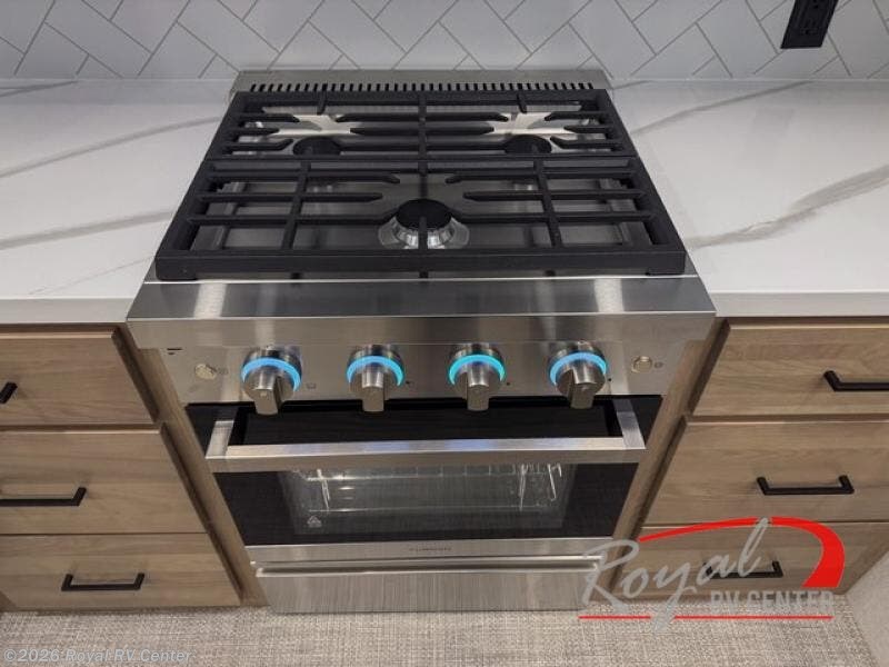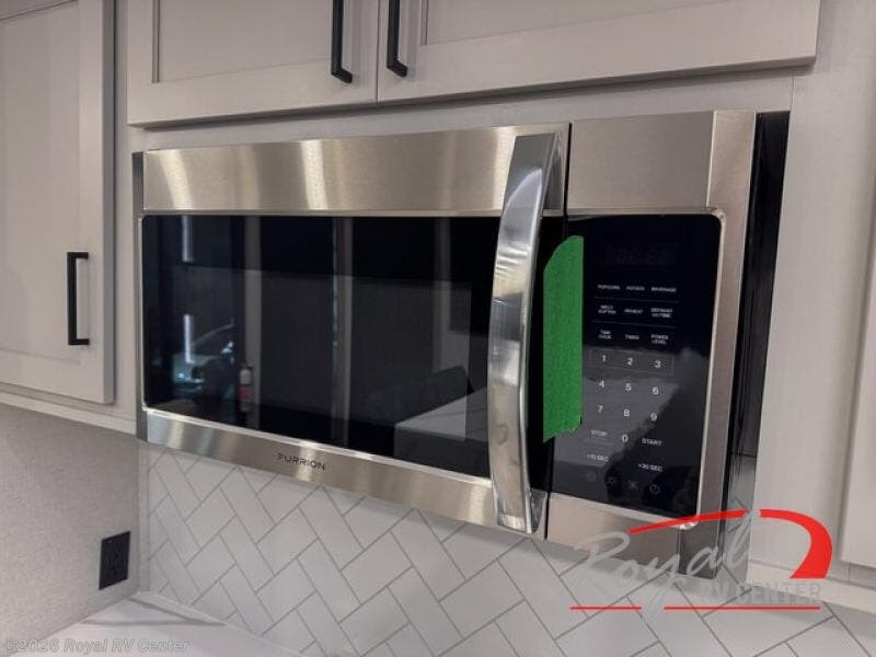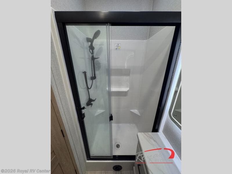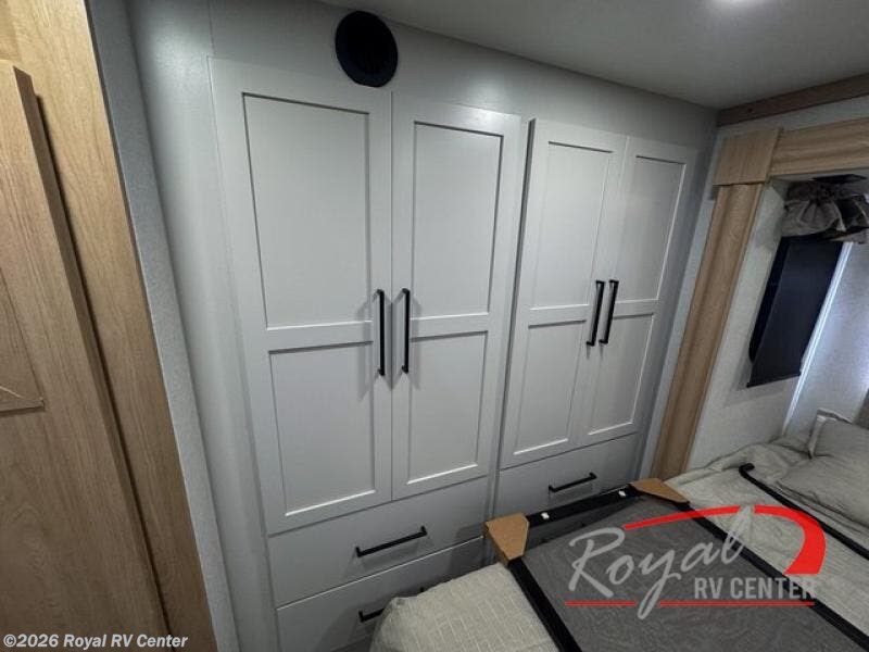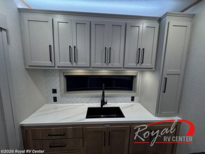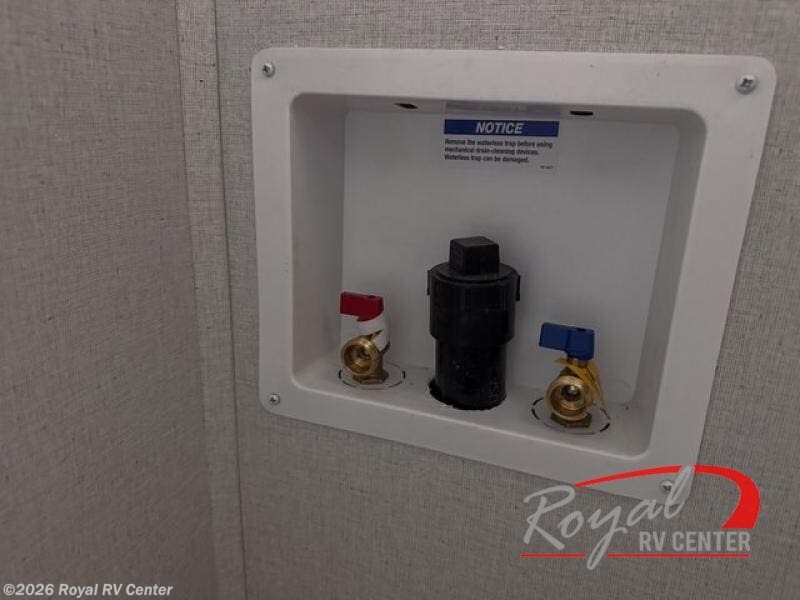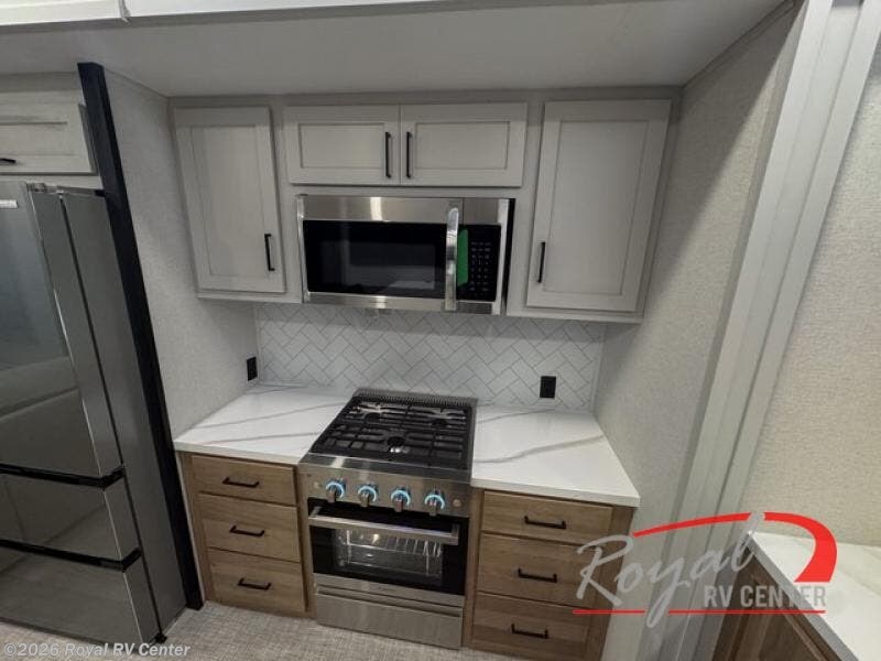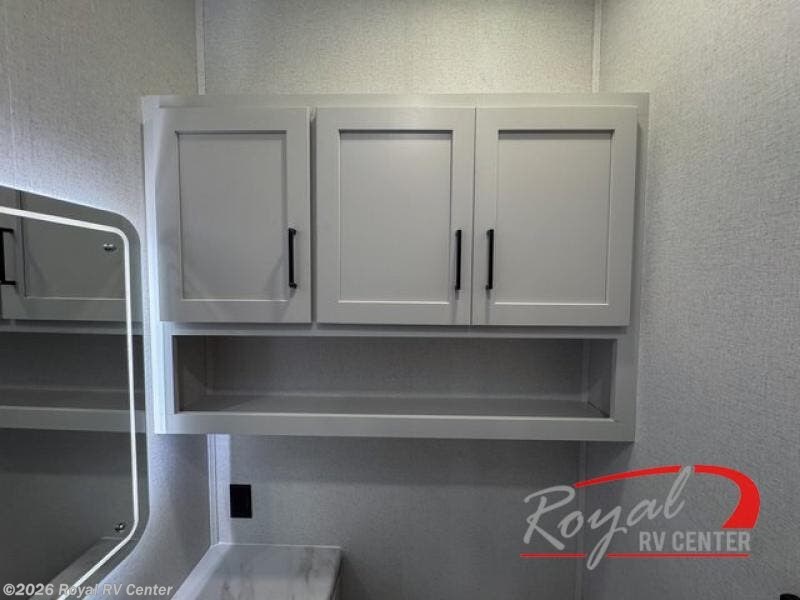 This incredible destination trailer has everything you need to live life to the fullest. Imagine retreating to a peaceful rear bedroom, complete with a king bed slide, spacious wardrobe, plus a closet with washer and dryer prep. Unwind and pamper yourself in style in the incredible full bathroom, featuring a linen closet, medicine cabinets, and a fiberglass shower with a seat. The living room is the heart of the home, boasting a comfortable sectional sofa, ottoman, and entertainment center perfect for gathering with family or friends and creating unforgettable memories. The loft is a cozy retreat for kids or guests, featuring two bunk mats, and a dual wardrobe/bookcases for their things. The front kitchen has a 19 cu. ft. refrigerator, overhead cabinet, microwave, three-burner cooktop, and free-standing dinette with a waterfall edge, and the pantry provides ample storage for all your favorite foods. Finally, step outside and enjoy the shade and protection of the two awnings and the two entry and two exit doors will make it easy to come and go.