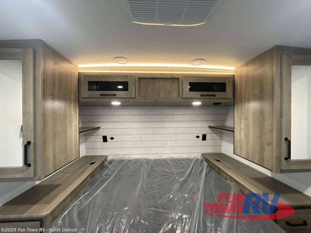 Whether you are looking for a bunkhouse, a private bedroom, or dual entry doors in your next RV, this one might just be the perfect fit with all those features! There are 45" x 72" bunk beds, each with their own wardrobe and their own private entry door, making it perfect for camping with older kids. The galley kitchen offers amenities such as a microwave, cooktop, an 11 cu. ft. refrigerator, and an L-shaped counter for preparing and serving meals. You will also find more storage, an entertainment center and a slide out sofa sleeper and booth dinette that offer more sleeping space when needed.