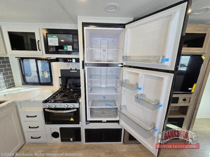 Whether you are looking for a bunkhouse, a private bedroom, or dual entry doors in your next RV, this one might just be the perfect fit with all those features! There are 45" x 72" bunk beds, each with their own wardrobe and their own private entry door, making it perfect for camping with older kids. The galley kitchen offers amenities such as a microwave, cooktop, an 11 cu. ft. refrigerator, and an L-shaped counter for preparing and serving meals. You will also find more storage, an entertainment center and a slide out sofa sleeper and booth dinette that offer more sleeping space when needed.