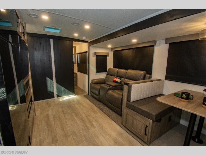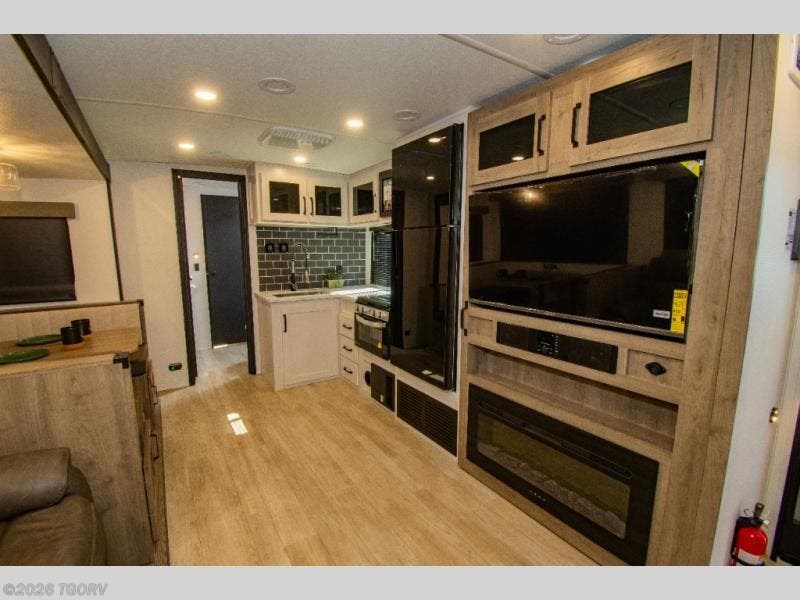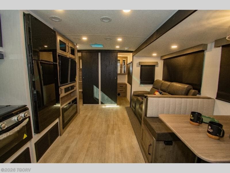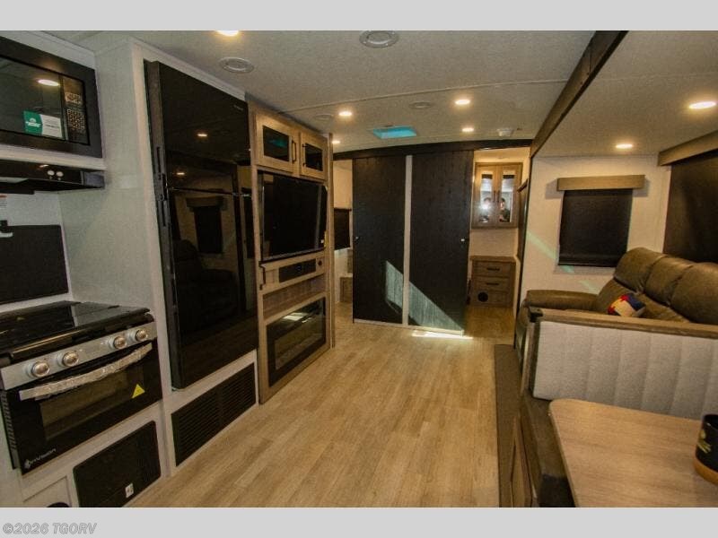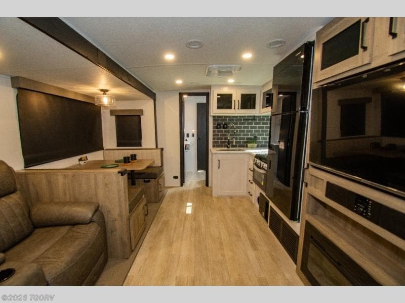 In the main living area, a slide-out sofa sleeper and booth dinette create flexible seating and sleeping options, while the entertainment center adds a comfortable place to relax at the end of the day. The walk-through bath offers convenient access from multiple areas of the trailer, helping keep traffic flowing smoothly when traveling with a group.