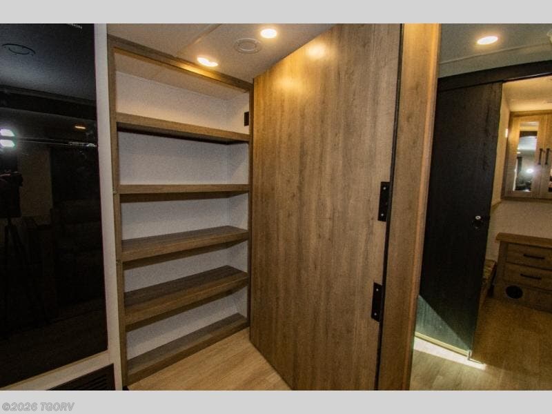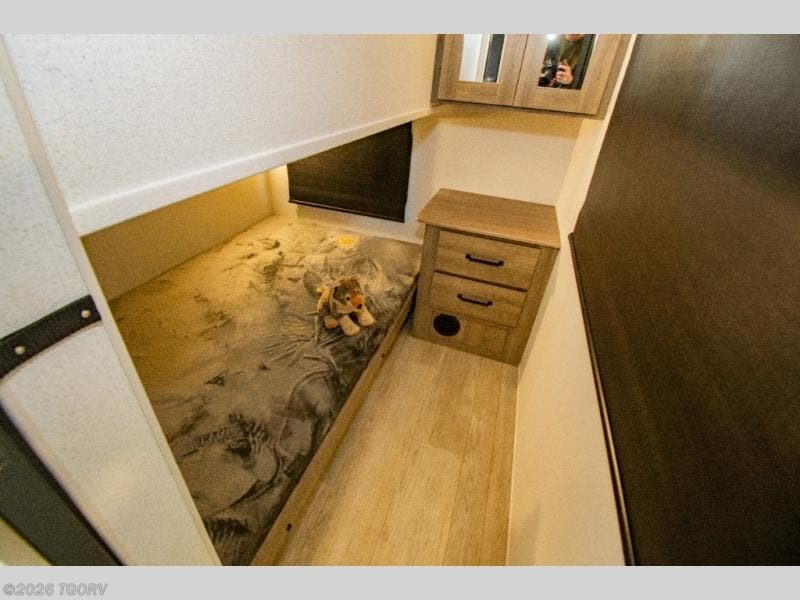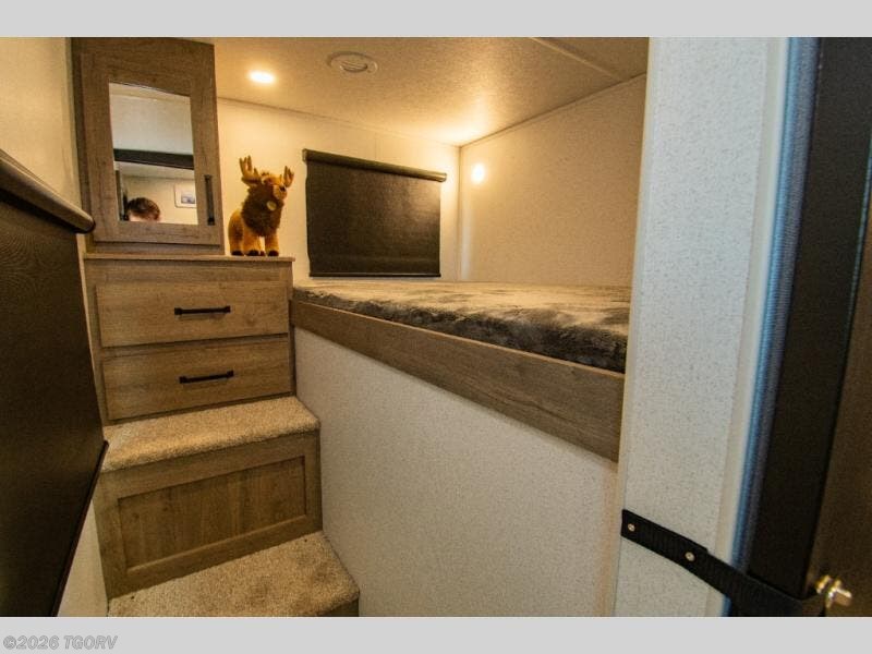 One of the standout features of this floorplan is the two private bunkhouses, each equipped with 45" x 72" bunk beds, their own wardrobe, and a separate exterior entry door. This setup works especially well for older kids or guests who want a little more independence without giving up comfort.
