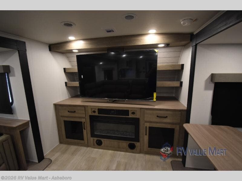 This travel trailer will feel just like home with its front living area, master bedroom, and triple slides for more space! You'll enjoy the sectional sofa and 63" dinette with two chairs on one side with a bench seat on the other. There is a front entertainment center where you can add an optional TV, and the fireplace will make it more cozy. A middle kitchen includes all the appliances to make meals each day, plus an electric refrigerator and pantry for food storage. Head towards the back to find the master bedroom with a king bed slide out, dual wardrobes, and a desk with drawers if you need to get some work done. And the full rear bath is super accommodating with its dual bath sinks plus washer and dryer prep!