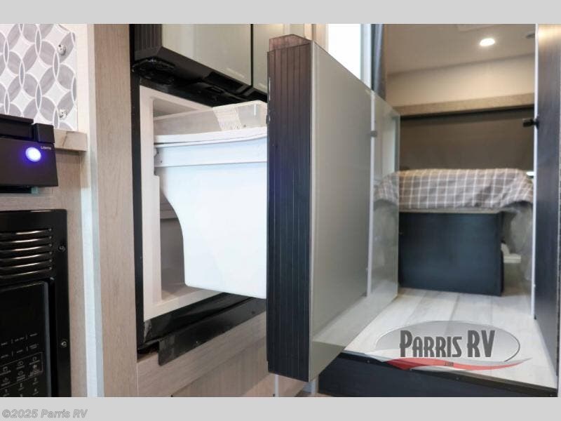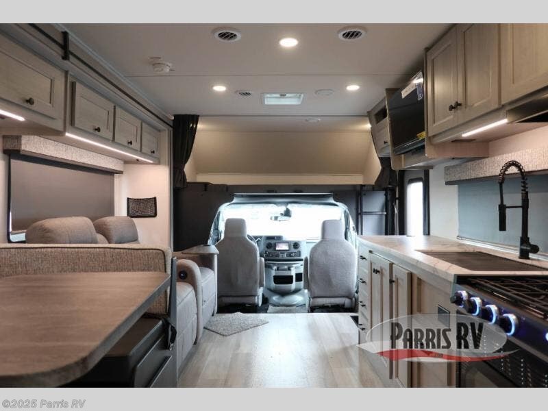Pack your bags and pick your favorite destination then head out in this motorhome! The rear private bedroom has a 60" x 74" queen bed slide for more interior space, and a linen closet with wardrobes on either side of it. There is also a split-style bath with a private toilet and sink, and the shower is right across the hall. Prepare your best home cooked meals using the three burner cooktop, enjoy dining at the U-shaped dinette, and store any leftovers in the 10.7 cu. ft. 12V refrigerator. You will also appreciate the flip-up countertop for more meal prepping space. Relax each evening on the 66" sofa, or you can replace it for the optional power theater seating. There is even a 60" x 80" bunk over the cab for extra sleeping or storage space!