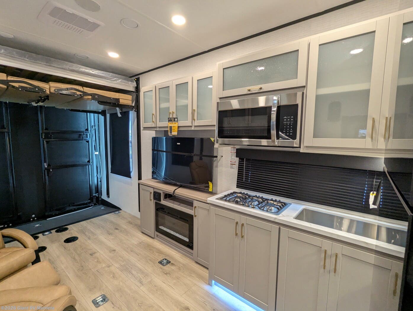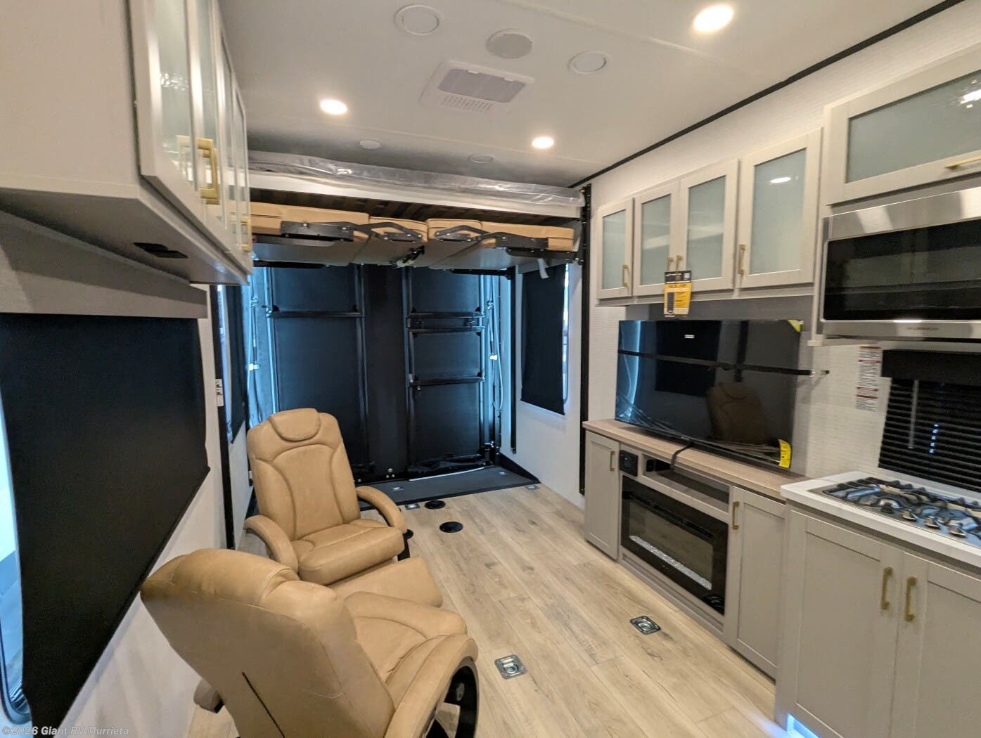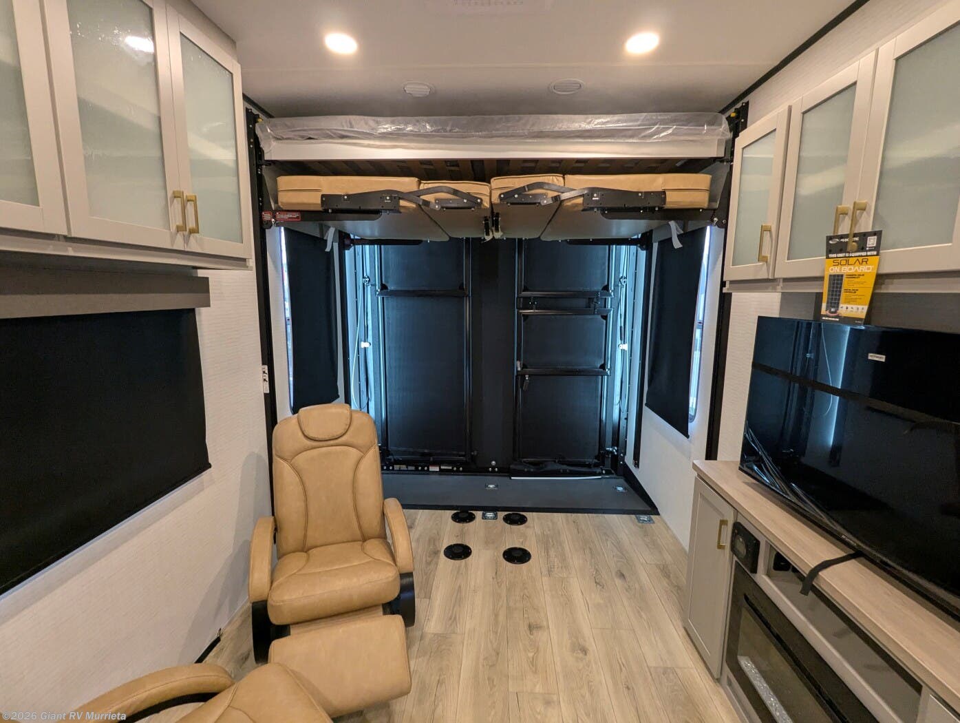 - Versatile 15’7" Garage Space featuring a heavy-duty 3,000 lb. ramp door, 5,000 lb. tie-downs, and an electric drop-down bed that transforms into a dinette or extra sleeping space once the toys are unloaded.