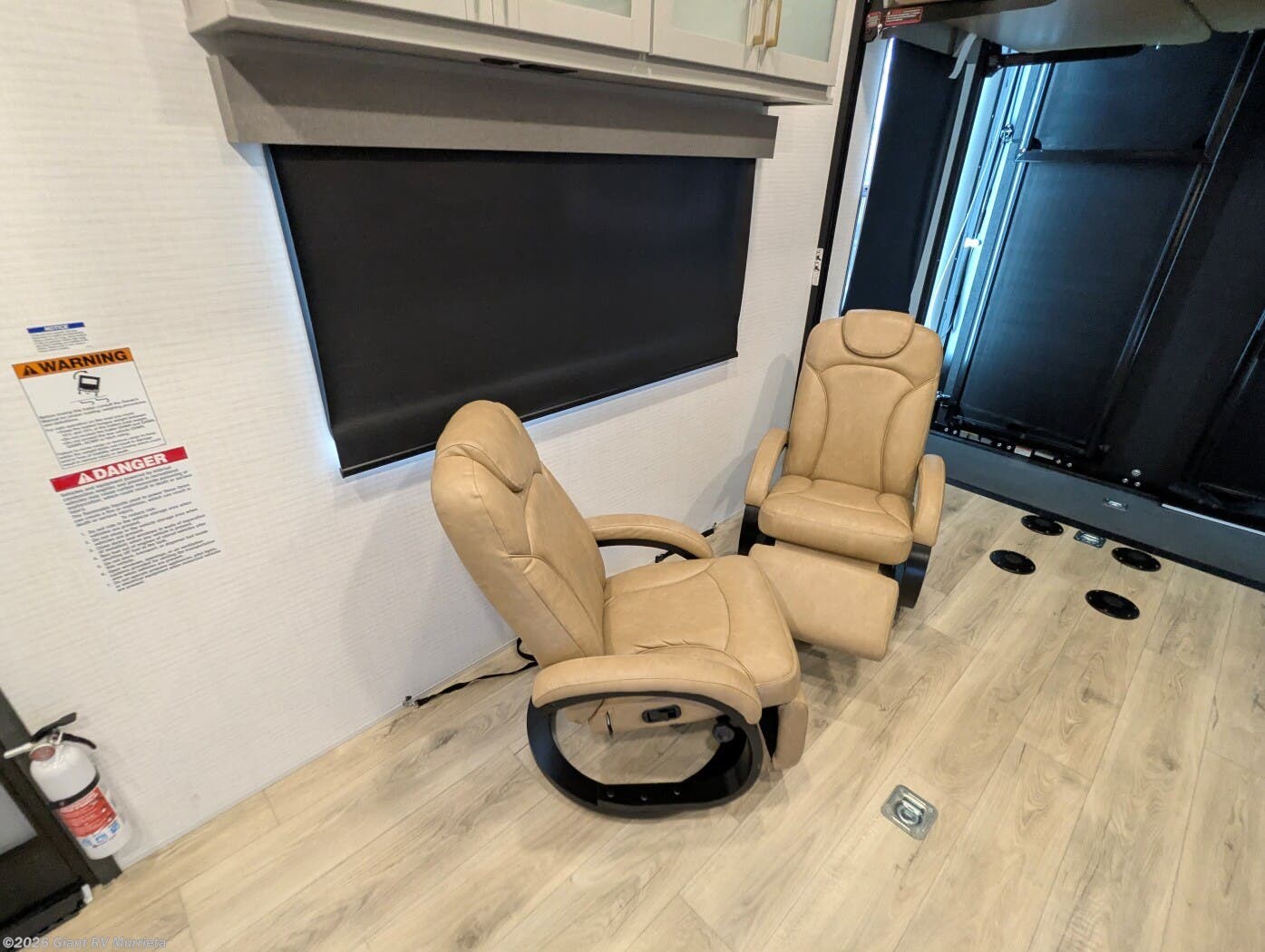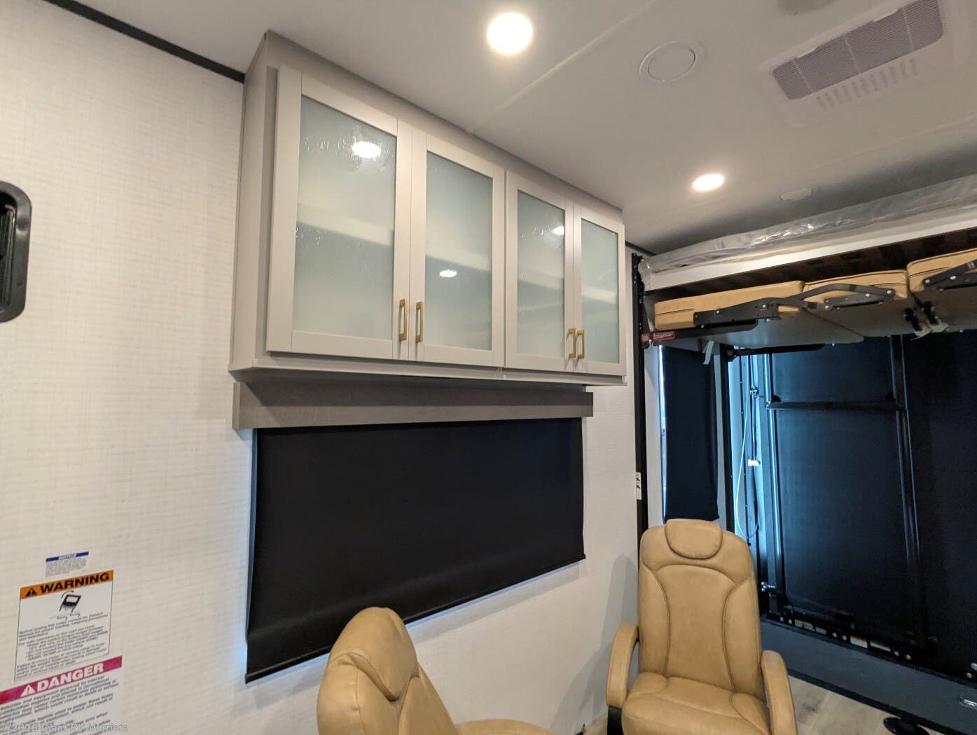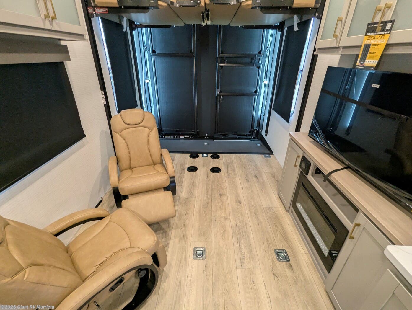 - Versatile 15’7" Garage Space featuring a heavy-duty 3,000 lb. ramp door, 5,000 lb. tie-downs, and an electric drop-down bed that transforms into a dinette or extra sleeping space once the toys are unloaded.