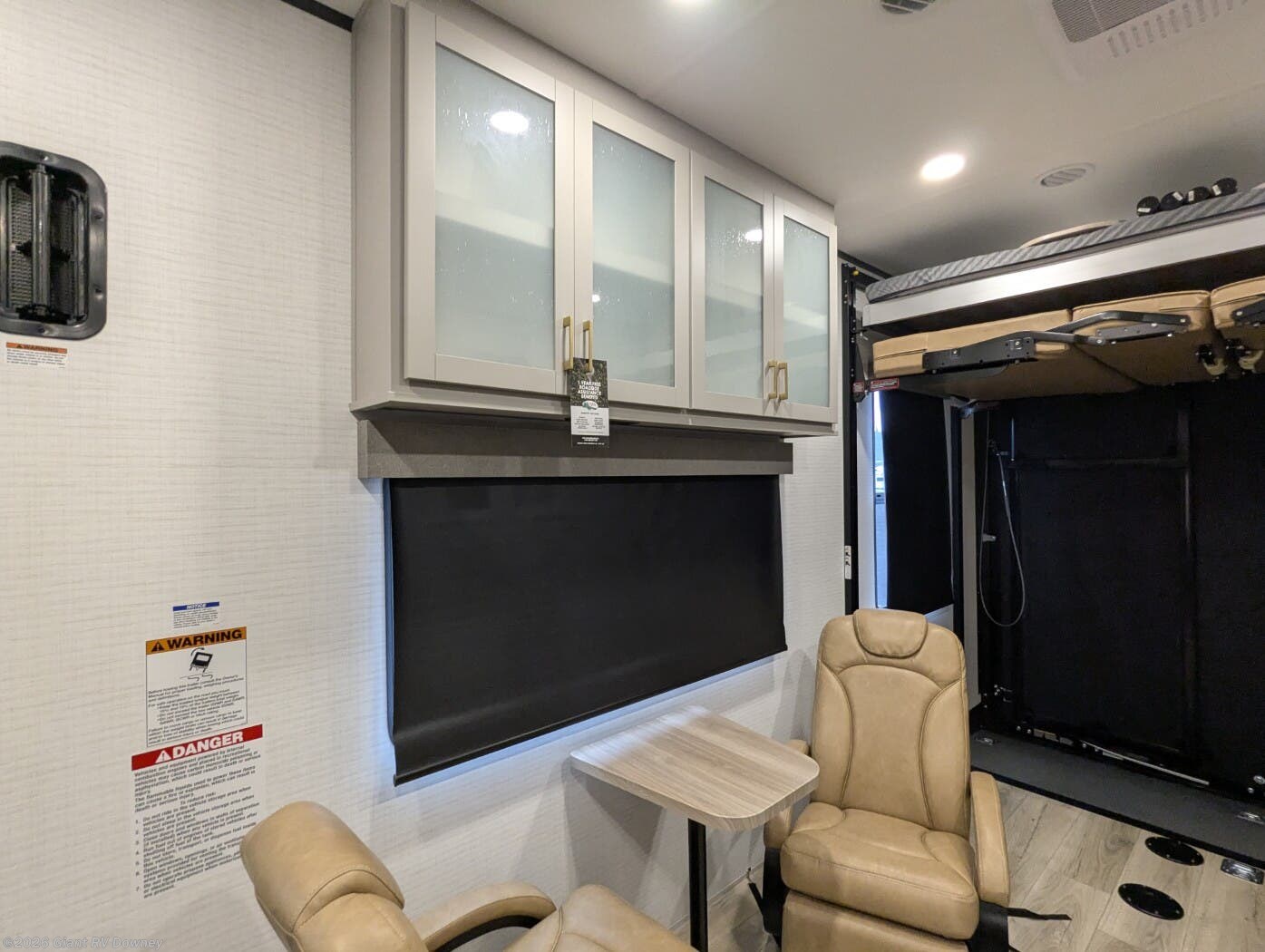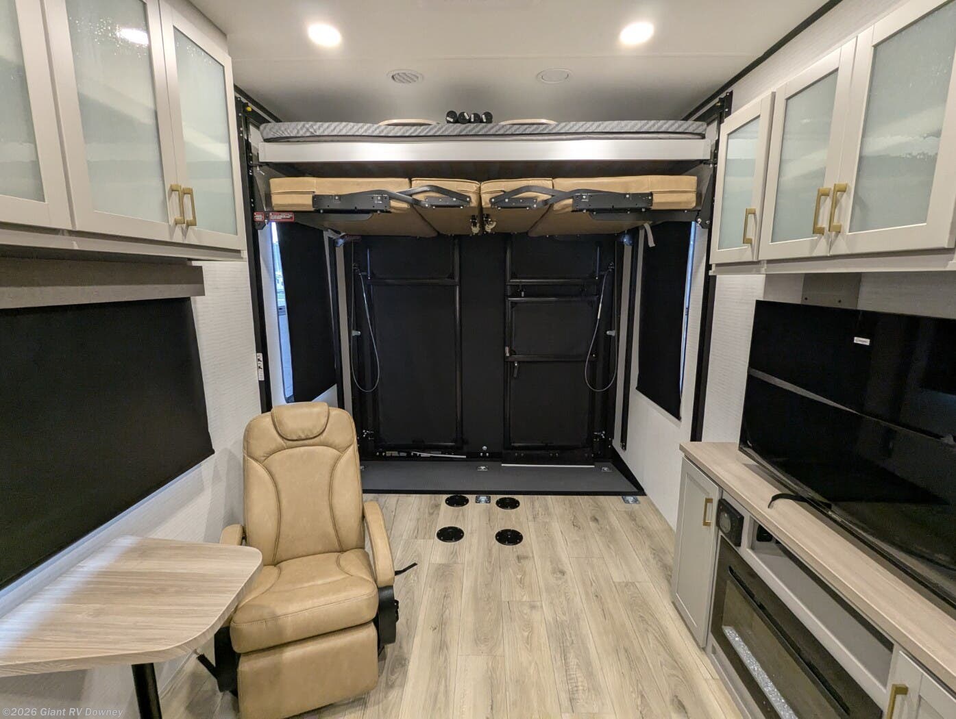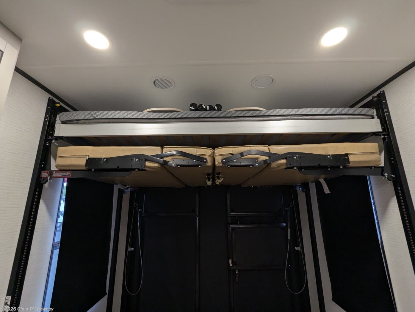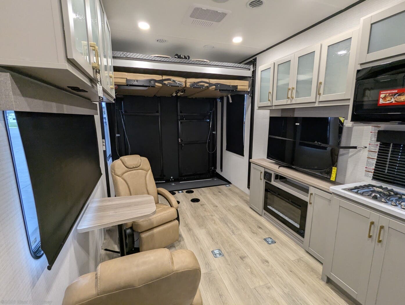 - Versatile 15’7" Garage Space featuring a heavy-duty 3,000 lb. ramp door, 5,000 lb. tie-downs, and an electric drop-down bed that transforms into a dinette or extra sleeping space once the toys are unloaded.