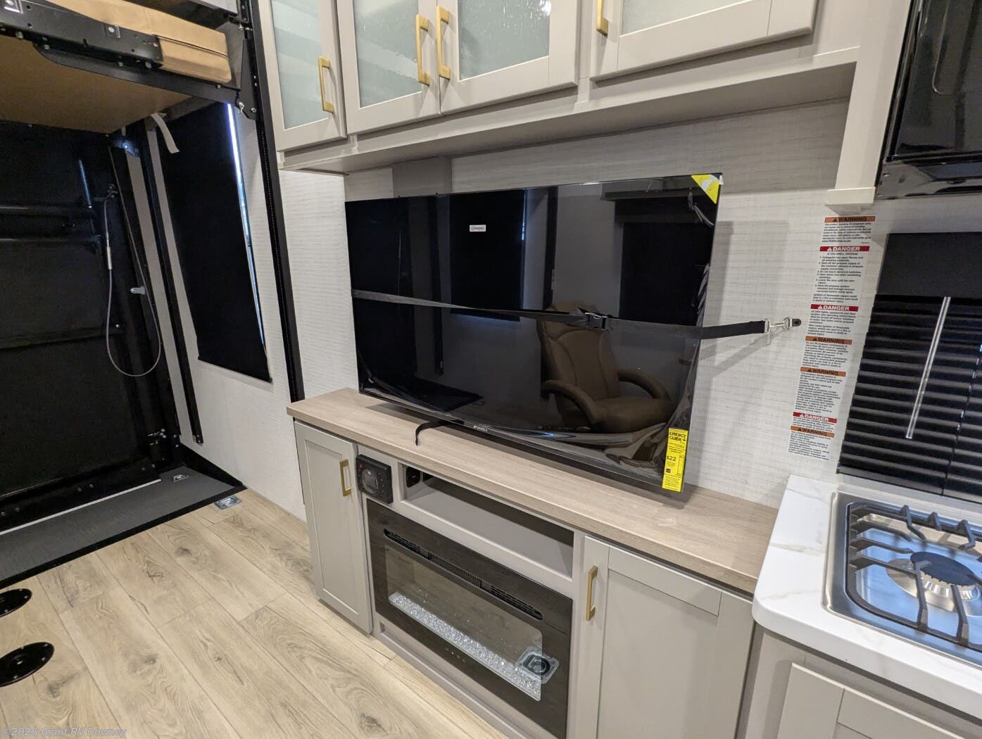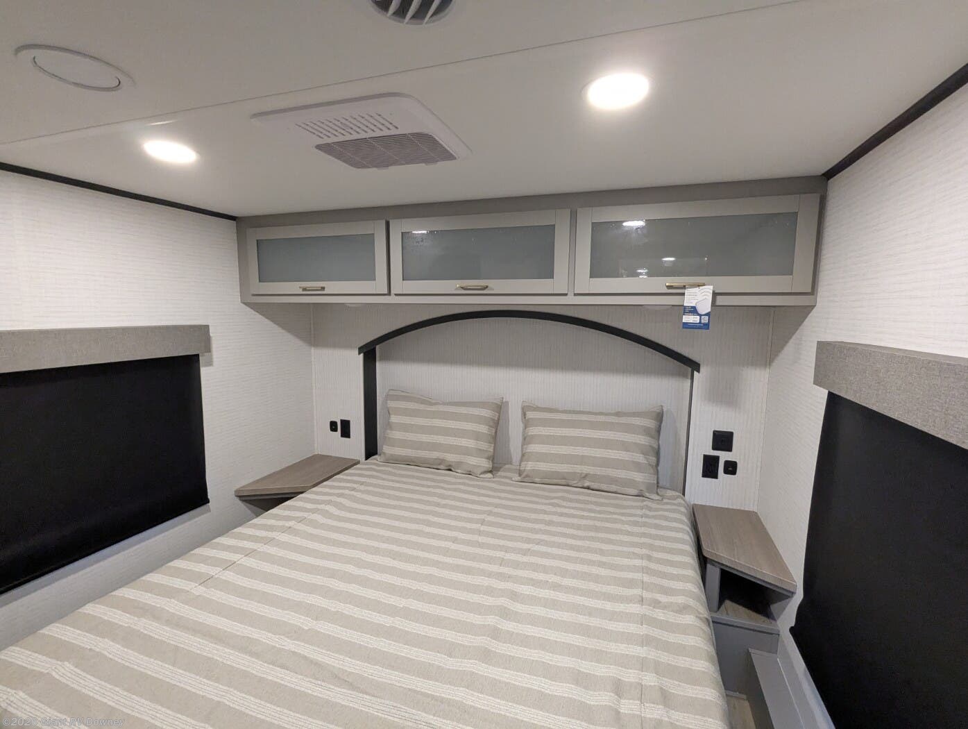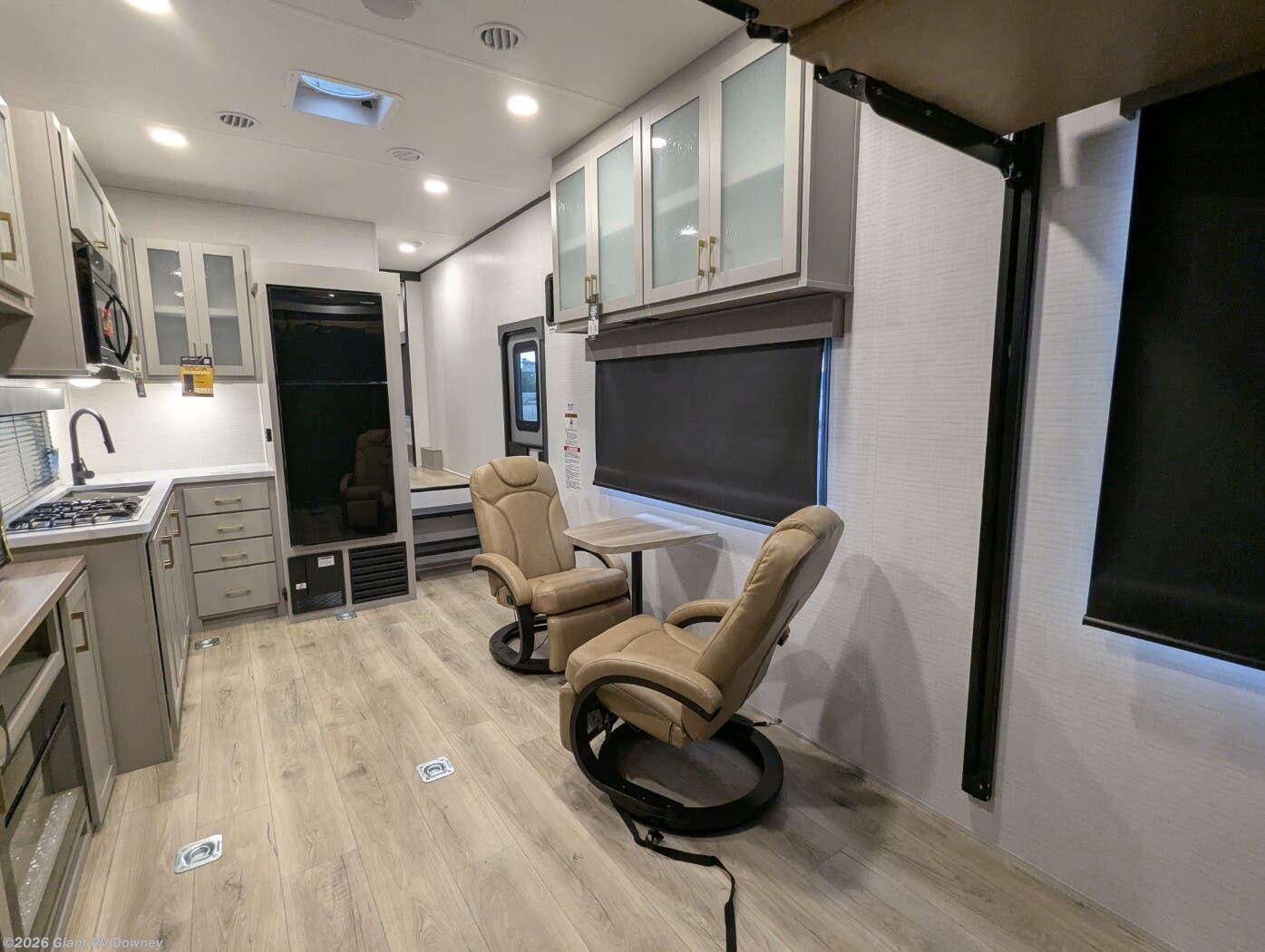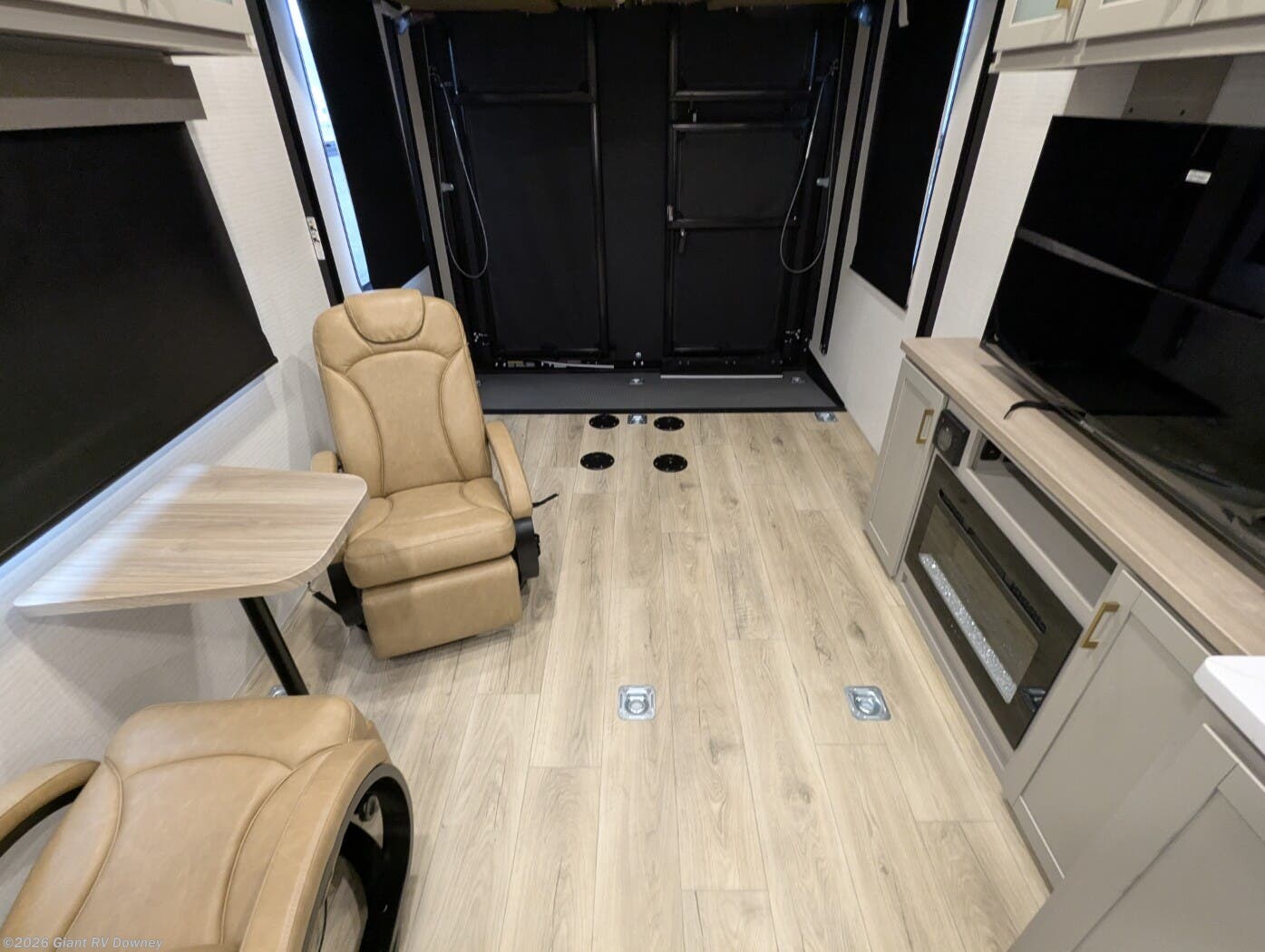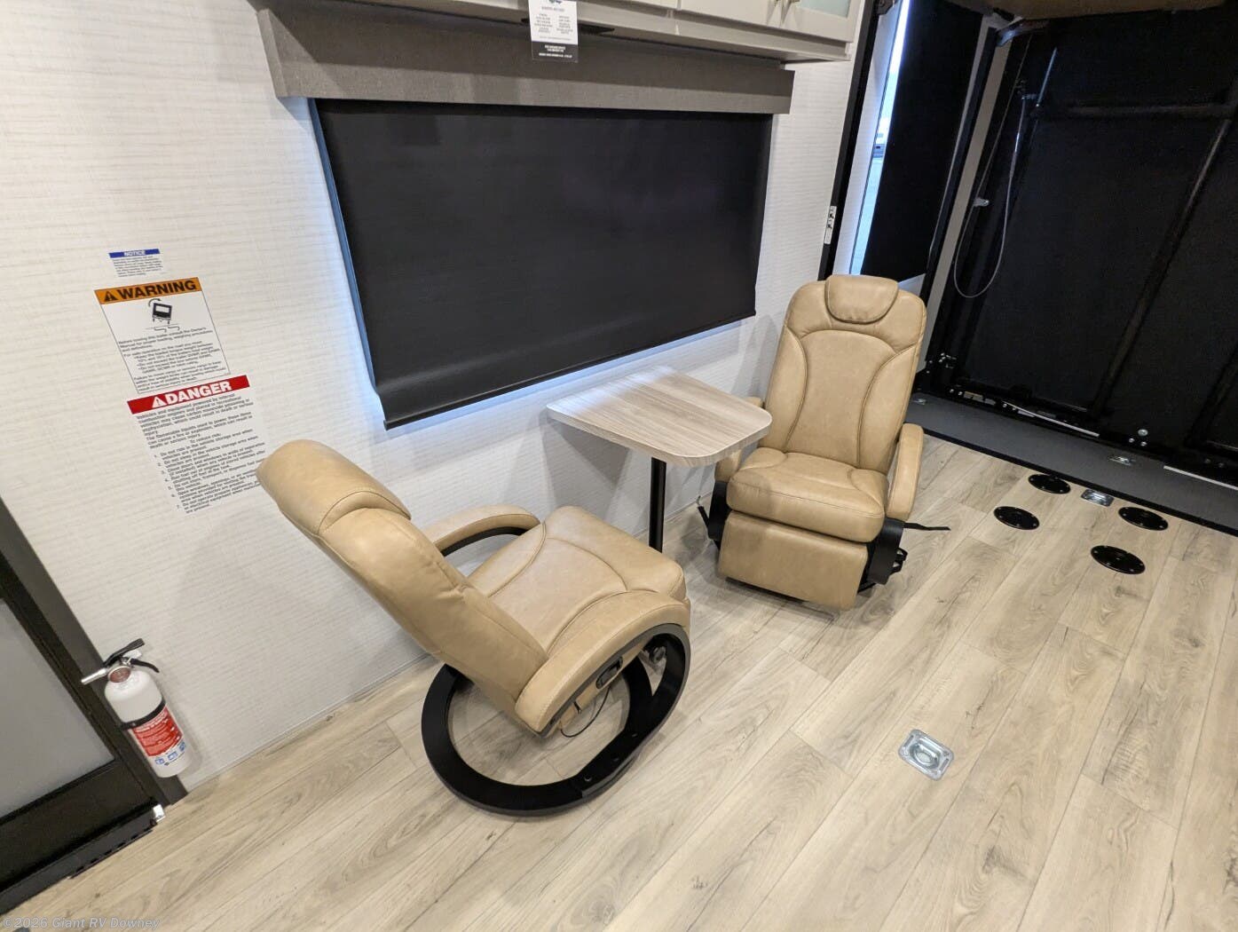 - Versatile 15’7" Garage Space featuring a heavy-duty 3,000 lb. ramp door, 5,000 lb. tie-downs, and an electric drop-down bed that transforms into a dinette or extra sleeping space once the toys are unloaded.