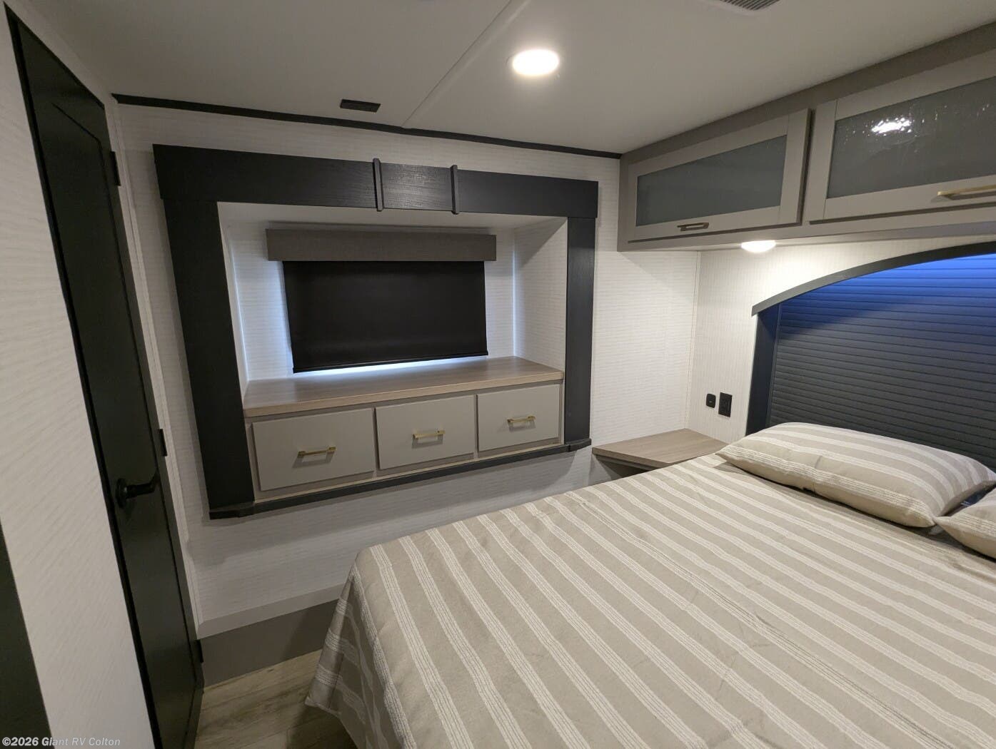 - Private Front Bedroom with a comfortable queen bed, overhead storage, and separation from the main living space for added privacy.