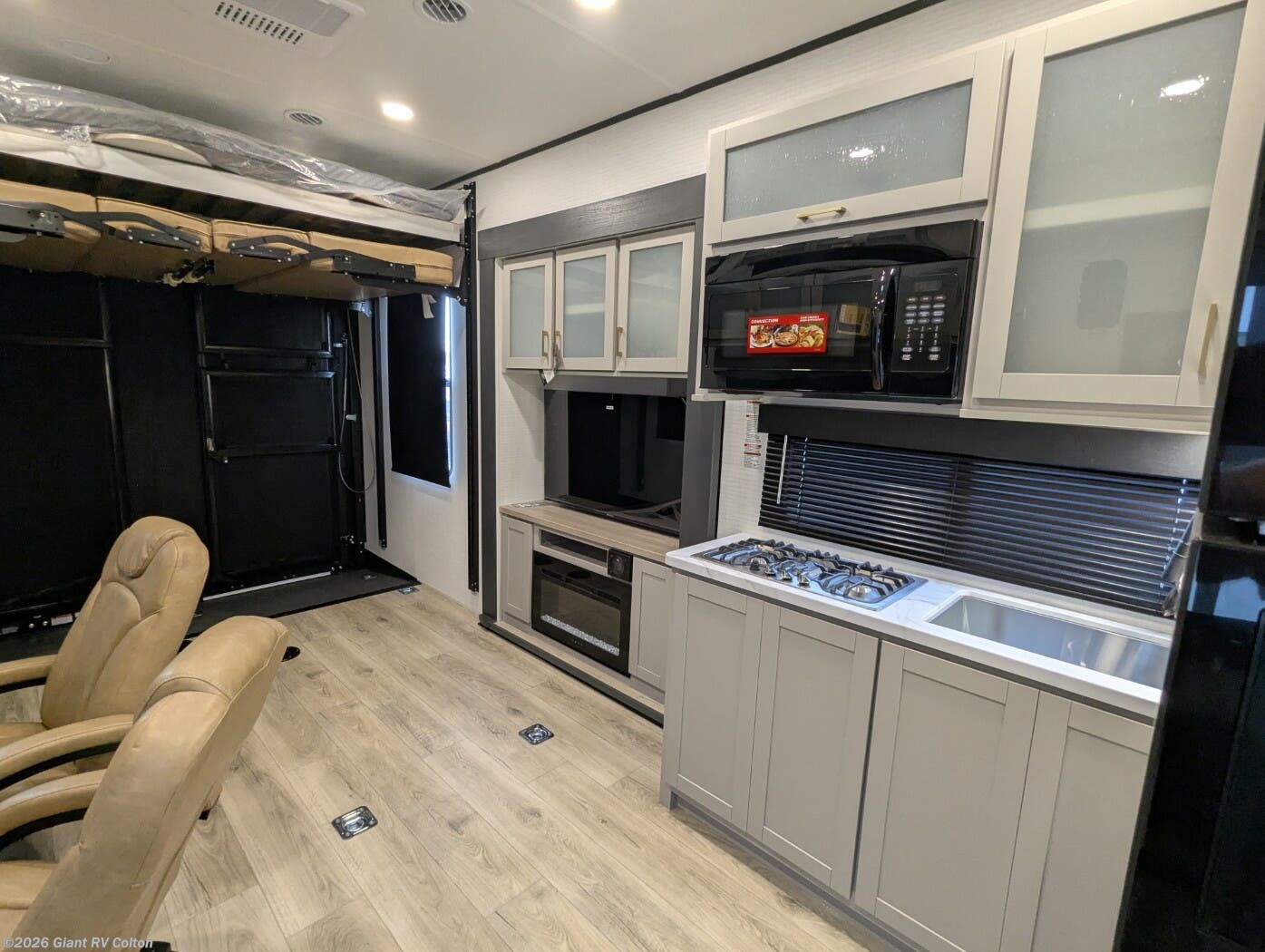 - Open Kitchen & Living Area offering generous countertop space, residential-style appliances, flexible seating, and convertible sleeping options in the rear garage.
