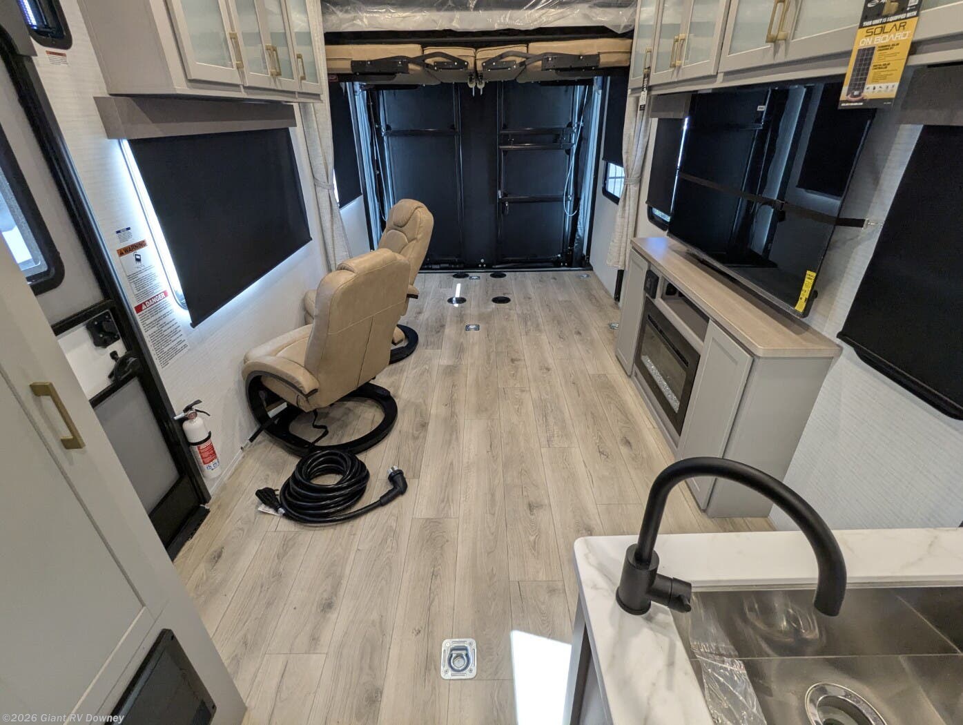 - Toy Hauler Garage: Sleeps up to 6 with a versatile garage for ATVs, dual entry bath, entertainment center, and drop-down electric bed for flexible loading and living space.