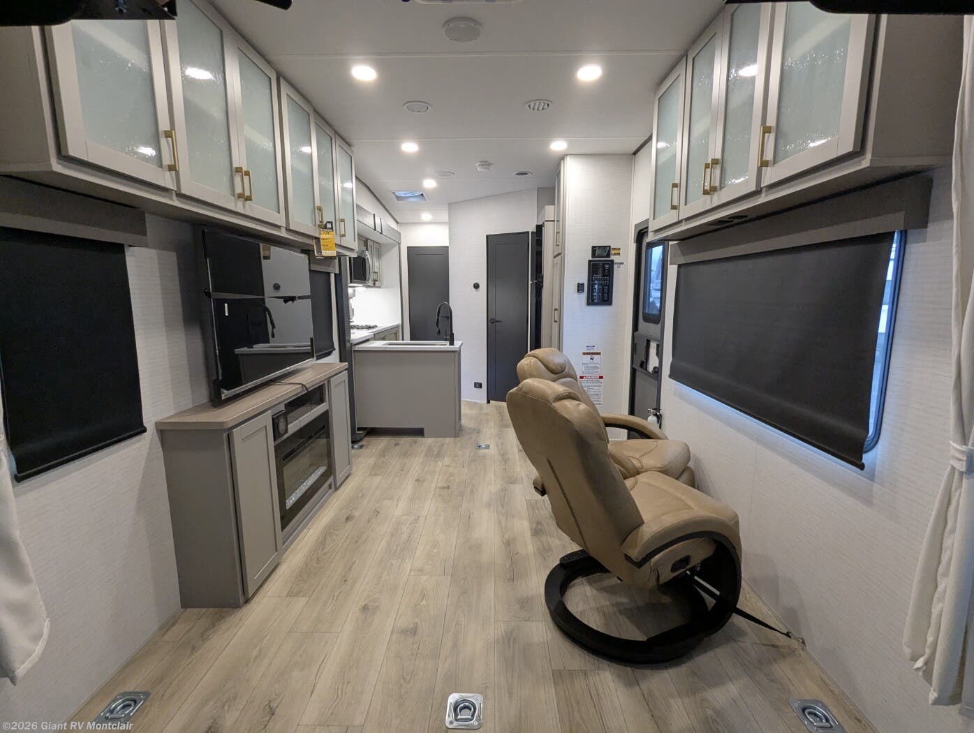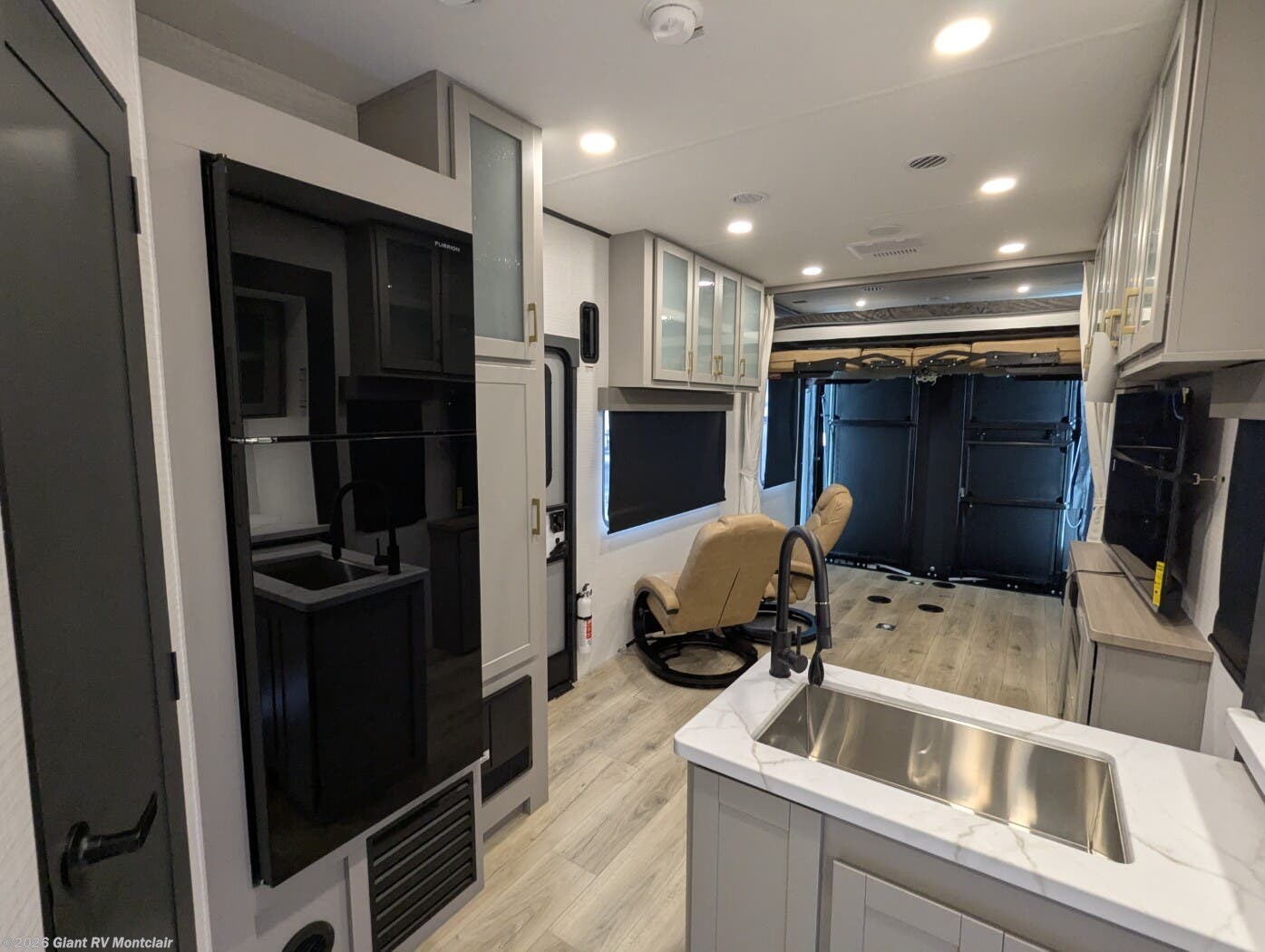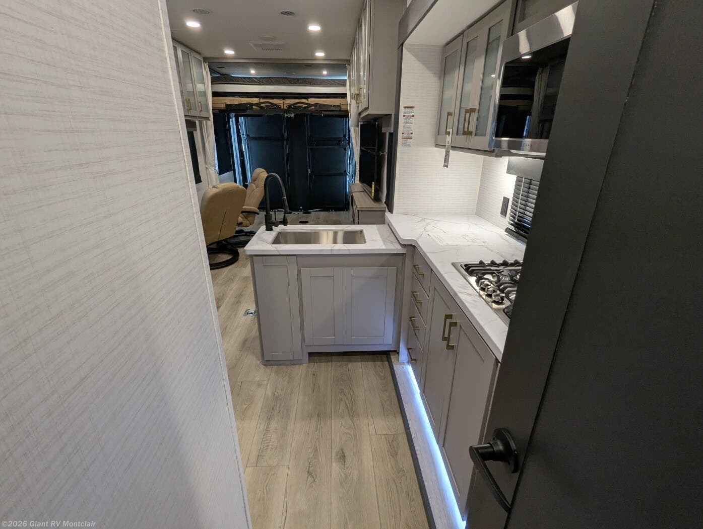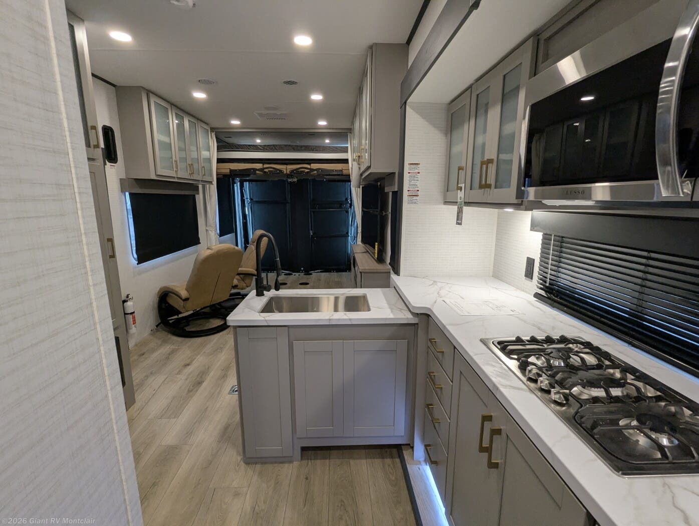 - Open Kitchen & Living Area with solid-surface countertops, residential-style appliances, a dinette or sofa setup, and flexible sleeping options in the rear garage when needed.