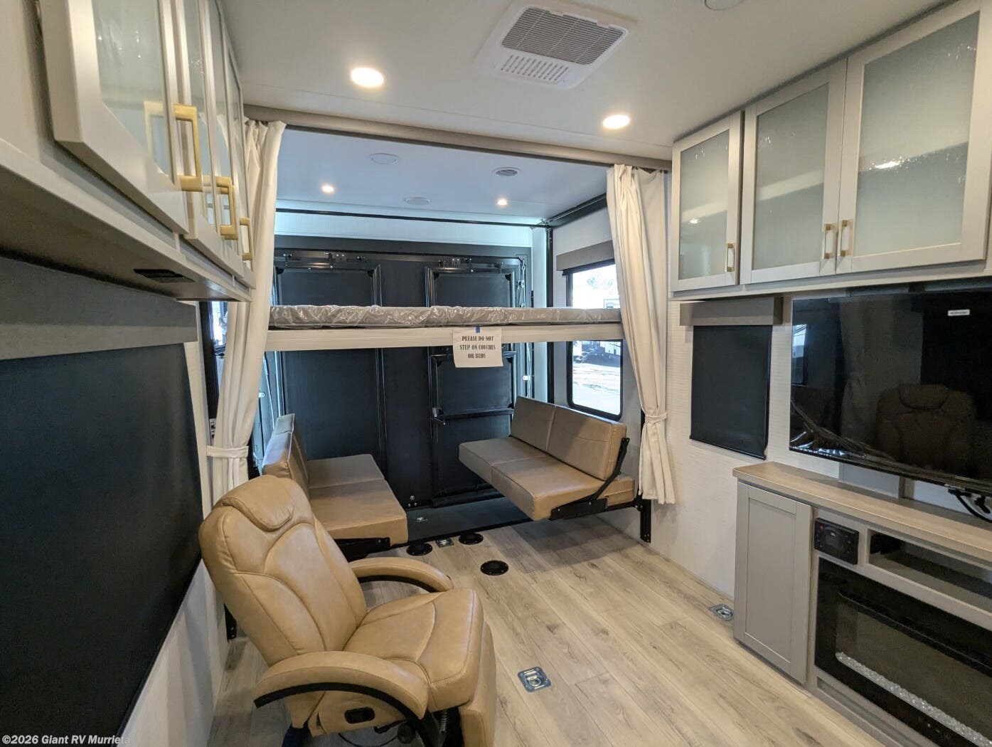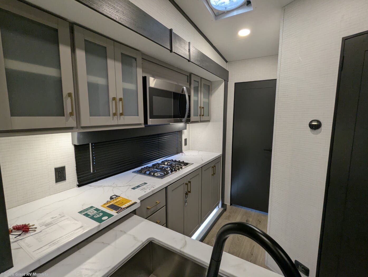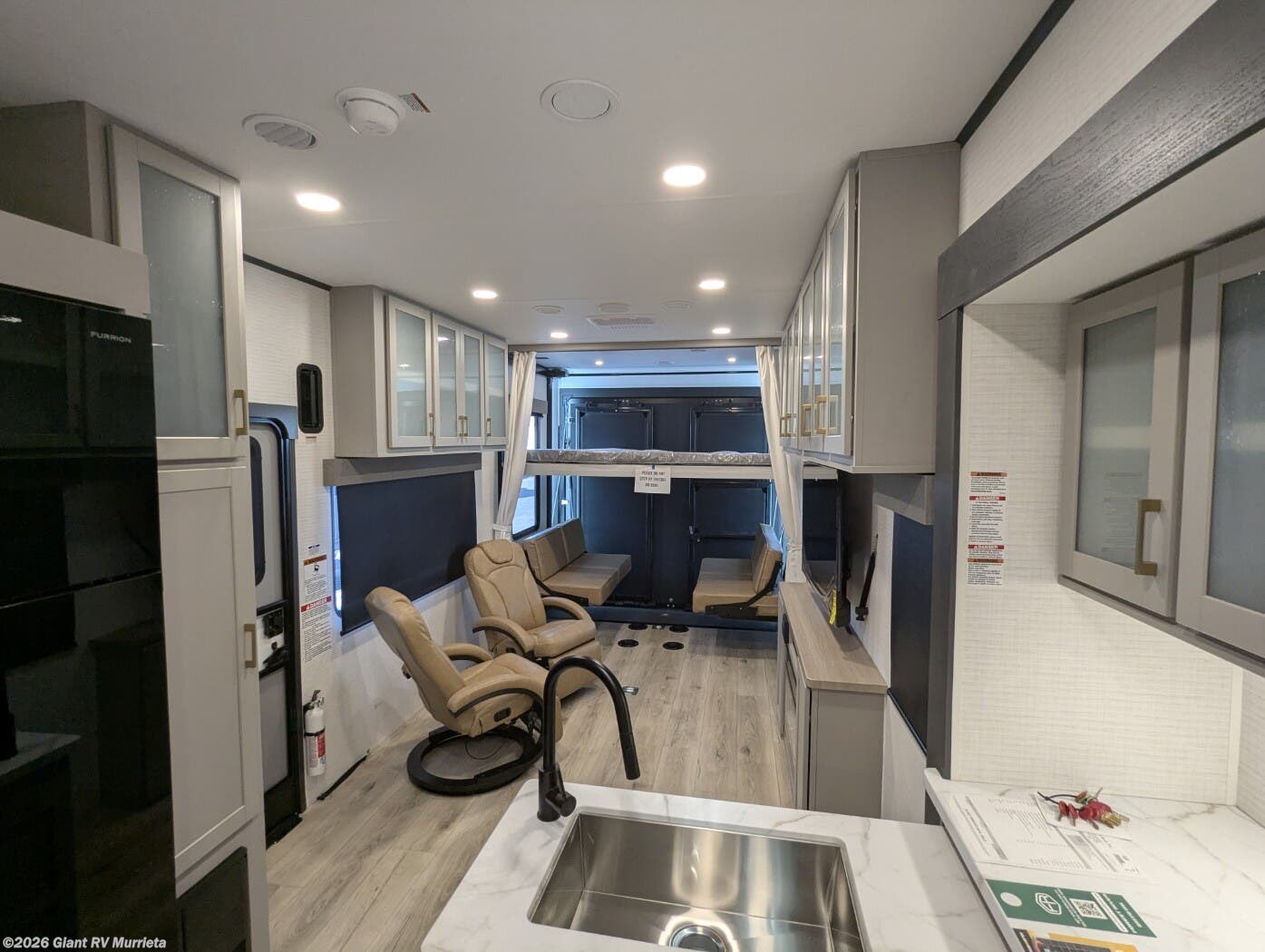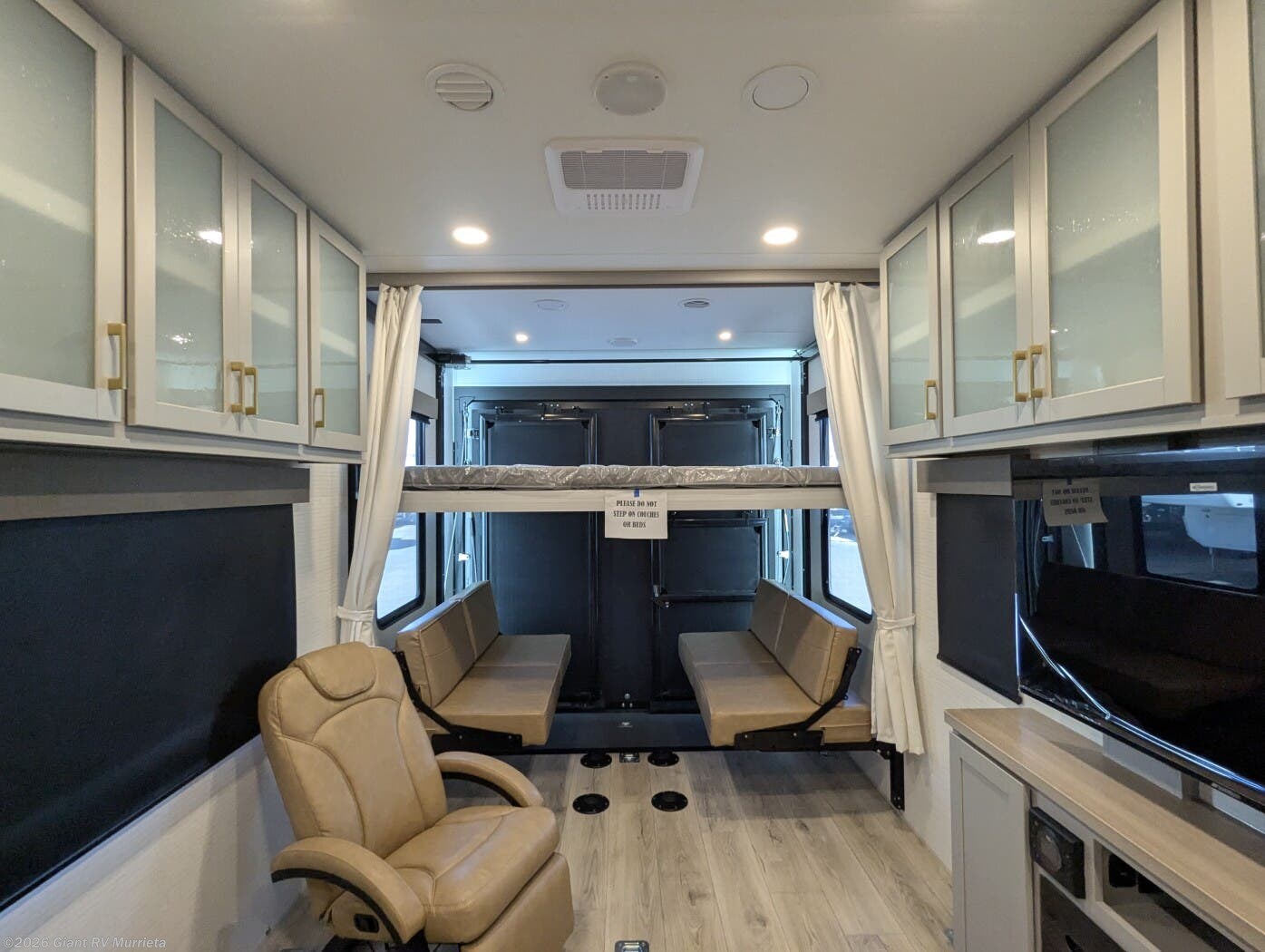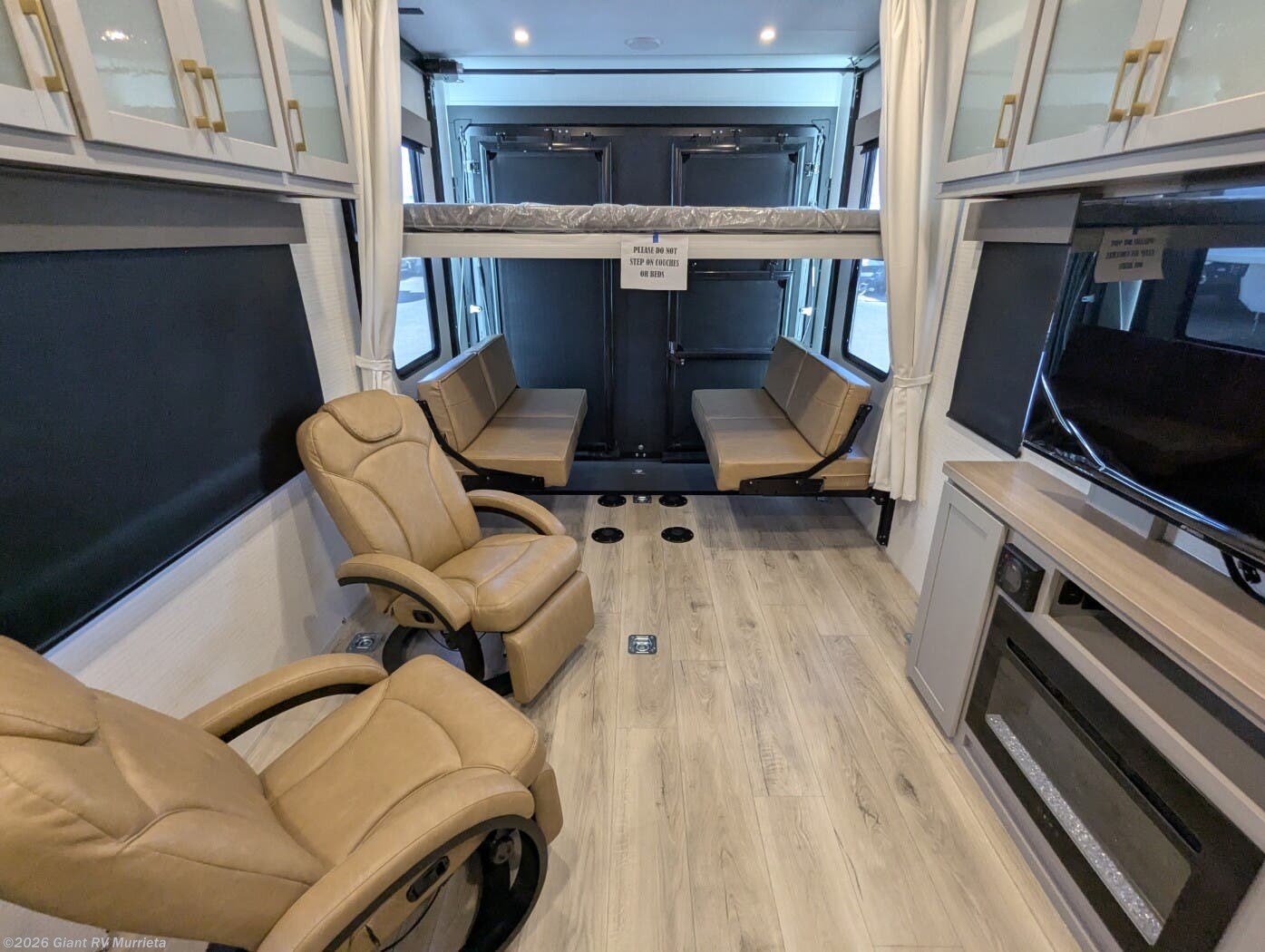 Open Kitchen & Living Area with solid-surface countertops, residential-style appliances, a dinette or sofa setup, and flexible sleeping options in the rear garage when needed.