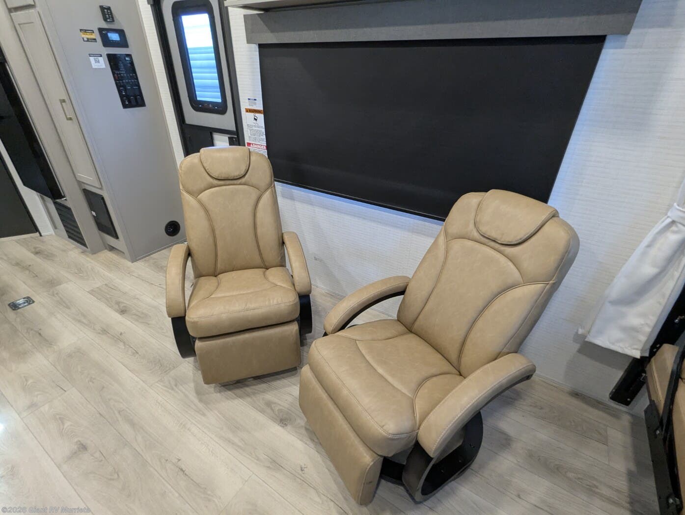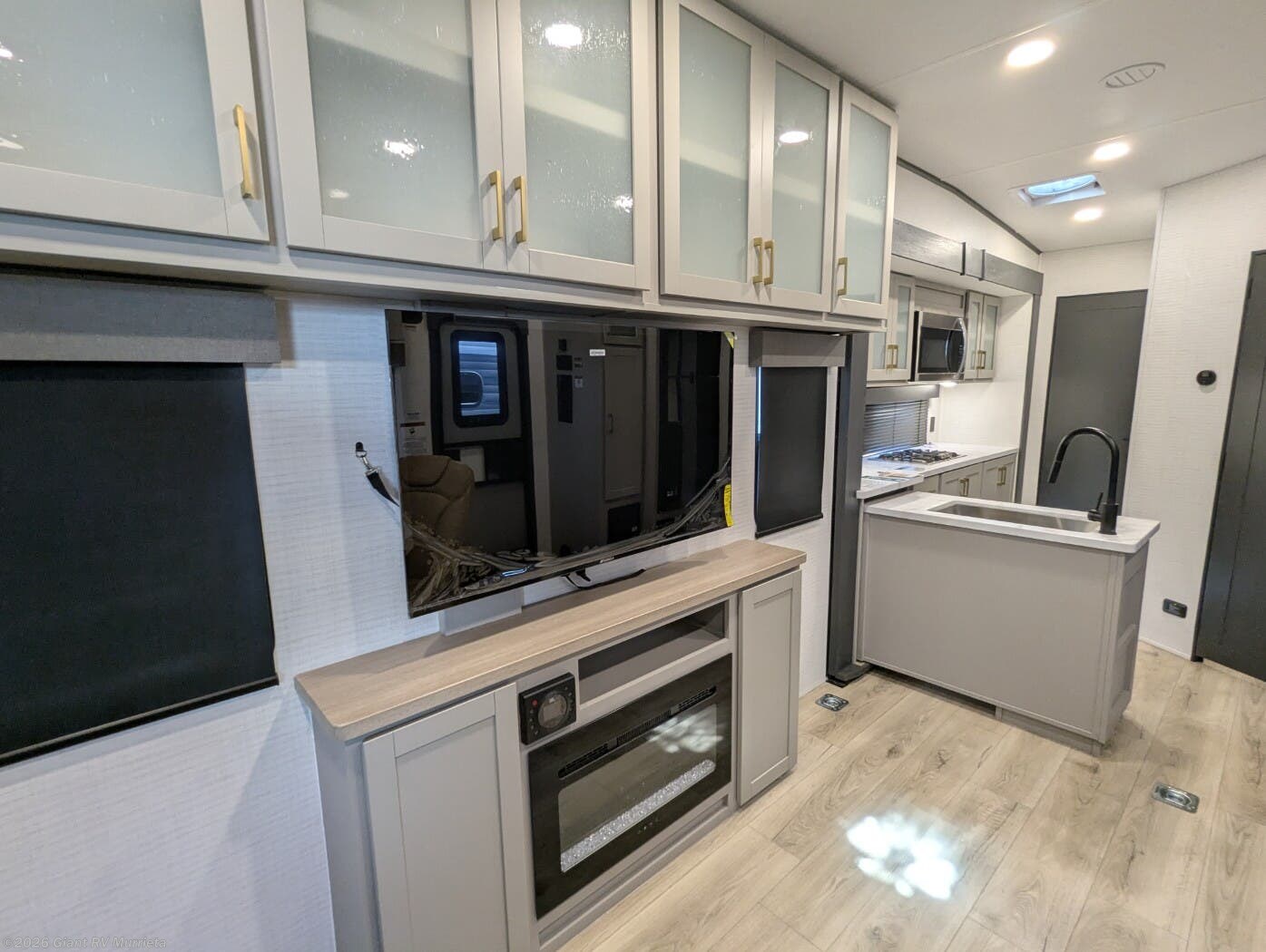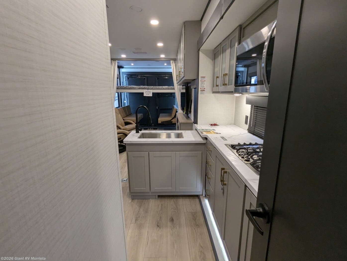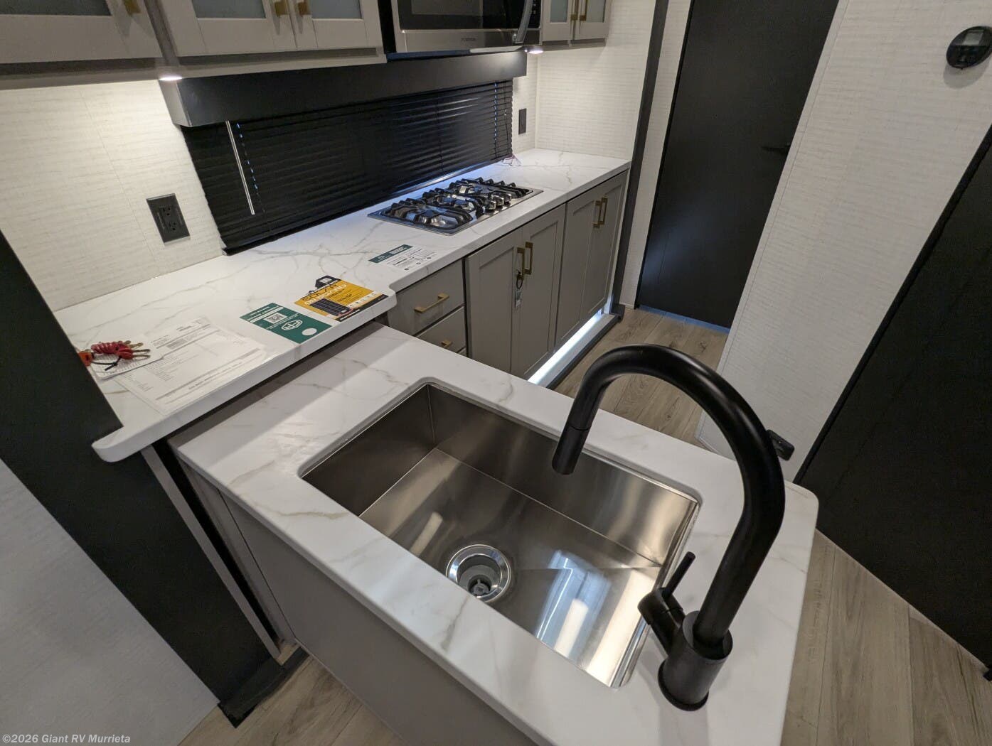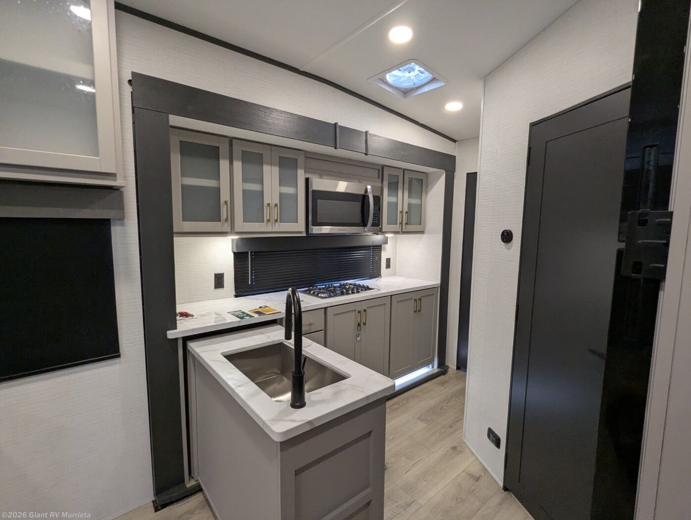 Open Kitchen & Living Area with solid-surface countertops, residential-style appliances, a dinette or sofa setup, and flexible sleeping options in the rear garage when needed.