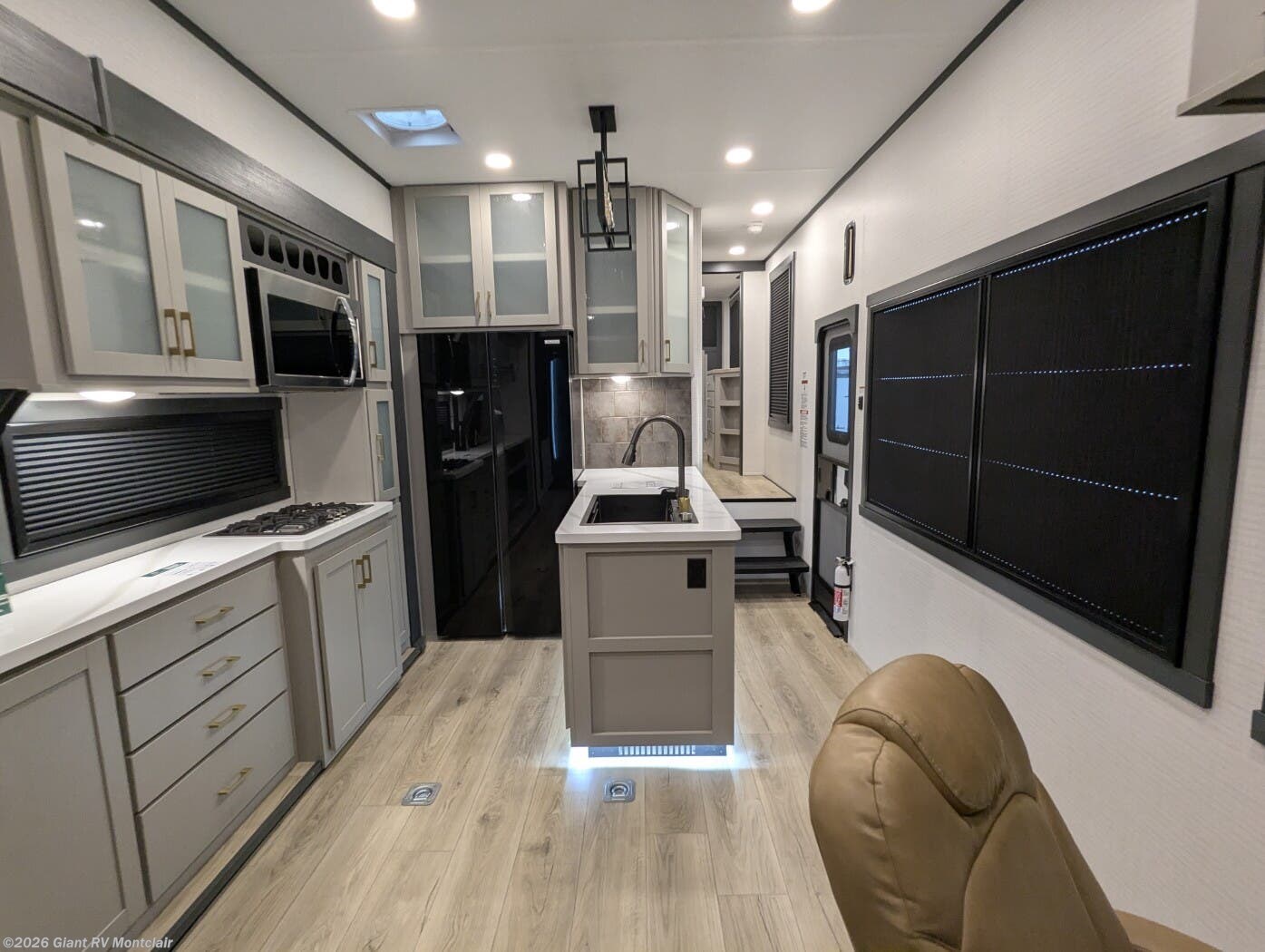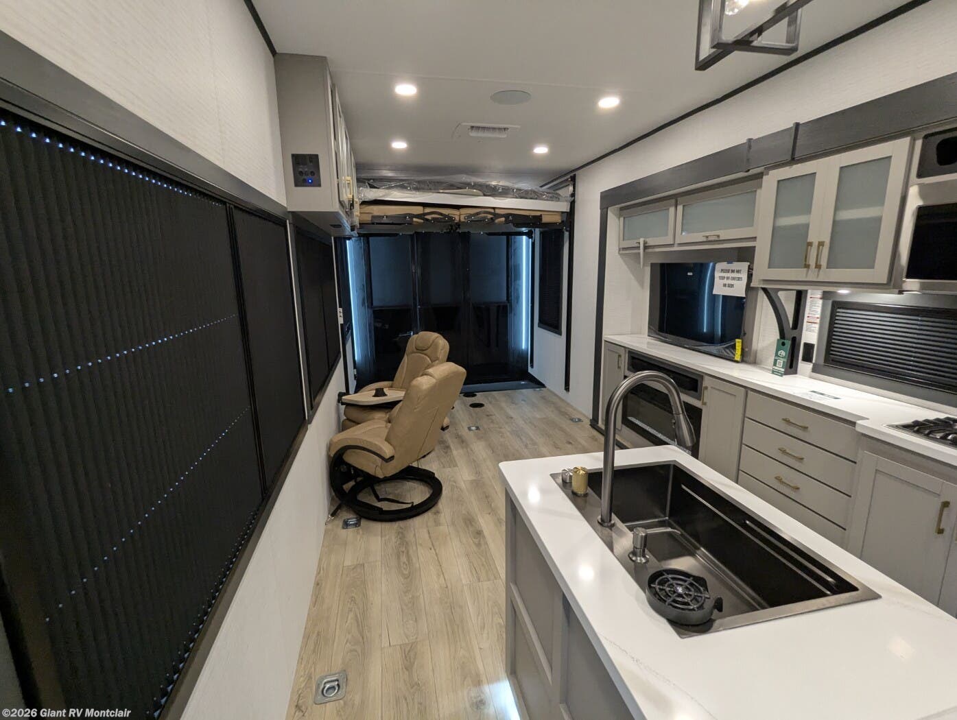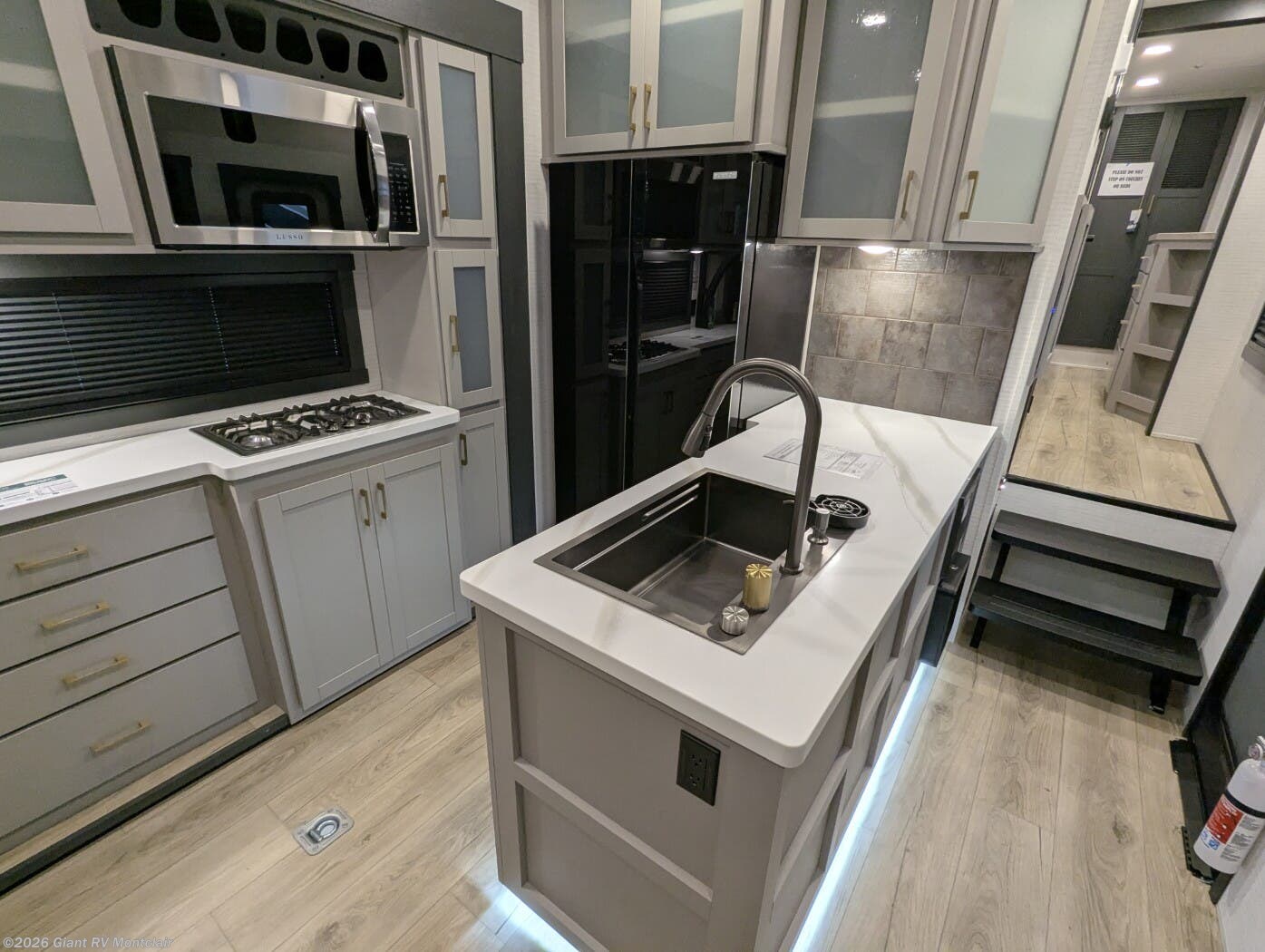 - Open Kitchen & Living Area offering solid-surface countertops, residential-style appliances, a roomy dinette or sofa setup, and flexible sleeping options in the garage zone when needed.